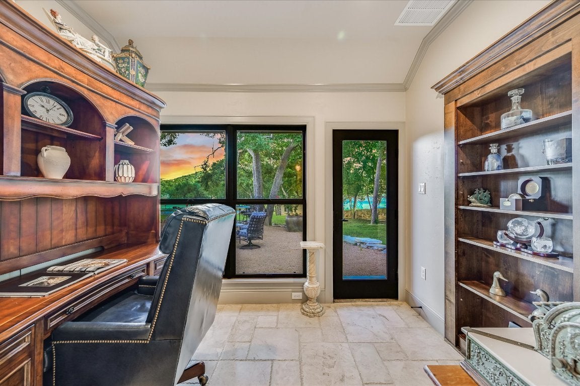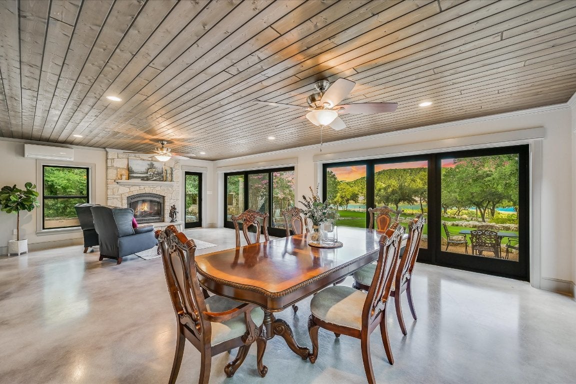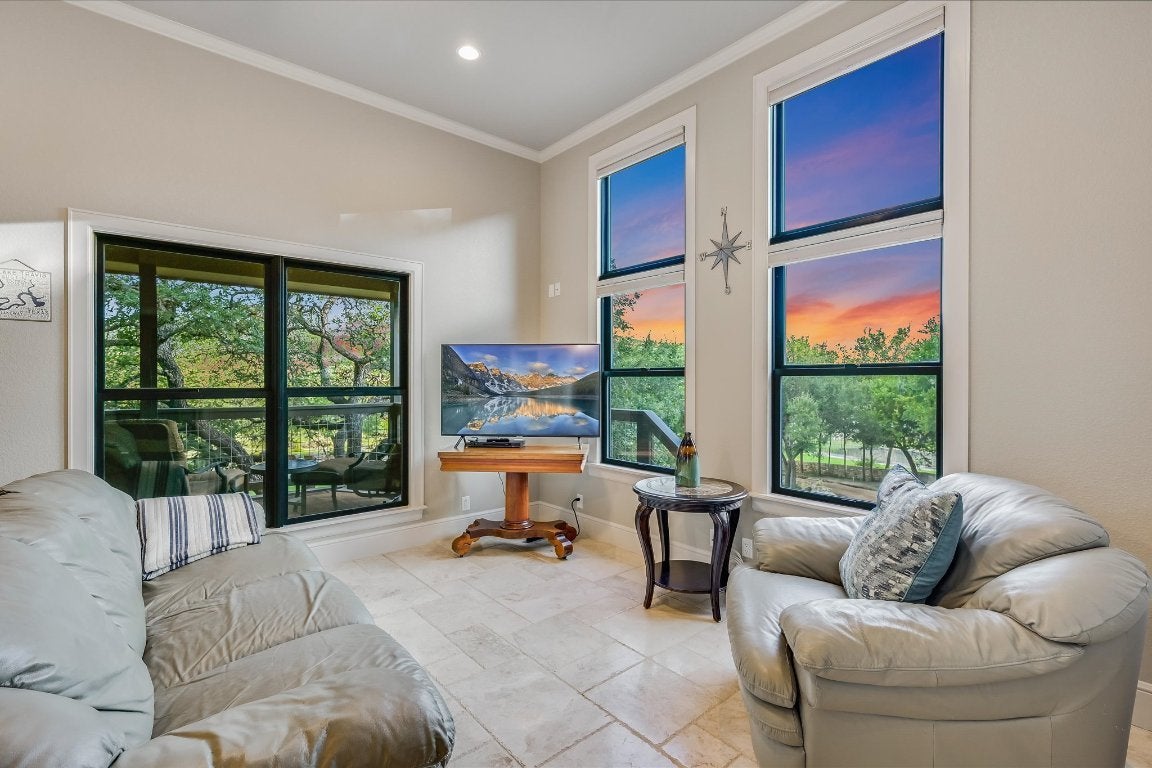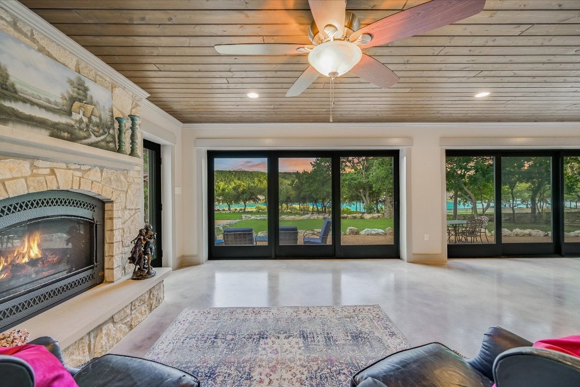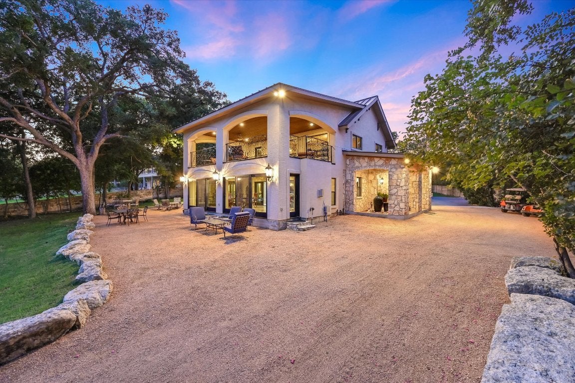 CONTACT AGENT #2: Josh/512-845-5423 for a showing or questions. A rare opportunity to acquire one of the most distinctive waterfront estates on Lake Travis. Set on 2.26 landscaped acres with a gradual slope to deep water and 222 feet of private shoreline, this multi-structure compound was designed for generational living, elevated entertaining, and lasting legacy. The primary residence spans 3,387 square feet (3 bedrooms, 2.1 bathrooms) and features refined Hill Country architecture, expansive window walls, and seamless transitions between indoor and outdoor living spaces. Views stretch across the lake from nearly every vantage point, with upper balconies and covered patios positioned to capture morning light and sunset color. In addition to the main home, the property includes two 724 sf guest houses, both with full kitchens (4 bedrooms, 2 full baths), a 238 sf casita with kitchenette (1 bed, 1 full bathroom), and a 225 sf studio/salon — each thoughtfully sited and privately accessed. Whether hosting extended family, providing long-term accommodations, or creating dedicated workspaces, the layout offers exceptional versatility with no compromise in design or privacy. As you enter through the beautiful stone and large privacy gate - the grounds are curated, not just maintained — mature oaks, manicured lawns, and native stone pathways lead to multiple gathering areas, including a firepit lounge and waterfront viewing decks. A short walk or golf cart drive to the private boat dock down the gradual slope to your private dock and covered boat slip with HydroHoist completes the experience. Don't miss this amazing opportunity to own one of the rarest properties on Lake Travis. With a enough yard space to add your own private pool/spa (rendering available) and driveway space to expand the garage to accommodate up to 4 car garage - this property is a true must see to believe. A true hidden oasis on Lake Travis!
