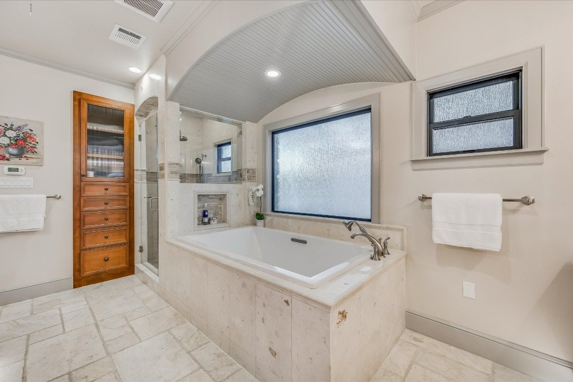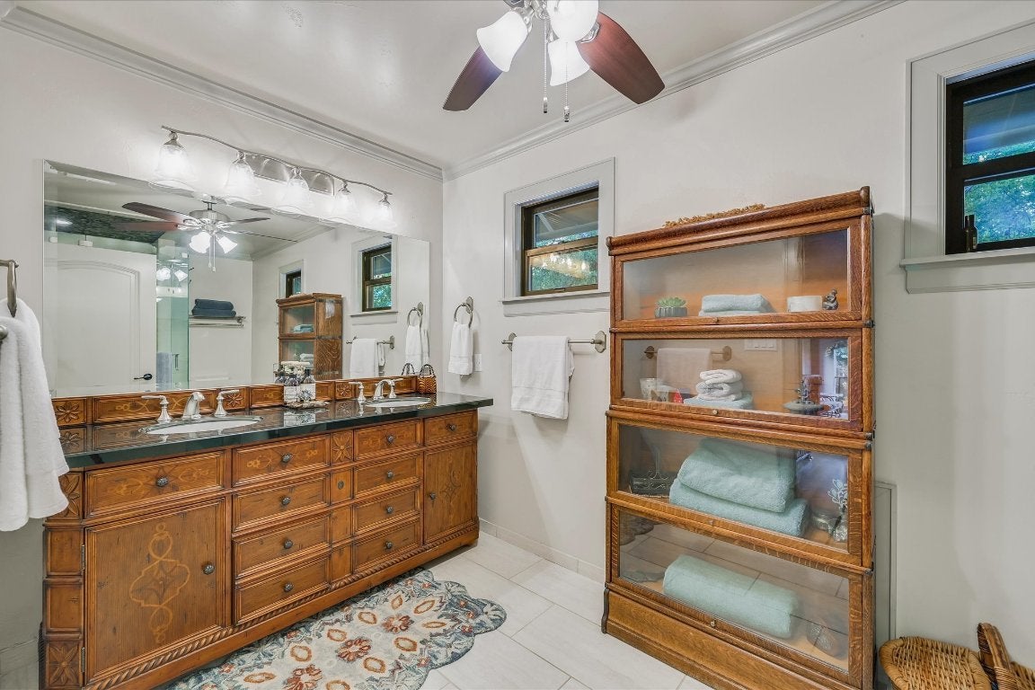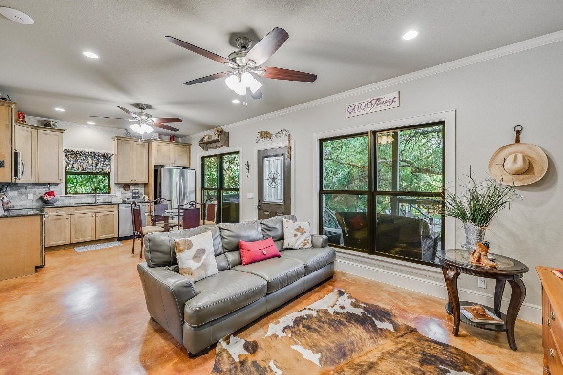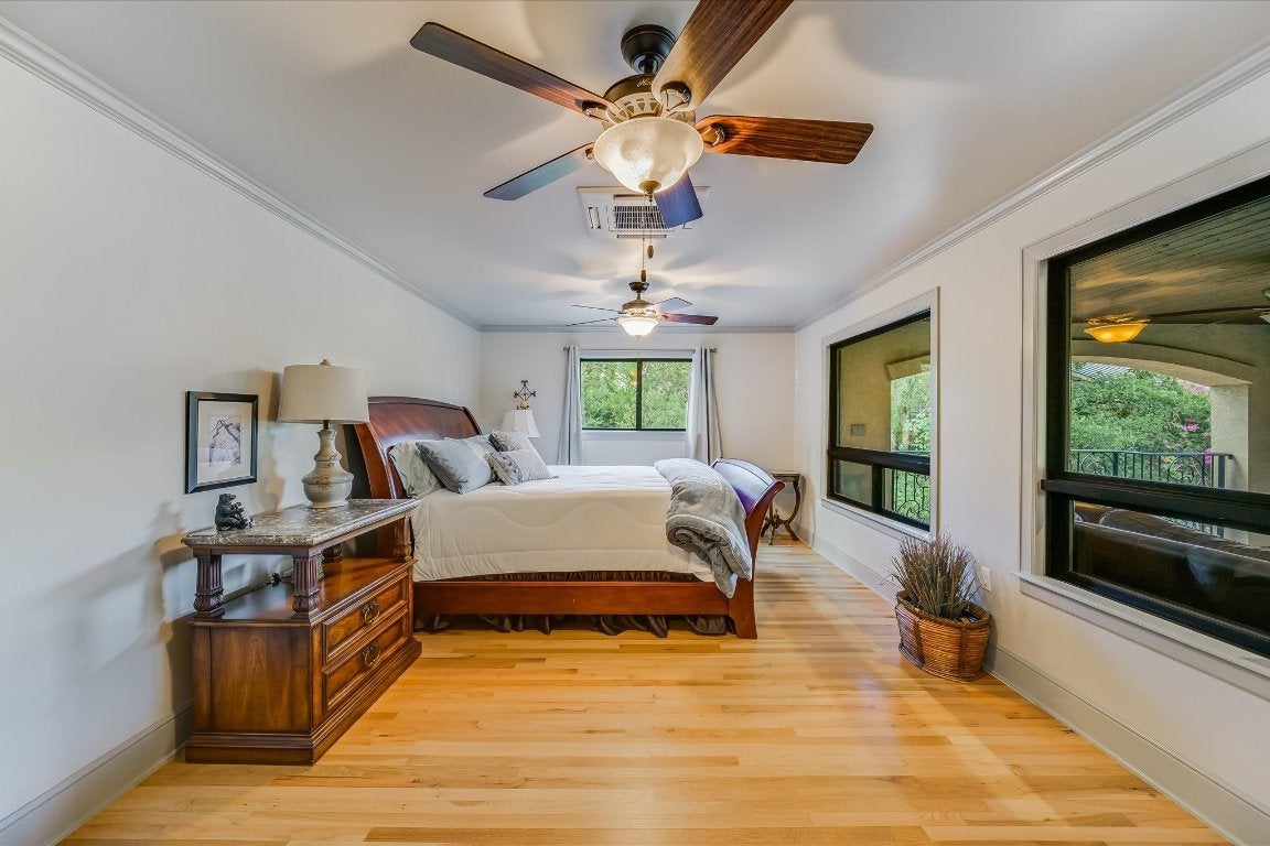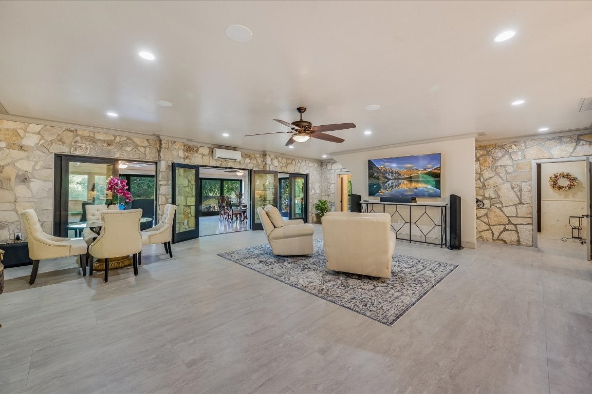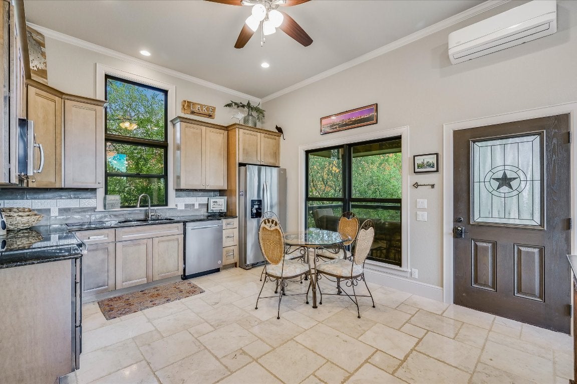 CONTACT AGENT #2: Josh/512-845-5423 for a showing or questions. A rare opportunity to acquire one of the most distinctive waterfront estates on Lake Travis. Set on 2.26 landscaped acres with a gradual slope to deep water and 222 feet of private shoreline, this multi-structure compound was designed for generational living, elevated entertaining, and lasting legacy. The primary residence spans 3,387 square feet (3 bedrooms, 2.1 bathrooms) and features refined Hill Country architecture, expansive window walls, and seamless transitions between indoor and outdoor living spaces. Views stretch across the lake from nearly every vantage point, with upper balconies and covered patios positioned to capture morning light and sunset color. In addition to the main home, the property includes two 724 sf guest houses, both with full kitchens (4 bedrooms, 2 full baths), a 238 sf casita with kitchenette (1 bed, 1 full bathroom), and a 225 sf studio/salon — each thoughtfully sited and privately accessed. Whether hosting extended family, providing long-term accommodations, or creating dedicated workspaces, the layout offers exceptional versatility with no compromise in design or privacy. As you enter through the beautiful stone and large privacy gate - the grounds are curated, not just maintained — mature oaks, manicured lawns, and native stone pathways lead to multiple gathering areas, including a firepit lounge and waterfront viewing decks. A short walk or golf cart drive to the private boat dock down the gradual slope to your private dock and covered boat slip with HydroHoist completes the experience. Don't miss this amazing opportunity to own one of the rarest properties on Lake Travis. With a enough yard space to add your own private pool/spa (rendering available) and driveway space to expand the garage to accommodate up to 4 car garage - this property is a true must see to believe. A true hidden oasis on Lake Travis!