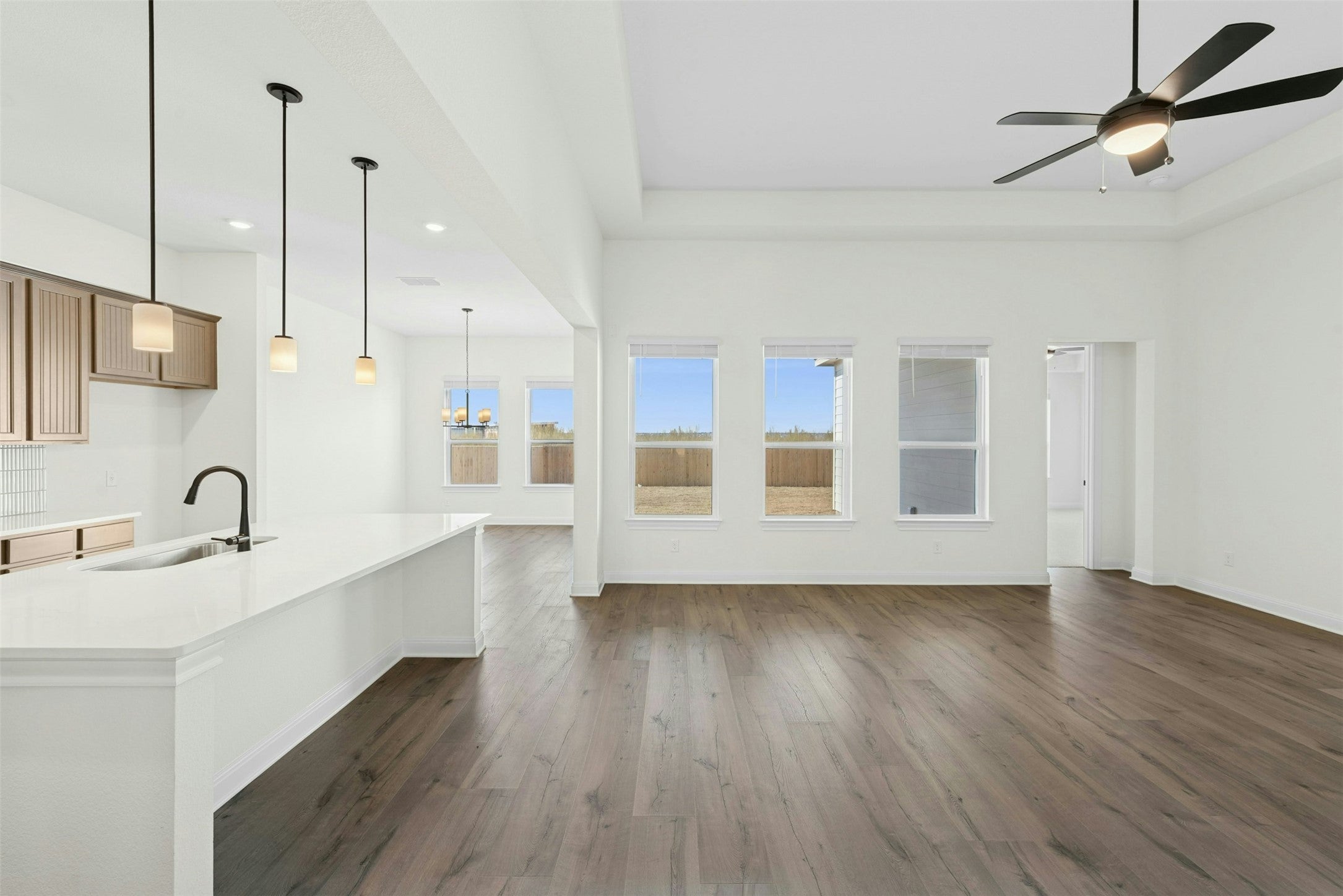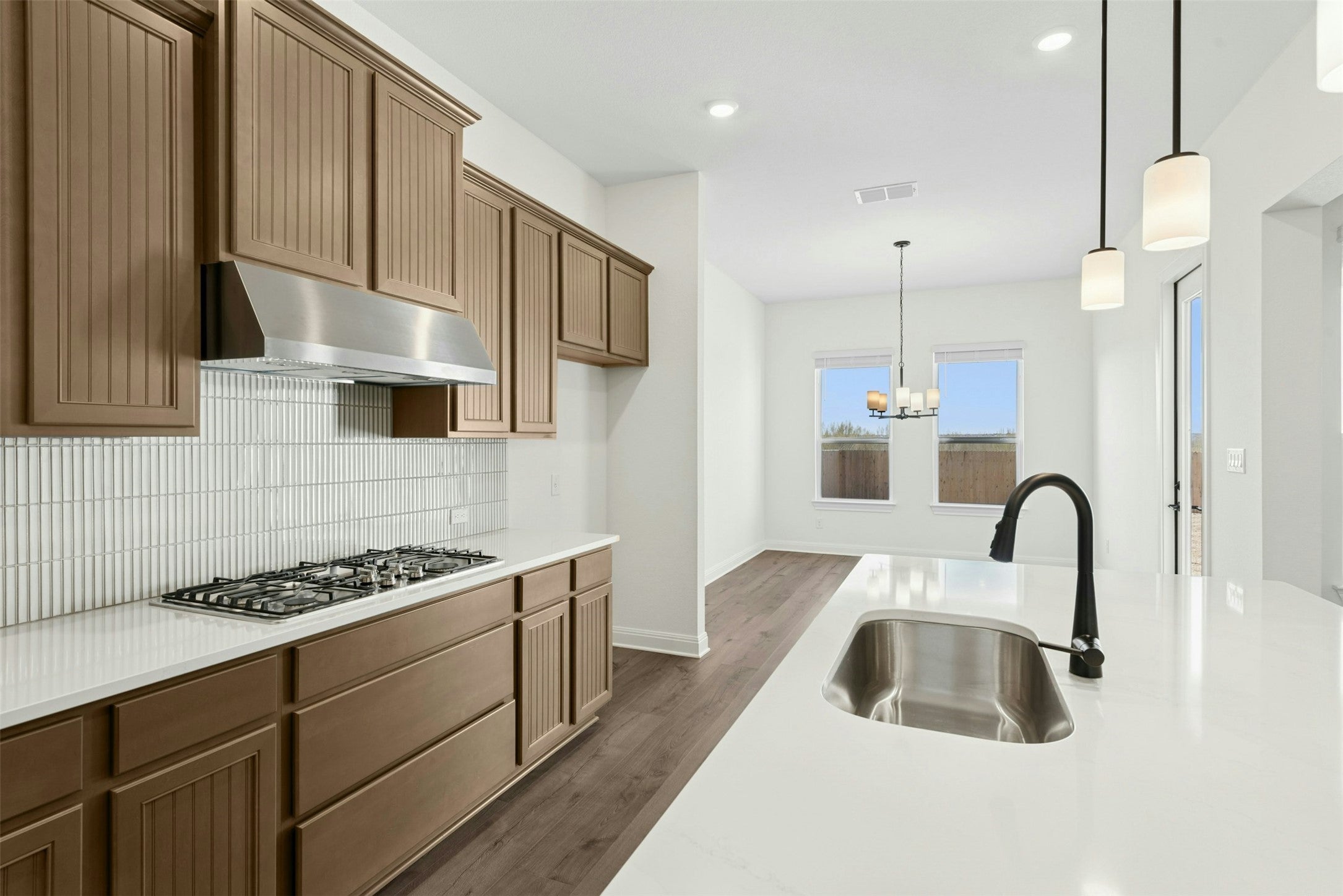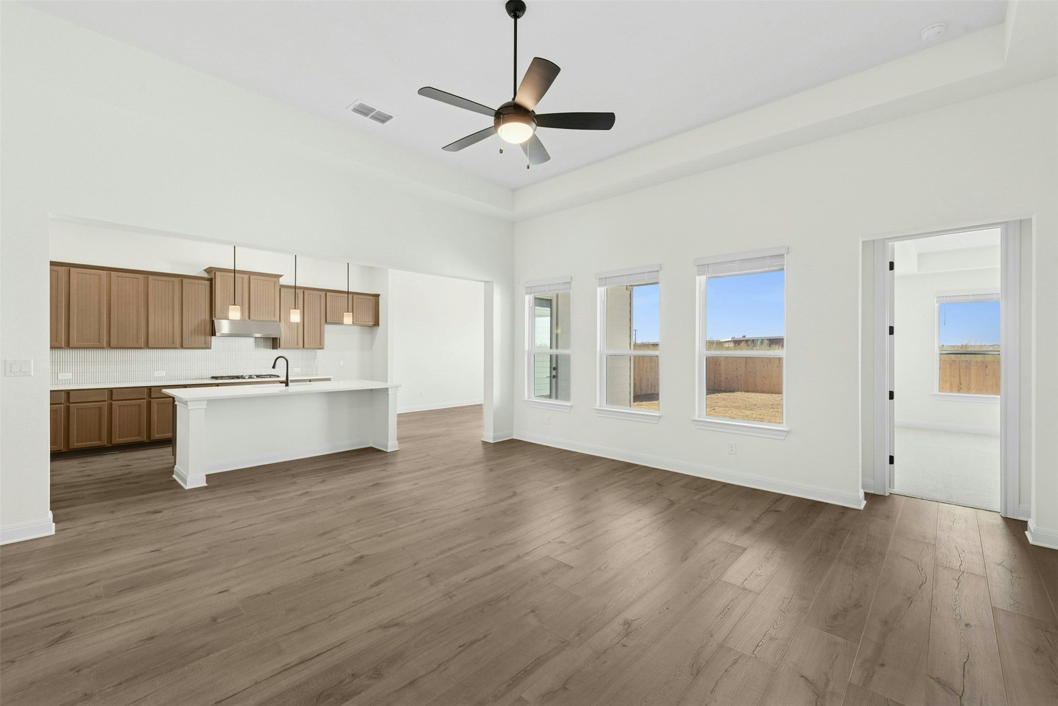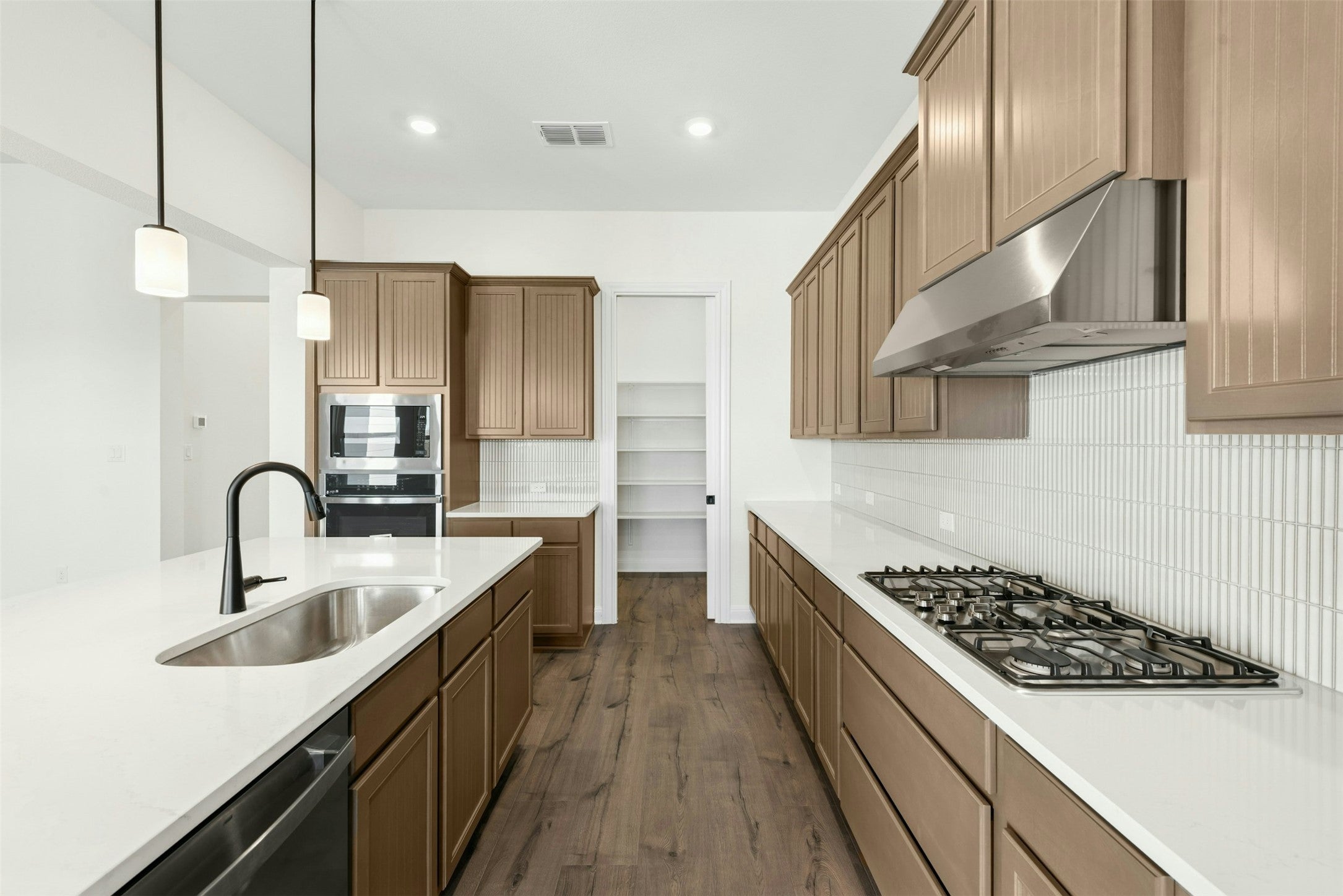 Welcome to 19605 Helens Catch in The Grove at Blackhawk, a beautifully designed new build by Caledonia Builders known for quality craftsmanship and thoughtful attention to detail. This spacious home offers four bedrooms, four full bathrooms, and a massive upstairs bonus room large enough to function as a fifth bedroom, media space, or private retreat. The open layout features 10 foot ceilings throughout and wood look tile flooring in the main areas, creating a bright and inviting flow. The kitchen is a standout with quartz countertops, GE appliances, custom tile details, an undermount sink, and a giant walk in pantry that provides exceptional storage. The kitchen opens easily to the living and dining spaces, making it ideal for both everyday living and entertaining. The primary suite offers a relaxing retreat with a beautifully appointed bathroom and generous closet space. Secondary bedrooms each have access to a full bath, providing flexibility for guests or a growing household. A spacious laundry room and a convenient mud bench off the garage entry add to the home’s thoughtful design. Upstairs, the oversized bonus room provides endless possibilities for work, play, or additional sleeping space. Tankless gas water heaters and full sod and sprinkler system! Located in the sought after Blackhawk community, residents enjoy access to parks, trails, pools, and nearby dining, shopping, and top rated schools. With its modern finishes, functional layout, and Caledonia quality, 19605 Helens Catch is an exceptional opportunity in one of Pflugerville’s most desirable neighborhoods.
