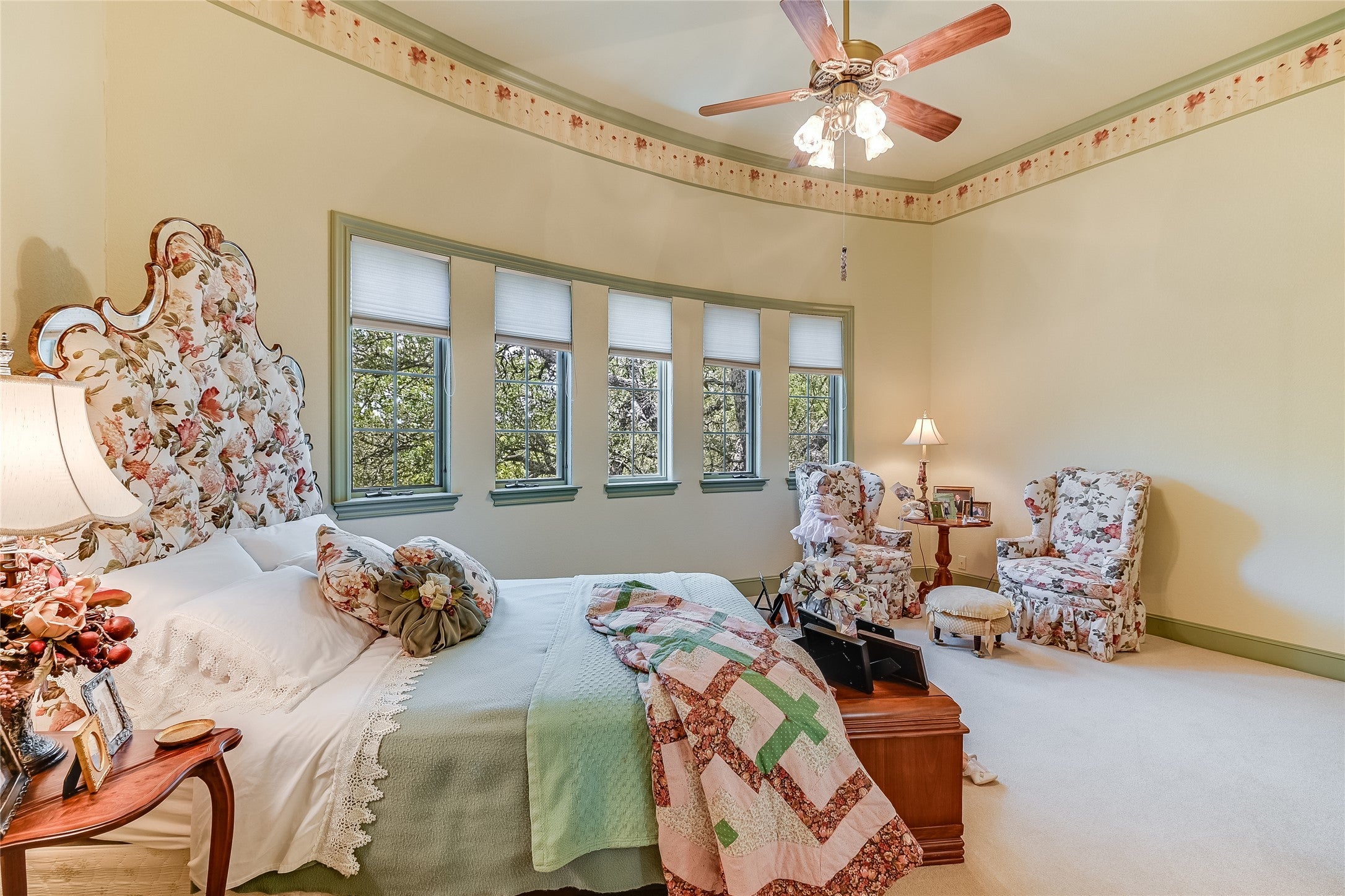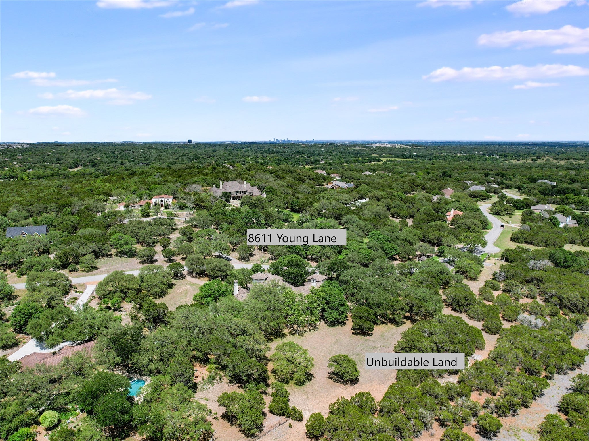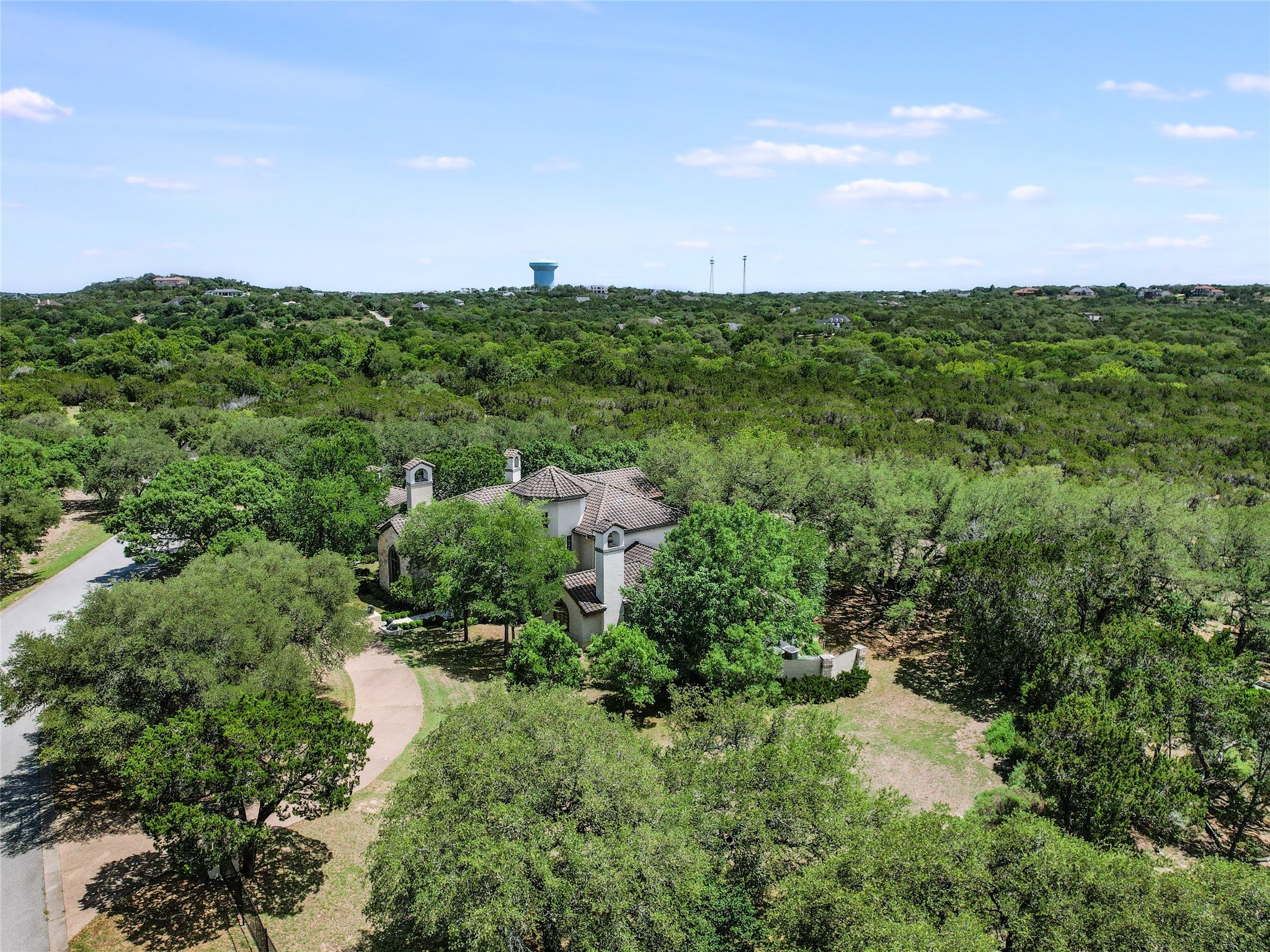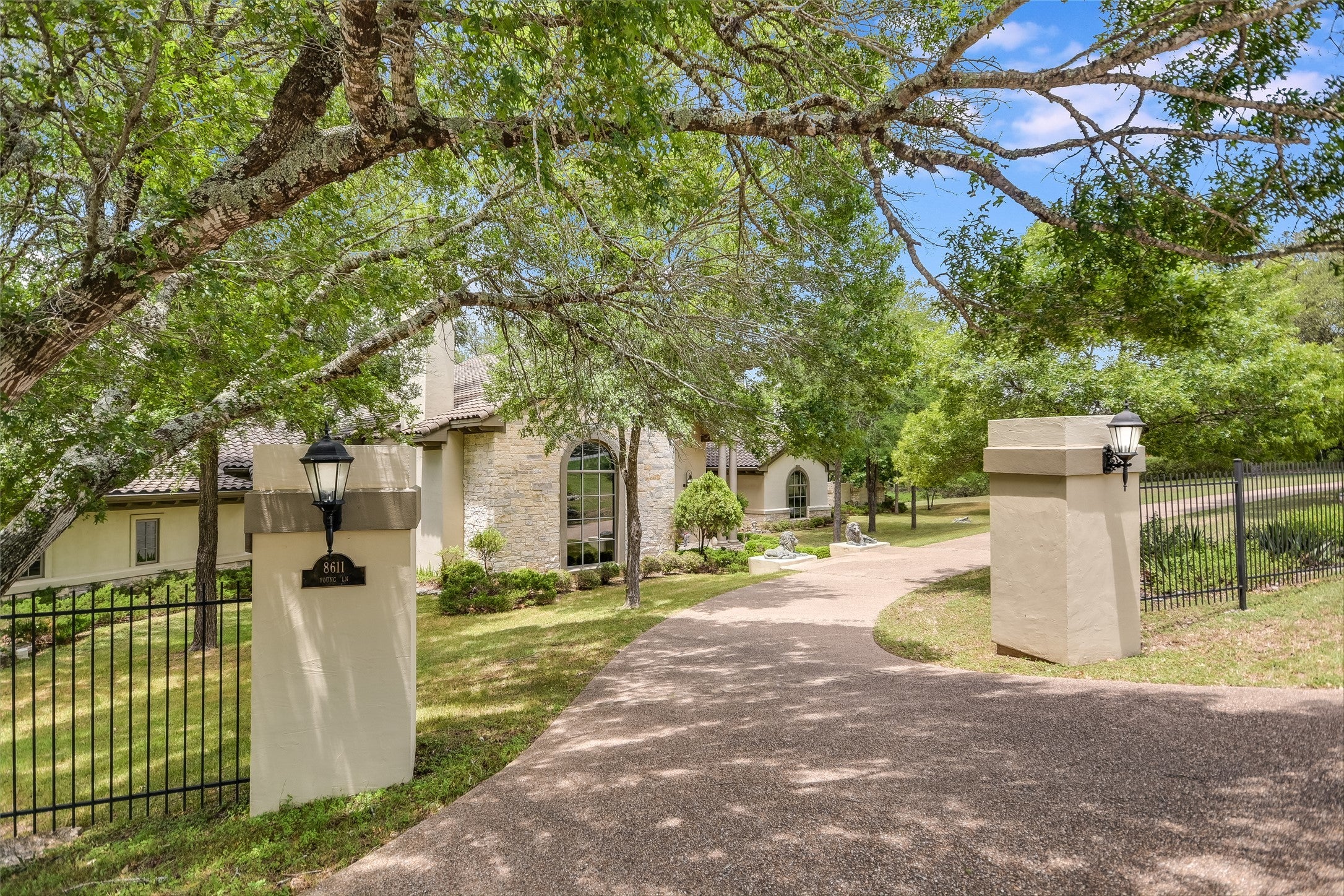 This generously sized custom home is situated on 2 acres in coveted Estates of Lewis Mountain, an exclusive gated community with 15 custom homes. Homes in the Estates of Lewis Mountain rarely come on the market. Young Lane ends in a quiet cul-de-sac, lightly traveled, peaceful serenity. The 2 acre homesite feels far more expansive as the south facing backyard extends to acres of privately owned, unbuildable land. Low tax rate (1.58), with quick access to downtown & the airport. This estate home is situated on a level homesite with over 100 trees, an emphasis on privacy and taking advantage of the hill country setting. Plenty of space for a pool and/or casita, very private. The home has exquisite finishes & spares no extravagance in the pursuit of fine living. A grand circular entry foyer presents soaring ceilings featuring a breathtaking elegant chandelier as the focal point. The sweeping staircase leads to a dramatic circular loggia upstairs. Two upstairs bedrooms with ensuite bathrooms overlook beautiful backyard trees. The Primary Suite has all the grandeur one could desire with separate His & Hers bathrooms and separate His & Hers closets. Her Bathroom features a massive soaking tub & expansive make-up/counter area. An adjoining Exercise Room with it’s own half bath could be used as a study nook, dressing room, endless possibilities. His Bathroom features a walk in shower & separate closet. Another room attached to the Primary Suite can be an additional sitting room or nursery with wood burning fireplace. A separate wing includes a living/media room & office but can be used as a private guest wing with a separate entrance & parking. A warm Family Room opens to a gourmet Kitchen with a beautiful brick wall and kitchen bar detail. There is also a small wine room. The home features antique oak hardwoods, marble flooring and extensive custom moldings. Too many beautiful architectural details to list here, one must view in person to experience.