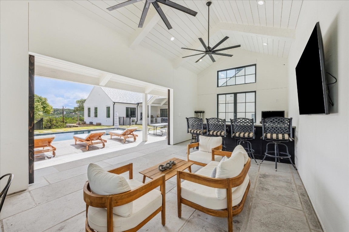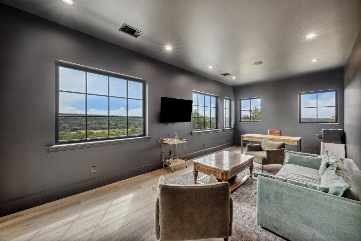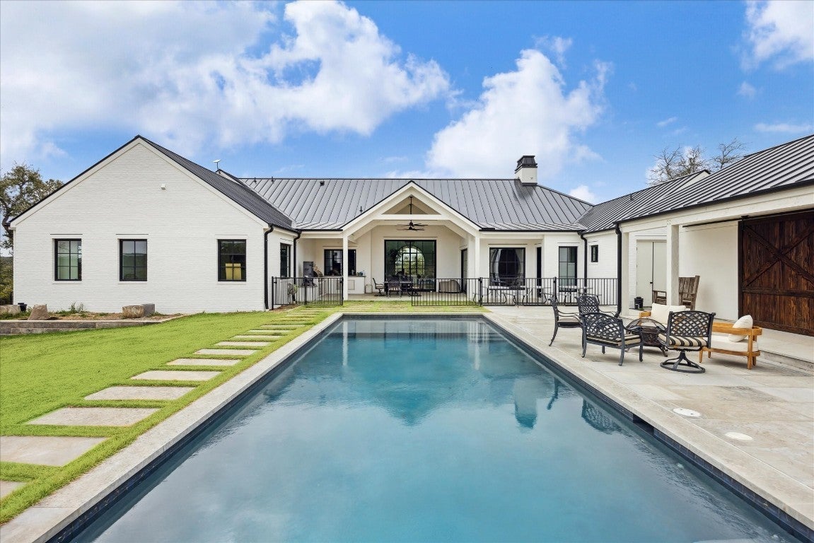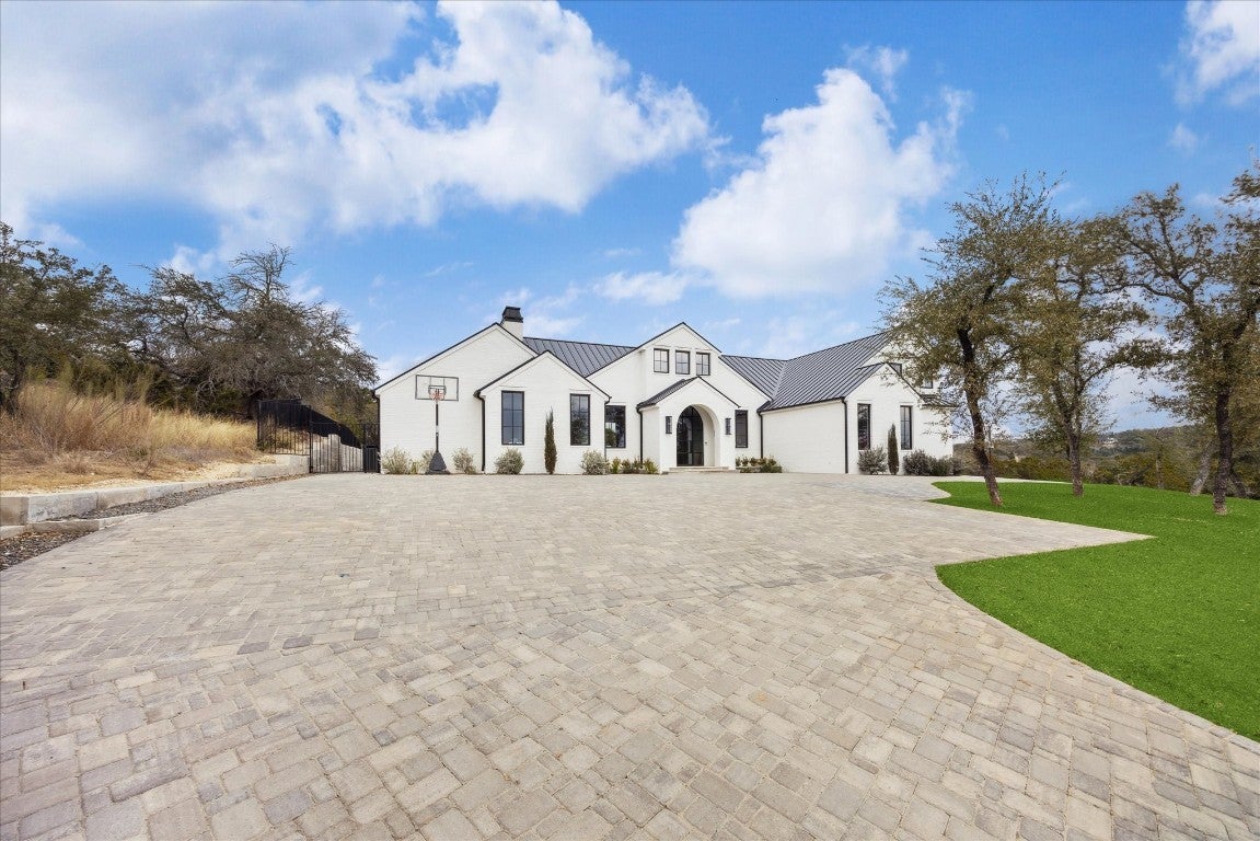 Nestled in the picturesque hills of Wimberley and perched on a knoll with panoramic views spanning over 2.6 acres, this luxurious 4,798 square foot custom residence offers an unparalleled blend of sophistication and comfort. The impressive entryway leads to an open floor plan adorned with vaulted ceilings and custom lighting fixtures. The spacious living areas feature arched details and natural stone accents. Wide hallways ensure a seamless flow throughout the home. The spacious family room and dining area have a decorative wood burning fireplace, and an adjacent media room which is perfect for larger gatherings as well as an office alcove. The entire area is open to the chef’s delight gourmet kitchen equipped with high-end appliances including an Italian ILVE range with six burners and a rectangular seventh burner, pot filler, Sub Zero refrigerator and freezer. There is a sizable center island with seating for six. A large pantry area offers an abundance of built-in storage. The primary suite privately located on one end of the home is a sanctuary, complete with vaulted ceilings, luxurious shower, double vanities, large walk-in closet with built-ins and beautiful finishes throughout. The laundry room offers a center island, hanging areas, sink and lots of counter space. The upstairs with beautiful views has a huge flex room which is ready for your plans for use and a large storage room. A conveniently located mud room with built-in storage is adjacent to the attached 3 car garage with workshop. The expansive covered patio and outdoor kitchen overlook a heated pool with baja bench and large sunning area, complemented by a pool house with wet bar, refrigerator and ice maker. Additional amenities include built-in speakers, water filtration system, two tankless water heaters, dual zoned HVAC, a 30,000-gallon rainwater cistern, private well, and ample parking with a cobblestone circular driveway. The charming town of Wimberley and all it has to offer is close by!