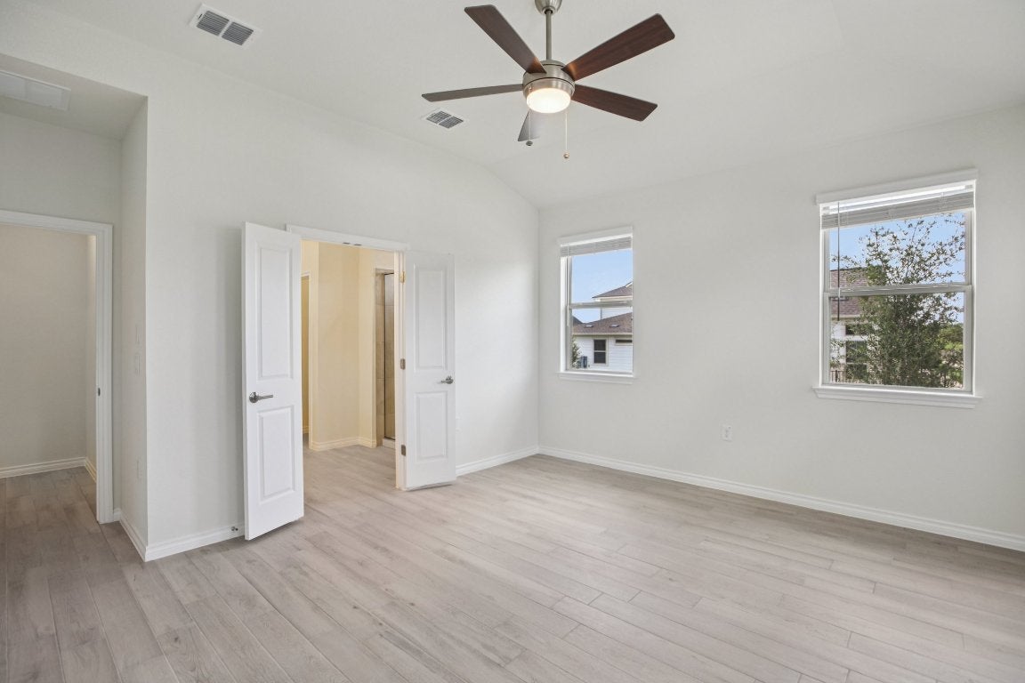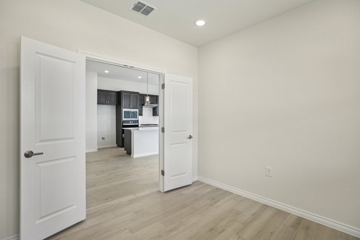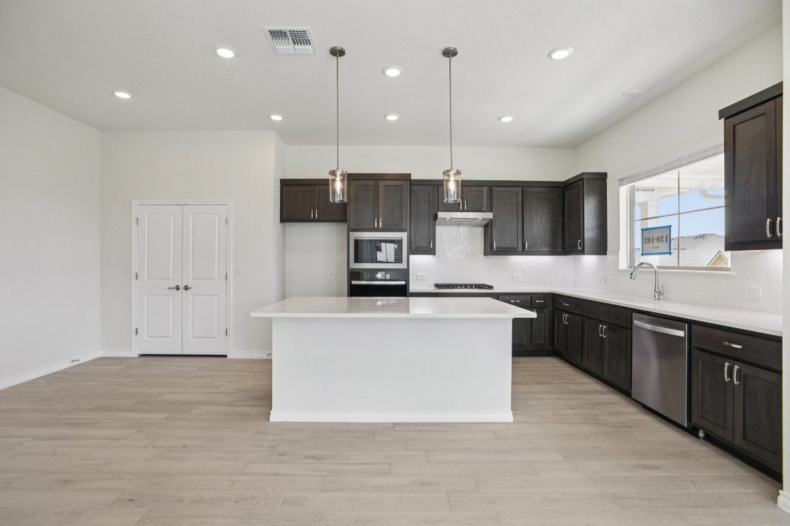Evia plan with upgraded kitchen, quartz countertops, upgraded tile flooring, optional study with double doors, Express cordless blinds
