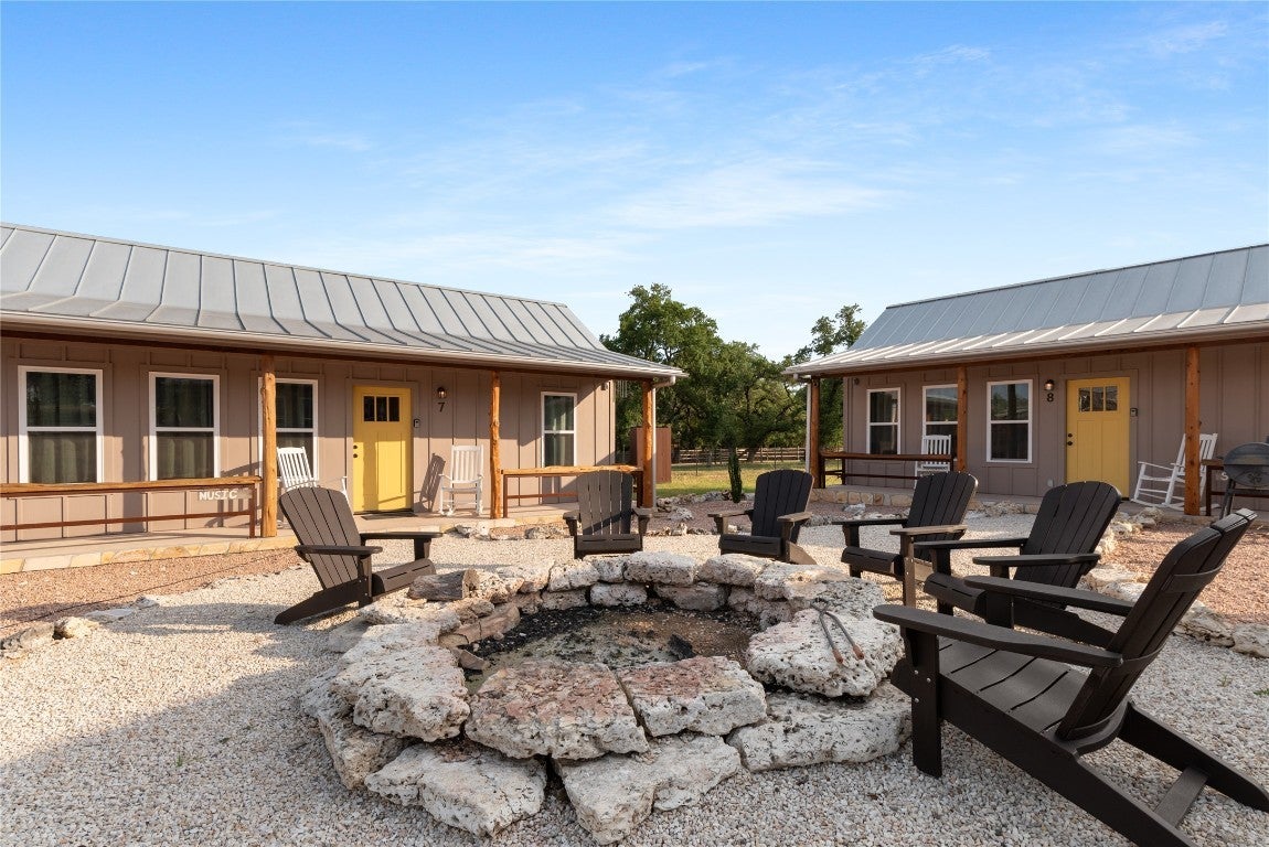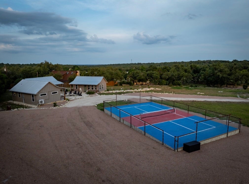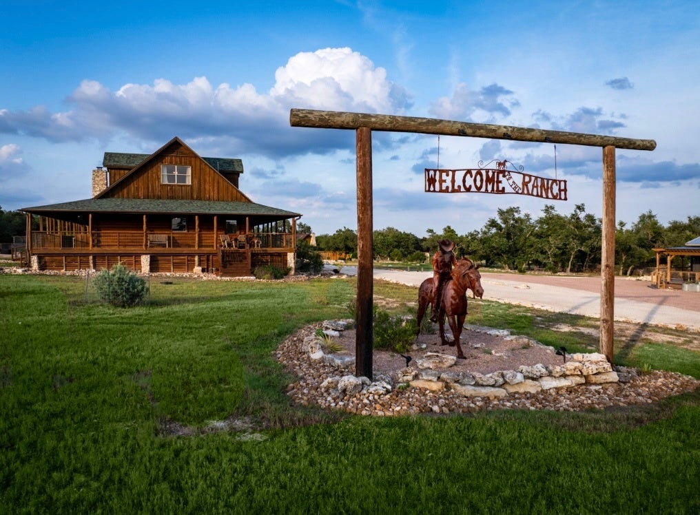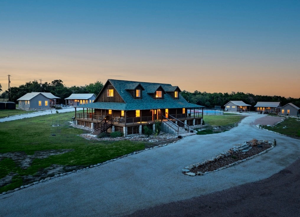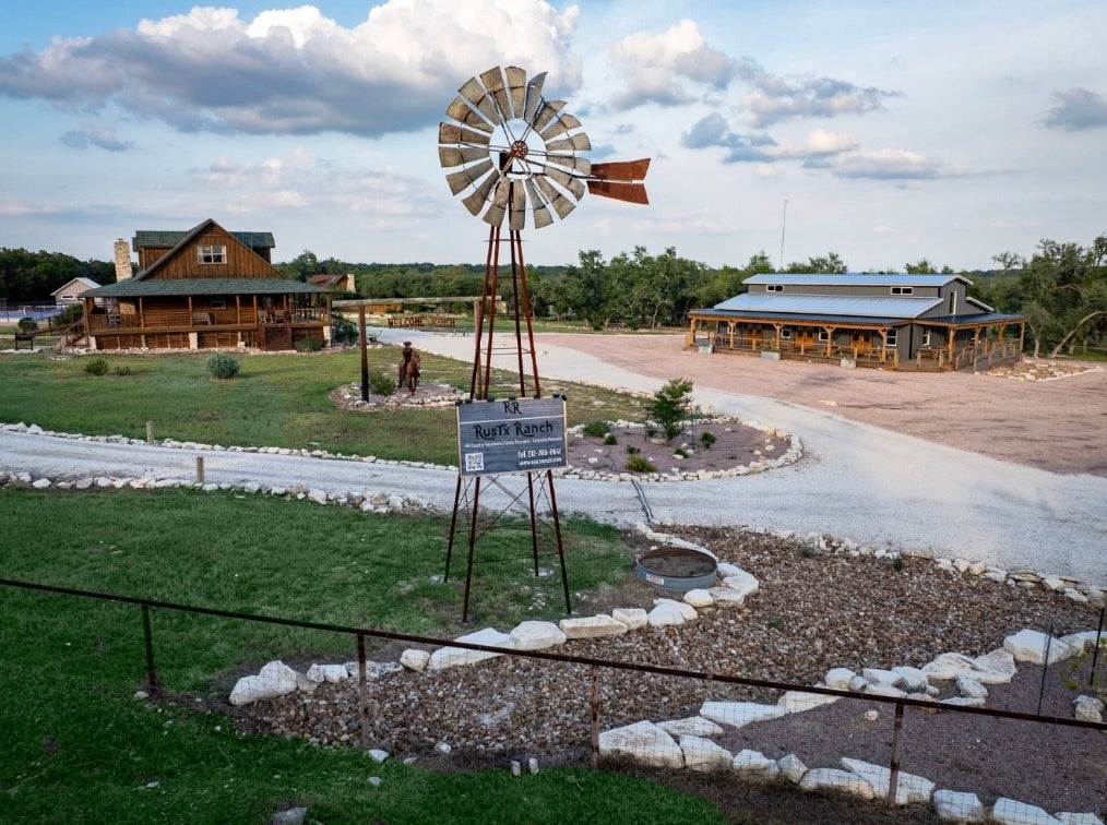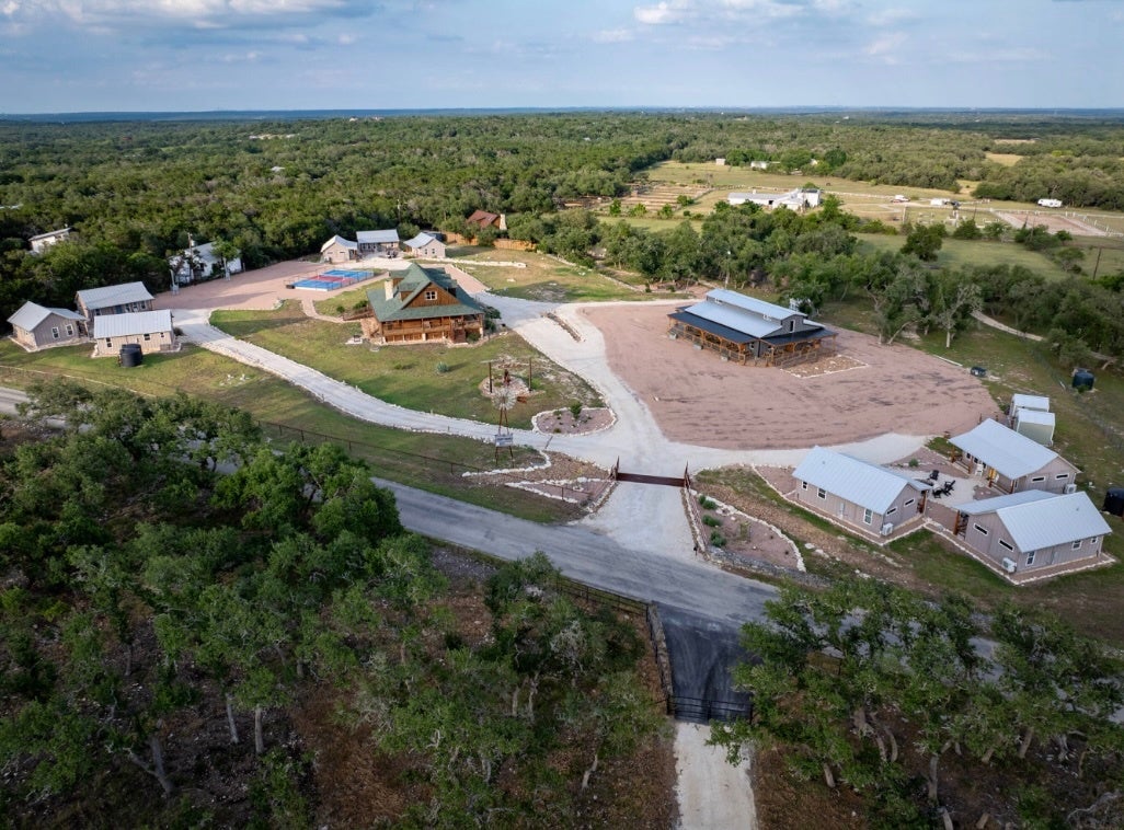 Rustx Ranch is a meticulously crafted estate situated on approximately 4.58 acres in the scenic Texas Hill Country. The main residence is a 3-bedroom, 2.5-bath log home constructed in 2001 using aromatic mountain cedar and Engelmann spruce logs. It features vaulted ceilings, a dry-stack fireplace by Lupe Cisneros, hand-rubbed pecan cabinets, stainless steel countertops, and a gas cooktop. The home also boasts a wraparound porch, a screened back porch, and plenty of space for parking. The property includes apple, pear, peach, and fig trees, along with three grape arbors, enhancing its rustic charm . In addition to the main house, the estate offers nine uniquely themed 2-bedroom, 1-bath cottages, each approximately 561 sq. ft., completed in 2021. These cottages combine rustic aesthetics with modern comforts, providing privacy and tranquility for guests . At the heart of the property is "The Gathering Place," a 2,400 sq. ft. event center equipped with indoor and covered outdoor spaces, suitable for various events such as weddings, corporate retreats, and family reunions. A newly installed pickleball court adds a recreational feature for guests .
