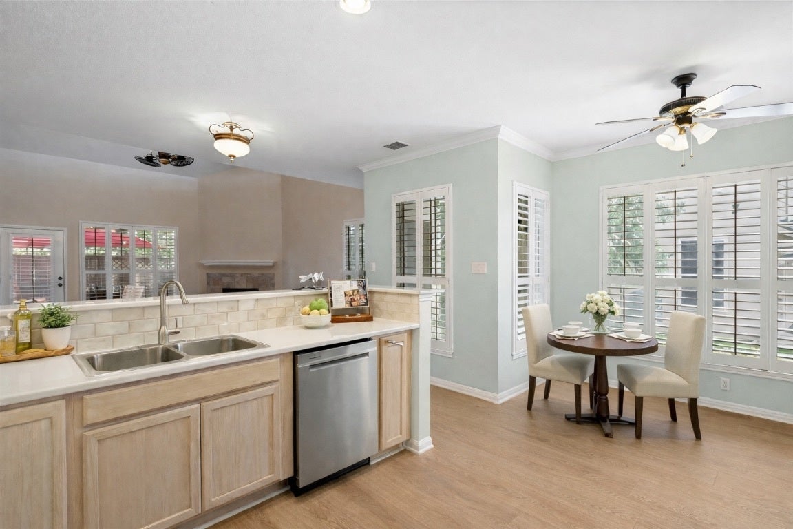 This welcoming four-bedroom, three-bathroom house offers approximately 2,313 square feet of living space. The home features a spacious layout with abundant natural light throughout. Luxury Vinyl Planking floors creates a warm and inviting atmosphere, while the spacious kitchen boasts ample cabinetry and stainless steel appliances. The primary bedroom is generously proportioned, and the neutral color palette provides a serene backdrop. The bathrooms are elegantly appointed with fixtures that offer both style and functionality. Ample vanity space and bright, abundant lighting create a spa-like feel. The covered patio and spacious deck provide opportunities for outdoor living, complemented by well-maintained landscaping. The home also offers a two-car garage and is situated in a desirable location with access to great schools. HOA pays for water!
