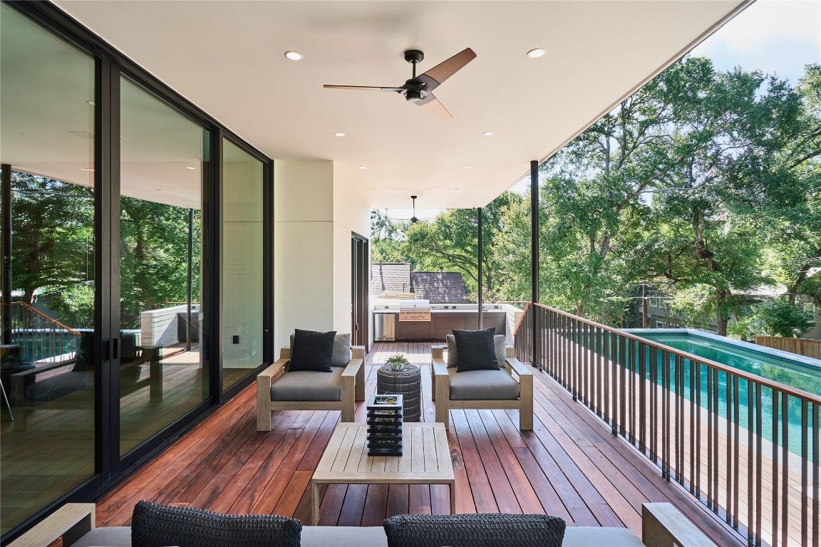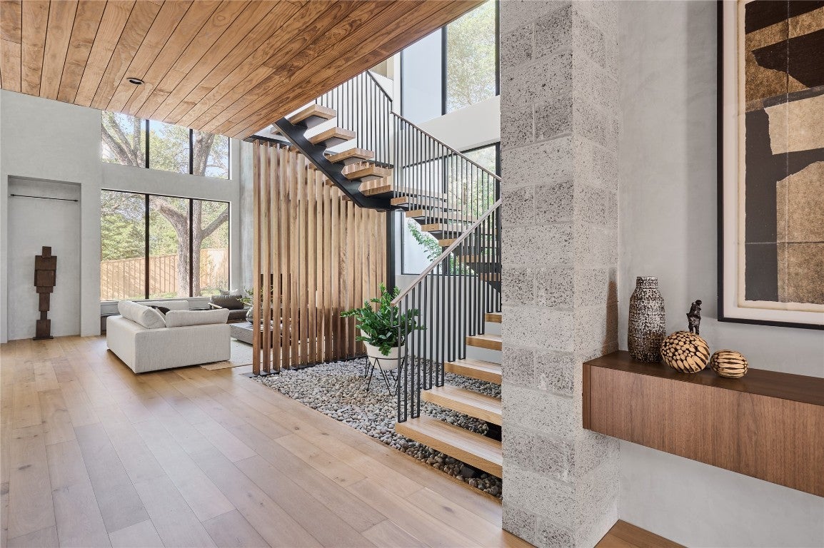 LOCATION LOCATION LOCATIN!!! Looking for a high-quality build that stands above the rest on the market? You found it!!! Designed by award-winning architect Davey Mceathron, this stunning home seamlessly blends tasteful outdoor elements with indoor living spaces and textures that create a harmonious and inviting ambiance. Right in the heart of Barton Hills, Austin's most sought-after neighborhood, you'll find every detail has been meticulously curated, from the hand-selected white oak hardwood floors to the designer light fixtures, custom millwork, and sophisticated hardware. The chef's kitchen features high-end stainless steel Thermador appliances, walnut-stained euro frameless flat panel-soft close cabinets, complete with double ovens, a 7-burner gas stove, and exquisite black coppe quartz countertops. The expansive master suite is a sanctuary of comfort, a spa-like ensuite bathroom featuring beautiful, tumbled lava black pebble tile, a soaking tub, dual vanities, a rainfall dual shower, and a generous walk-in closet. Enjoy ample natural light through floor-to-ceiling, windows, and doors. Outside, entertain in style with a private pool, hot tub, and outdoor kitchen space, complete with a grill, refrigerator, and sink. The second-floor private space is perfect for hosting events or relaxing. This is a prime location with proximity to Barton Creek Greenbelt Trail, Zilker Park, and South Lamar Blvd. Minutes away from downtown Austin, top-rated restaurants & schools, coffee shops, gyms, and shopping at Sprouts, Target, and Asahi Imports Japanese Grocery store. Experience unparalleled convenience and elegance in this extraordinary home.