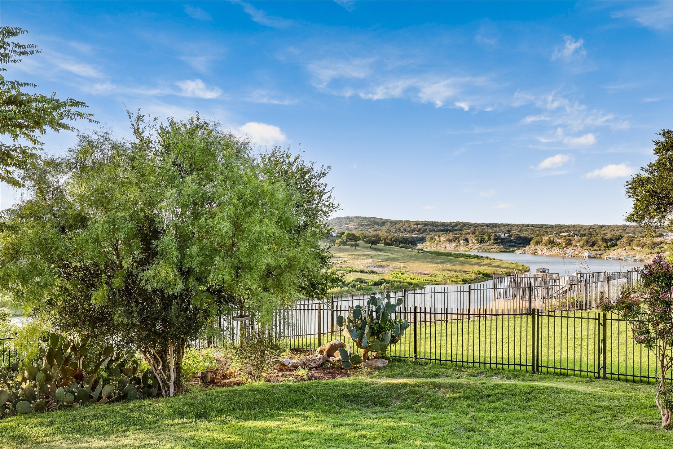 Lakefront Serenity Meets Hill Country Elegance in Gated Chimney Oaks Welcome to your private oasis in Chimney Oaks, a premier gated community on the North Shore of Lake Travis, nestled between Austin and Marble Falls. With a deep respect for the environment, neighbors, and community, Chimney Oaks offers the perfect blend of nature, security, and refined living. The link for Chimney Oaks HOA is in the transaction documents. This Lake Travis waterfront estate is a single-story stunner featuring panoramic hill country and lake views, a floating dock with deep water access, and a private tram to the shoreline for ultimate convenience. A winding driveway leads to your gated retreat, offering peace, privacy, and space to roam. Inside, you’ll find a sprawling open layout filled with natural light, soaring ceilings, exposed wood beams, and elegant wood and tile flooring—no carpet throughout. The gourmet kitchen is a chef’s dream with ample space for entertaining. The oversized walk-in shower is wheelchair accessible, and every feature of the home emphasizes ease, comfort, and luxury. Additional highlights include: -Game room for fun and relaxation -Built-in bookshelves and architectural charm Cross-fenced property—ideal for pets or gardening -3-car garage plus room for RV/boat parking -Huge, usable yard space with room for a pool -New standing seam metal roof -Gated home within a gated community for double security -Rustic Hill Country styling in a true one-level home -Large back patio Located near the award-winning Flat Creek Winery, this home offers the rare opportunity to own a slice of tranquil luxury in one of Lake Travis' most sought-after communities. Live the lifestyle you've always imagined—quiet, connected, and just far enough away.