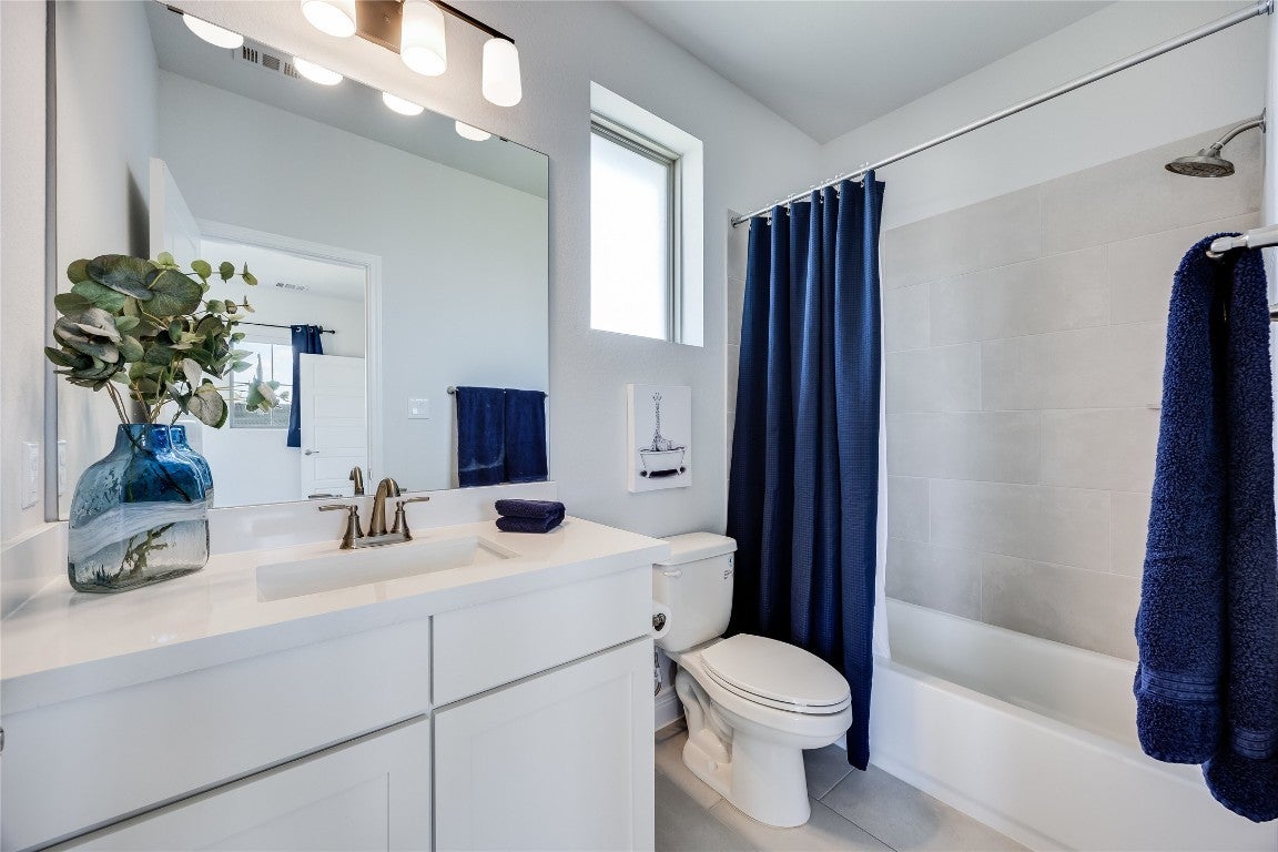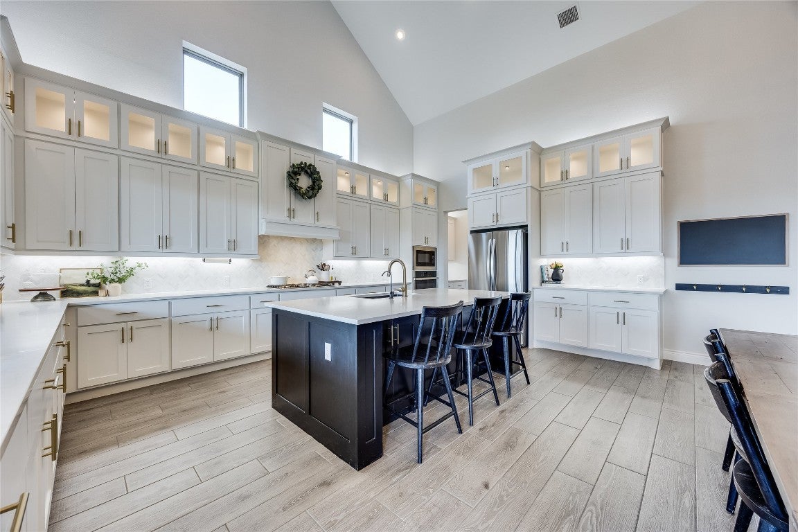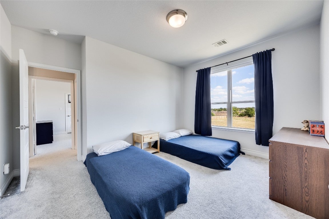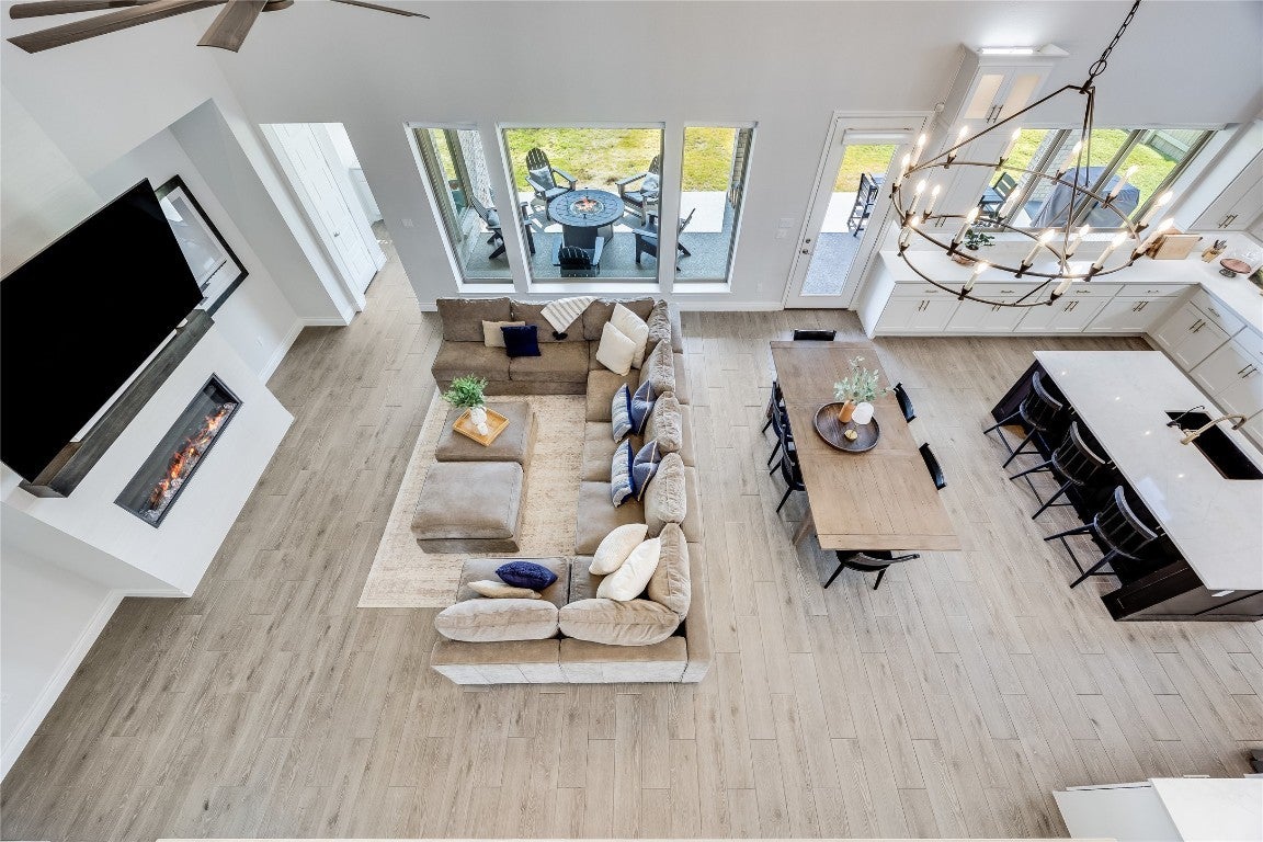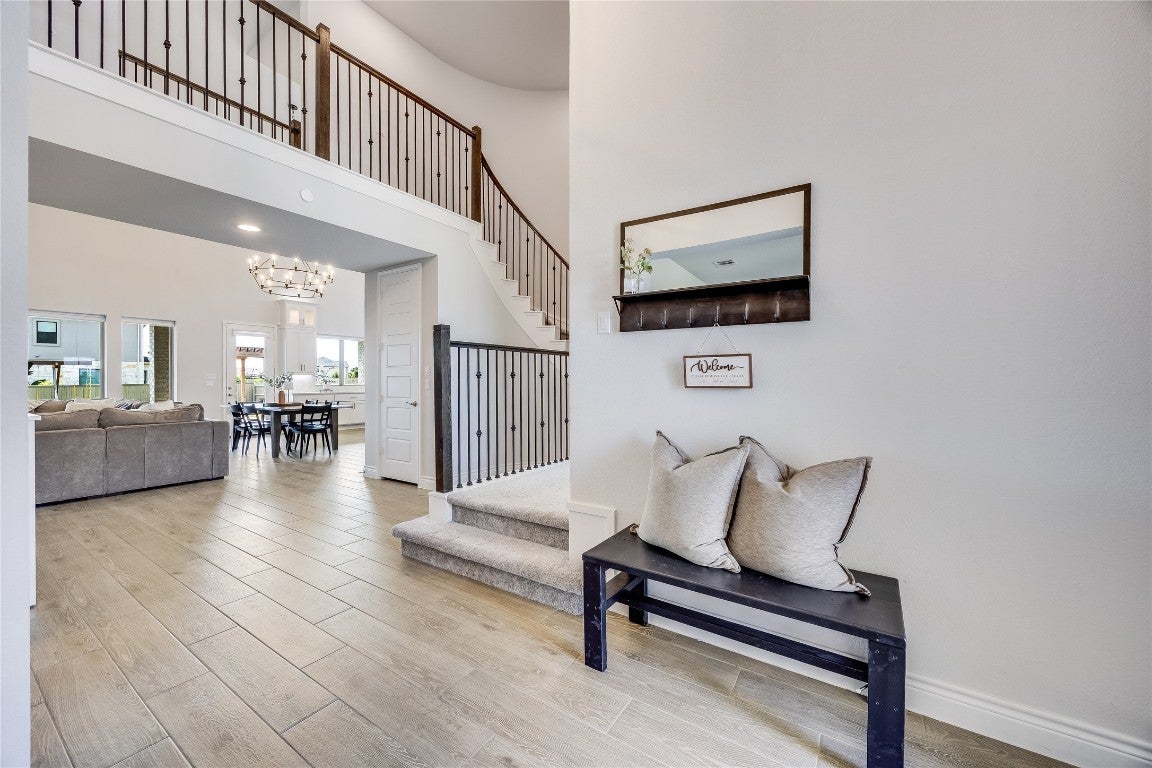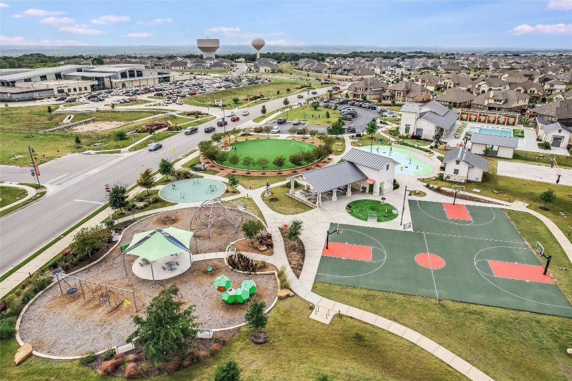 Built by Perry Homes, this beautifully designed executive home is situated on a large corner lot. Step into the grand two-story entry which leads to the open-concept living area. The living, kitchen, and dining areas have soaring ceilings with windows all across the back, allowing light to fill the space. The expansive kitchen features a large island, tall cabinetry, 5-burner gas cooktop, walk-in pantry, and butler’s pantry, making cooking and entertaining effortless. The secluded primary suite offers a serene retreat with a spa-like bath featuring separate vanities, garden tub, glass-enclosed shower, and two spacious walk-in closets, one of which is connected directly to the laundry room. Also on the main floor is a private guest suite with a full bath and walk-in closet that provides comfort and flexibility. Downstairs you will also find a dedicated office and flex room which can be used for formal dining, play room, or second home office. Upstairs, a generous game room anchors three additional bedrooms and two full baths. Enjoy the outdoors with an extended covered patio, added pergola for shade, and a fully fenced yard ideal for kids, pets, or gatherings. Upgrades include a whole-home water filtration system with reverse osmosis and water softener, professionally epoxied floors in 3-car garage, and window treatments throughout. Built in 2023, this home is as efficient as it is elegant, with a 2-year old roof and systems. Located within walking distance of a brand-new elementary school and surrounded by community amenities including three resort-style pools, splash pads, and food truck Fridays, this home perfectly blends luxury, livability, and vibrant Texas charm in the #1 master-planned community in the Austin area.