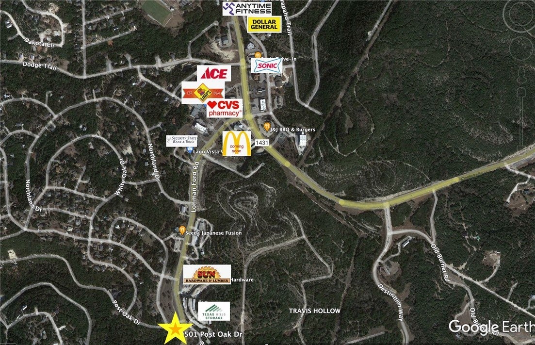 COMMERCIAL! 0.845 acre lot of flat buildable land on Lohman Ford in Lago Vista. Currently has dual zoning(C-1C and R1-D), but city and seller support zoning to C-1 or C-2. Water lines on street and sewer lines nearby. Power lines located at corner of lot. Ready for development. Highlights: 1. Lot is located on primary artery in Lago Vista - Lohman Ford 2. near intersection of 1431 3. 10k traffic count 4. Corner lot 5. Flat and buildable 6. Nearby utilities 7. City supports upgraded zoning 8. Seller financing available at reasonable terms
