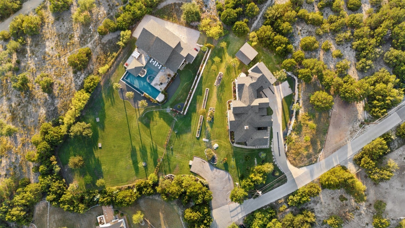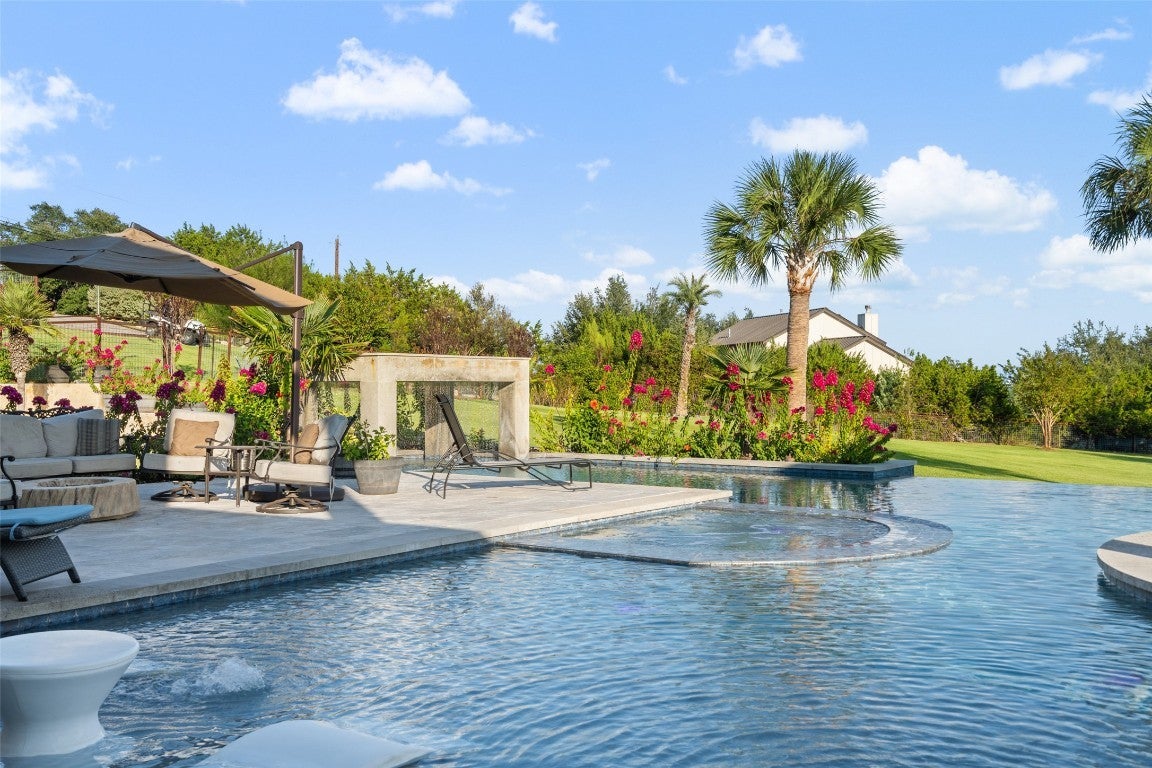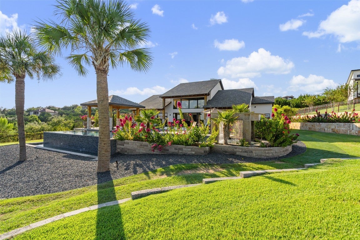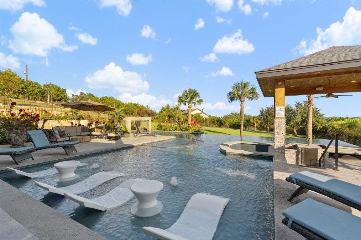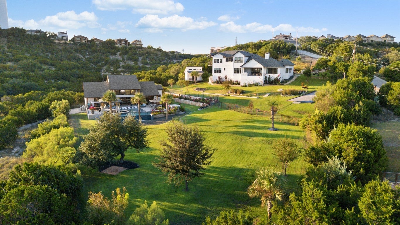 Welcome to Little La Jolla, a private Hill Country retreat where every day feels like a luxury vacation. Tucked away on nearly 1.5 acres, this extraordinary property offers unmatched privacy and panoramic views while still being less than five minutes from shopping and dining, served by excellent schools, and only about thirty minutes from Downtown Austin. Designed for unforgettable entertaining as well as comfortable everyday living, this estate includes a 3,800 square foot modern farmhouse–inspired main home and a separate 2,100 square foot pool clubhouse and guest retreat. The main residence features five bedrooms and four and a half bathrooms, including two primary suites with spa-caliber baths, soaring twelve-foot ceilings, eight-foot doors, and a light-filled open layout that frames Hill Country views from every room. The chef’s kitchen with oversized island, walk-in pantry, and recent upgrades flows seamlessly into living and dining spaces, while the high-fidelity home theatre provides a true cinematic experience. Across the manicured lawn, the pool clubhouse is an entertainer’s dream, complete with a gourmet Thermador kitchen, commercial-grade appliances, oversized island, and one and a half baths. Its large open design can easily be reconfigured to add additional bedrooms, making it ideal for guests or multigenerational living. The centerpiece of the estate is the resort-worthy infinity-edge pool with beach entry, spa, swim-up bar, and rain grotto, complemented by a sunken outdoor kitchen with rotisserie grill, Big Green Egg, freezer, and ice maker. Beyond the showstopping amenities, the property is well maintained with newer systems, a 700-foot private well with 2,500-gallon tank for abundant free water, three parking areas, and a charming she-shed for hobbyists or creatives. Little La Jolla is a true legacy estate—perfect for gathering family and friends for a lifetime. **MUST SEE VIRTUAL TOUR FOR 200+ PHOTOS, 3D TOUR and VIDEO**