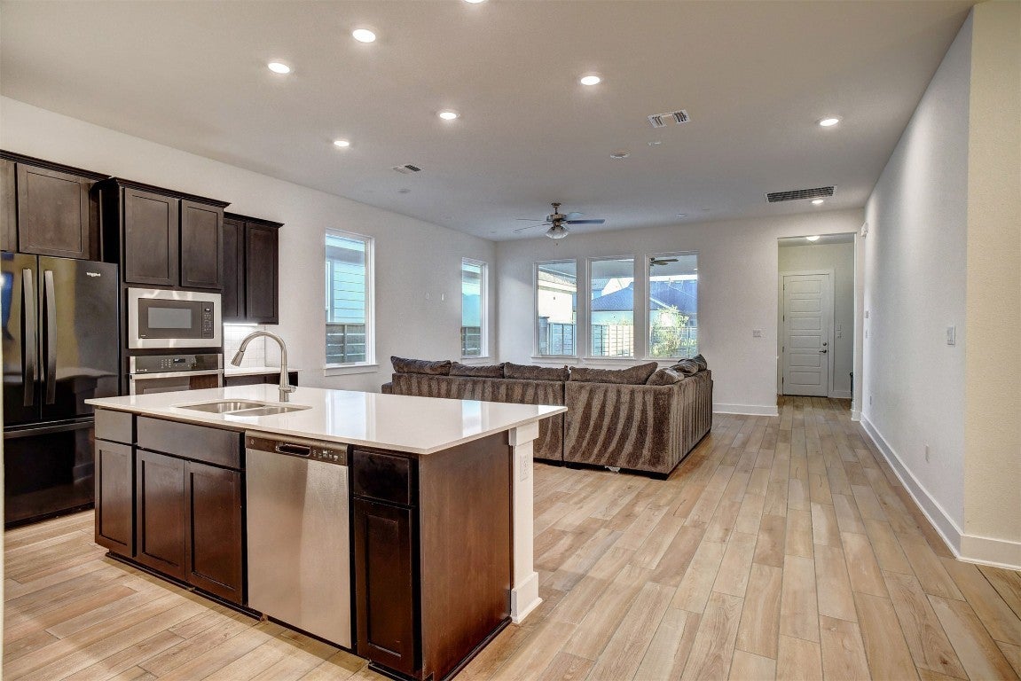 Great house and very nice floorplan! It has a cute front porch and a large covered back porch with a ceiling fan and a cute backyard with pretty landscaping! This home has rear alley access to the garage! Wide foyer with 3 bedrooms and 2 baths and the laundry room in the front of the house and then you pass the 2nd living room and enter the large open living, kitchen, dining area with windows overlooking the nice backyard and covered patio. Large island bar seating, huge dining room with a large closet for all your serving pieces, etc.! Lots of closet space! Ceramic tile wood look flooring that is very light and pretty everywhere except the primary bedroom has tan carpet and is situated at the back of the home. Nice gas cooktop range, wall oven and wall microwave and the fridge is possibly negotiable. There is a mud room area just inside the garage with bench seating/hook system cabinet. The ceilings are 9-10 feet and the home is light and airy feeling! It is a wonderful entertaining home with the large open living/dining/kitchen area, large covered back porch, courtyard, 2nd living! Nice sidewalks in the community. The brand new Adelton Elementary is 2 blocks away! Less than 1 mile to all the shopping centers, etc. 25 mins to ABIA/TESLA, 10-15 mins to SpaceX, BoringCo, X, etc. #homeforsale #Kanarealestate #Dawnkana #Sellingbastrop #Bestofbastrop #Empirehomes