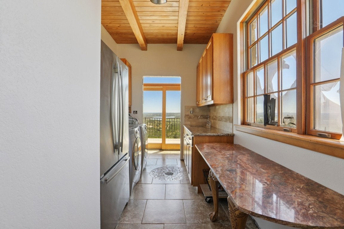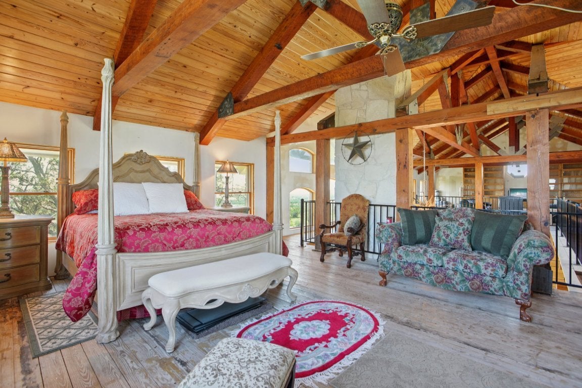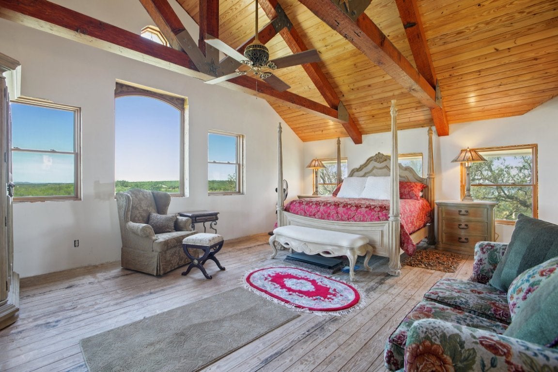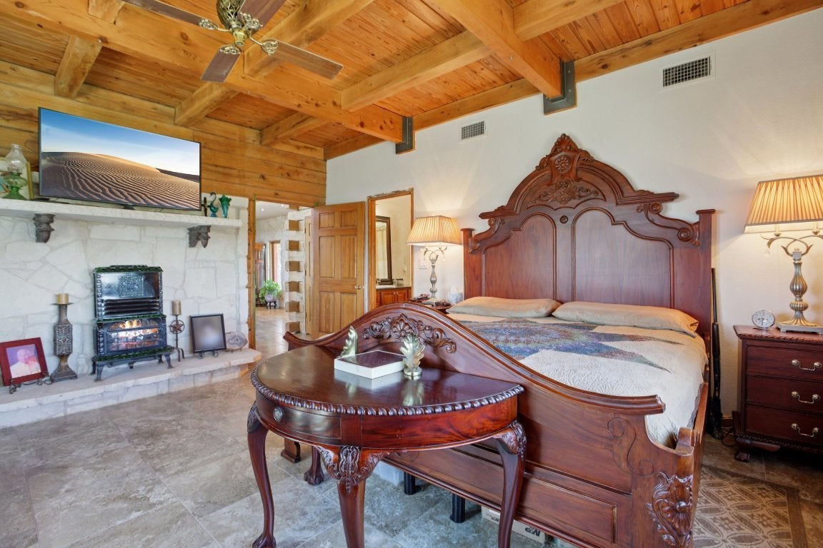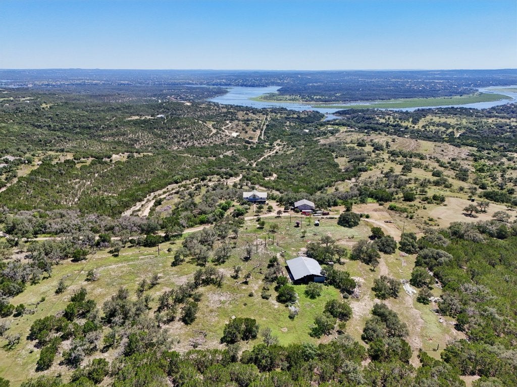 Custom Log & Limestone Home with Panoramic Lake Travis Views. Nestled atop a hill with 62 acres of ag-exempt land and a private 1-acre homesite, this custom-built log and limestone home offers an extraordinary combination of tranquility, luxury, and natural beauty. The property is fully fenced and cross-fenced, providing both security and versatility for a variety of uses. This unique 3-bedroom, 3.5-bathroom home features two full kitchens, multiple living areas, and two fireplaces, creating an inviting space for both relaxation and entertaining. Whether you're hosting friends or enjoying peaceful evenings, the expansive interiors complement the stunning surroundings. The attached 2-car garage, along with a separate barn, provides ample storage and functional space for all your needs. With panoramic views of Lake Travis and the rolling Texas Hill Country, this estate offers the perfect blend of seclusion, luxury, and endless possibilities for outdoor living. If you’re looking for a retreat that combines rustic elegance with modern comforts, this exceptional property is the perfect place to call home.
