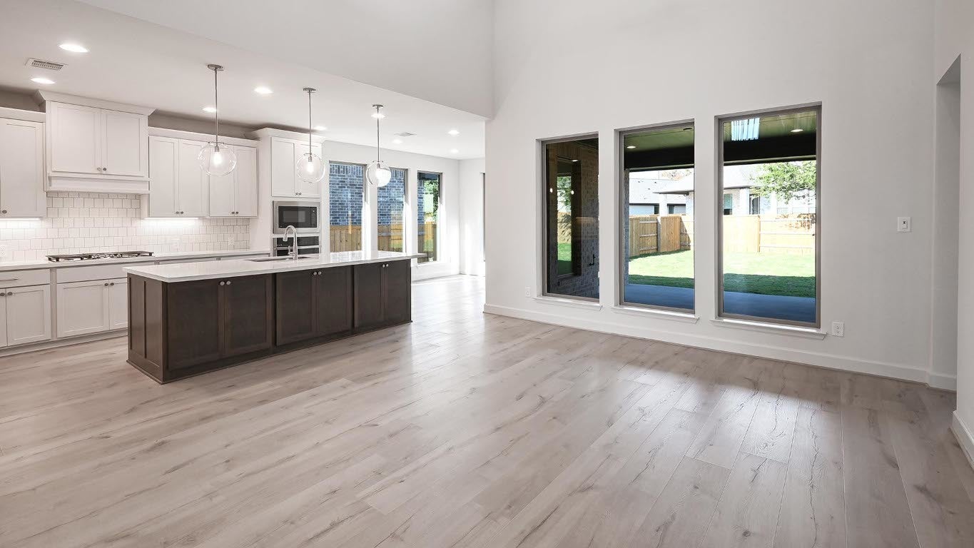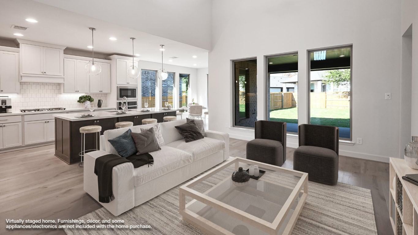 READY FOR MOVE-IN! Front porch opens into a two-story entryway with a grand staircase. French doors enclose the private home office. The utility room is conveniently located off the main hallway. The family room boasts extended ceilings and a wall of windows. The kitchen has an island with built-in seating, 5-burner gas cooktop and a walk-in pantry. The dining area is embraced by a corner wall of windows and allows entrance into the extended covered backyard patio. The primary bedroom boasts three large windows. French doors open into the primary bathroom which hosts dual vanities, a freestanding tub, glass enclosed shower, and two walk-in closets. Upstairs you are welcomed by a game room and secondary bedrooms. Completing the home is a guest suite tucked beyond the mud room which features a full bathroom. Two-car garage.