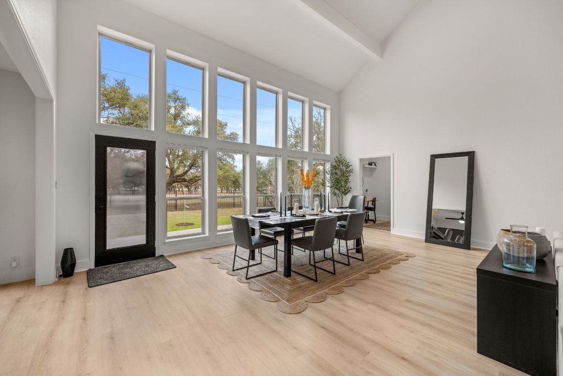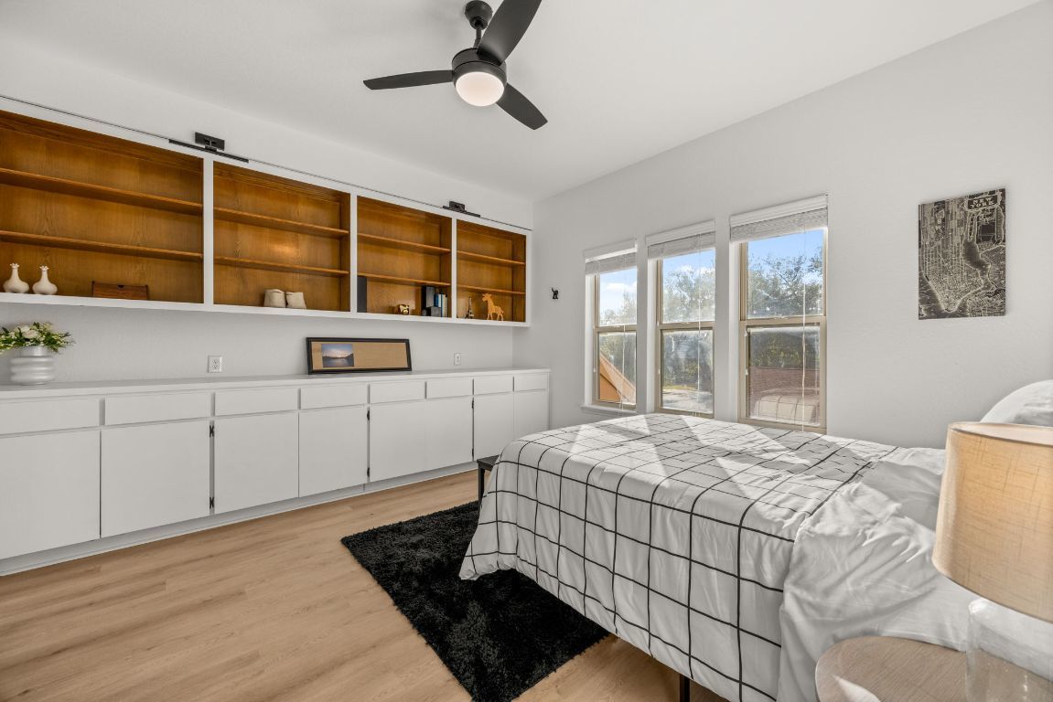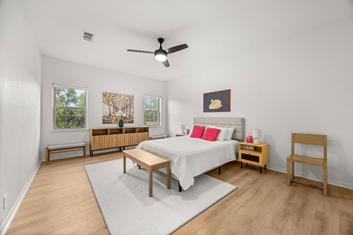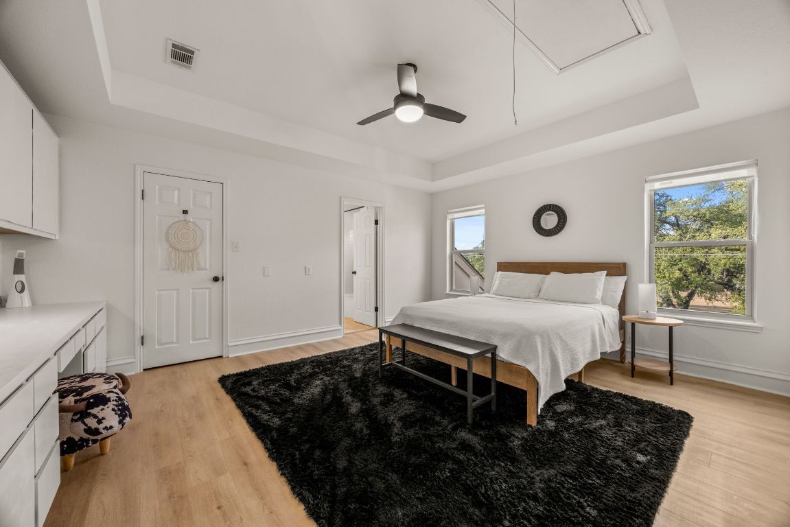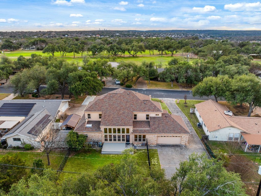 Absolutely stunning modern renovation on the Balcones Golf Course in the highly sought-after 78750 zip code. This stately home has been transformed into a spacious 5-bedroom residence with a dramatic open floor plan that balances elegance and comfort. Upon entry, soaring 20-foot ceilings and a wall of windows frame breathtaking golf course views. Light oak LVP flooring and fresh white walls flow throughout, creating a bright, airy feel filled with natural light. The expansive great room is ideal for entertaining, while the oversized kitchen is slightly tucked away for a touch of traditional privacy. The kitchen offers exceptional storage and functionality with white quartz countertops, abundant cabinetry, a large island with cooktop, double built-in ovens, two dishwashers, a wine fridge, and a separate ice machine. Cabinetry continues into the eat-in area, with even more storage in the nearby laundry room off the rear-entry garage. Two bedrooms are located on the main level, thoughtfully separated for privacy. The spacious primary suite features extensive built-in storage, a walk-in closet, and a spa-like bath with walk-in shower, soaking tub, and oversized sink. A large guest bedroom sits toward the front of the home. The main level also includes a half bath and an additional full bath, ideal for entertaining, plus a third full bath at the rear added with future pool plans in mind. Enjoy golf course views from the new deck, along with a wrap-around driveway and rear-entry garage offering ample parking. Upstairs are three additional oversized bedrooms, two full bathrooms, and abundant storage, connected by a catwalk overlooking the great room. Recent updates include a roof replaced in 2022 or later, a new 5-ton HVAC in 2025, three additional HVAC units, and one recently replaced water heater. Furniture is also available for purchase—this home truly has it all.