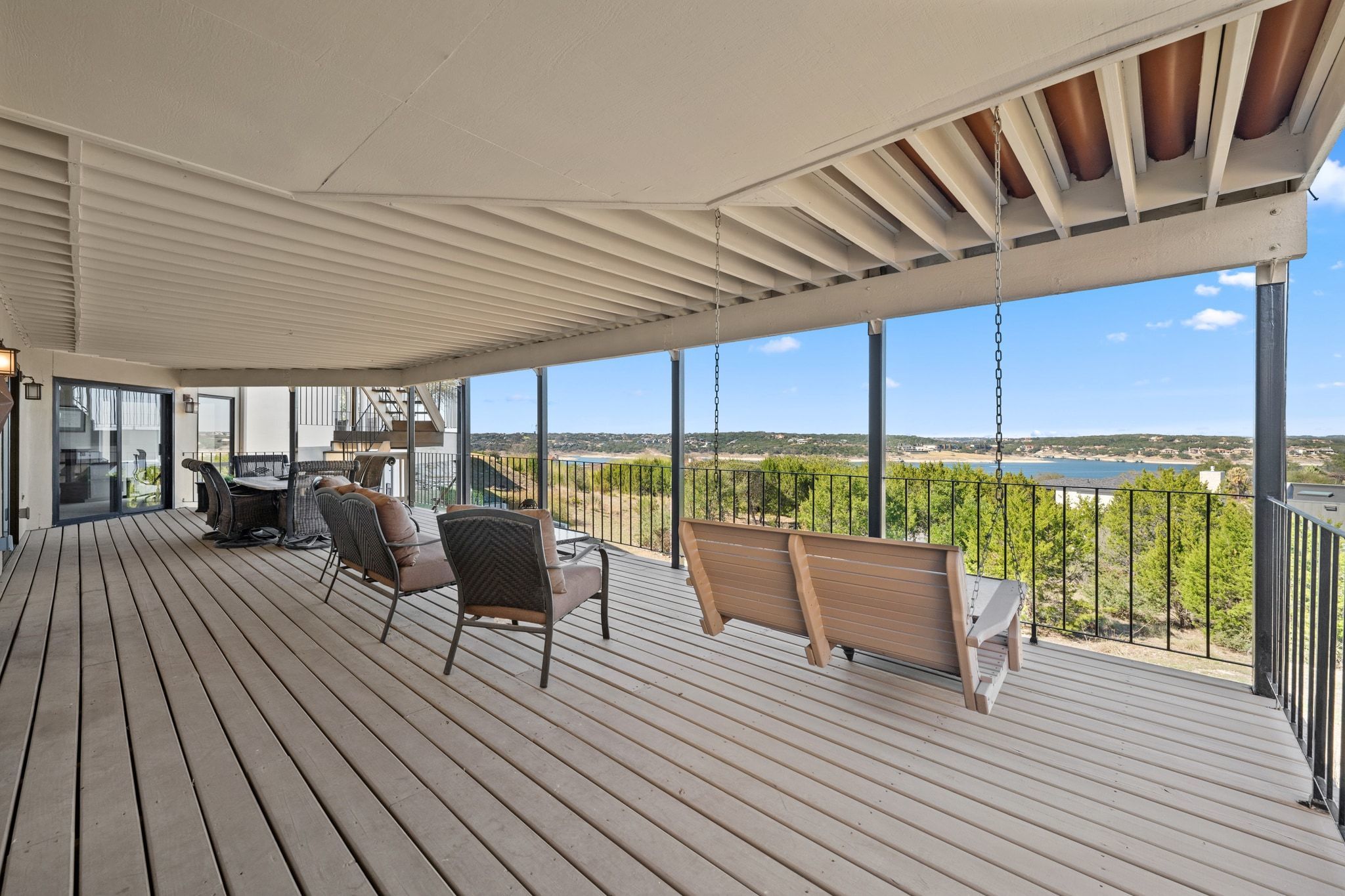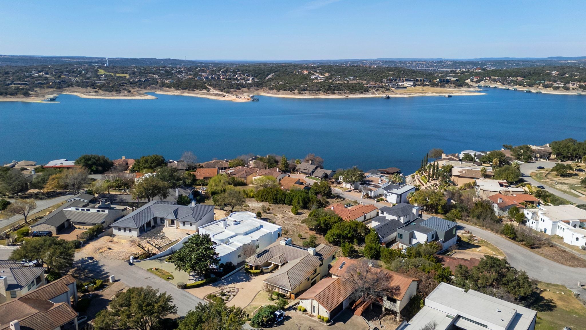 Panoramic Lake views from nearly every room make this home one of Lakeway’s most exceptional offerings. Walls of windows flood the interior with natural light while perfectly framing the stunning water views throughout. The spacious great room features soaring ceilings, a skylight, and a fireplace—creating a dramatic yet inviting focal point. The open kitchen overlooks the living area and is well appointed with granite countertops, ample cabinetry, and an ideal layout for entertaining. Enjoy seamless indoor-outdoor living with two expansive decks featuring Trex decking and awnings, perfect for hosting guests, enjoying morning coffee, or unwinding in the evening with sweeping Lake views. The primary suite is a private retreat with a spa-like bath showcasing a skylight, travertine floors, and elegant finishes. The lower level offers a large game room with a wet bar that opens directly to the lower deck—once again highlighting the breathtaking Lake views. The downstairs flex room features a built-in desk, creating an ideal space for a home office, study area, or creative workspace. An atrium adds architectural interest and additional natural light, while the home backs to a peaceful greenbelt, providing both privacy and scenic beauty. Hardwood floors and tile throughout enhance the home’s timeless appeal. Residents enjoy access to a nearby POA park and tennis / pickle ball court, adding to the lifestyle appeal of this incredible property. This home is truly a “sight to see”—a rare opportunity combining panoramic Lake views, abundant natural light, multiple entertaining spaces, and a prime Lakeway location. Located within exemplary school districts and just minutes from shopping, dining, and restaurants.