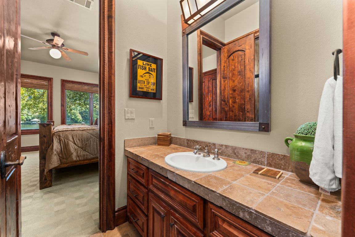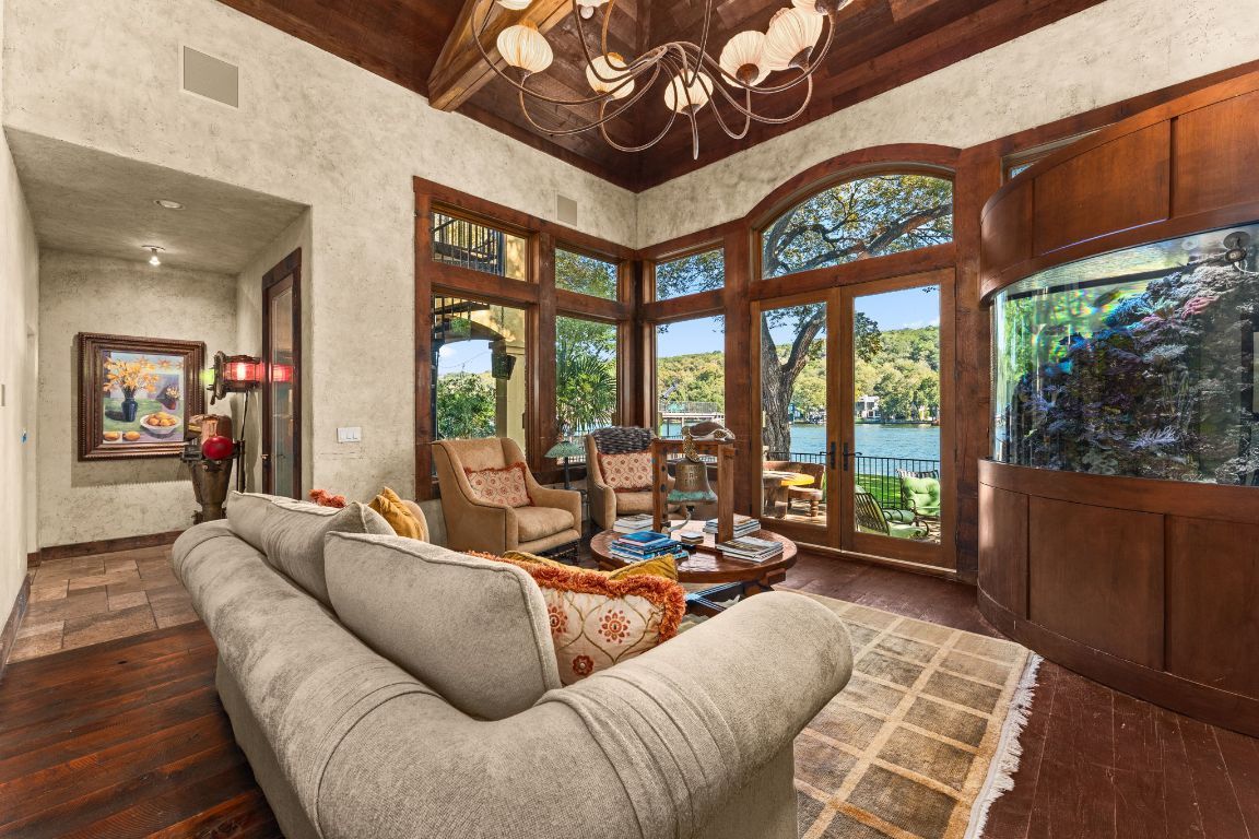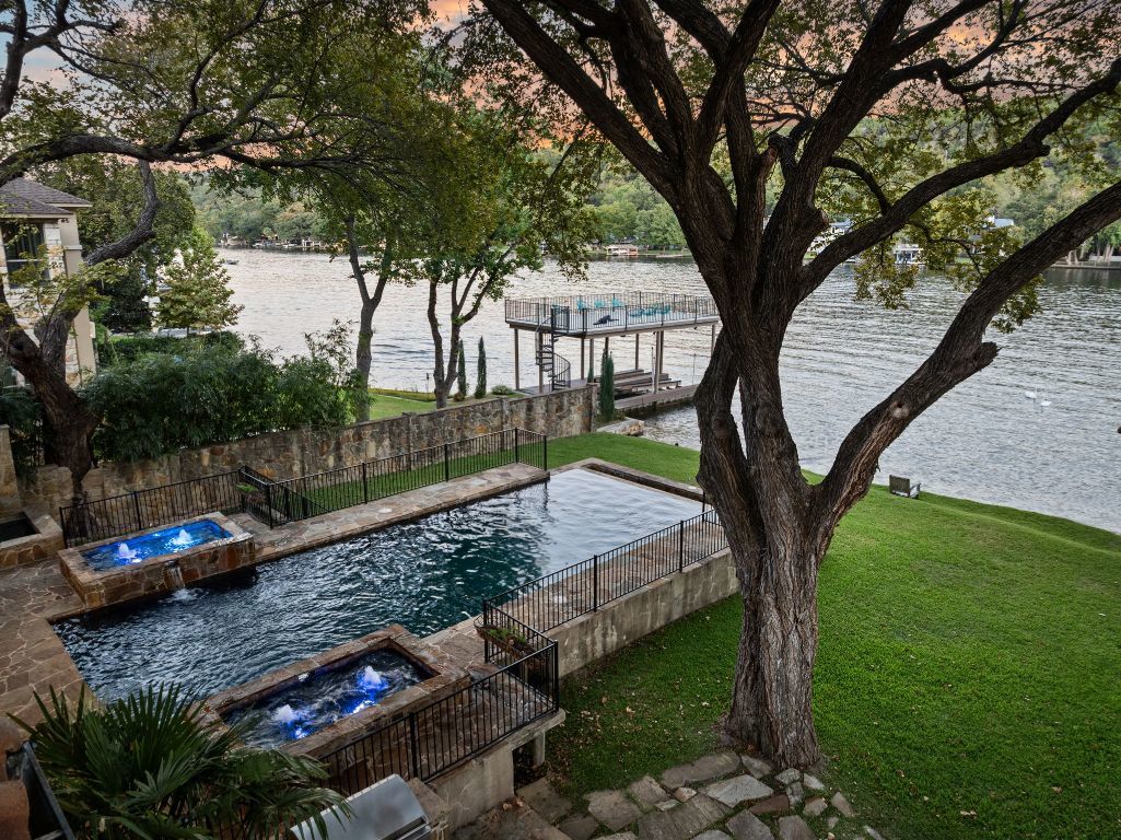 Just reduced $500,00! Nestled along the tranquil shores of Lake Austin, this picturesque gated waterfront residence offers a blend of luxury, quality, privacy & exceptional outdoor lakeside living. Situated on a beautifully landscaped 0.405-acre lot with +/-90 ft of waterfront, a private beach & just steps Ski Shores Cafe, this exquisite property captures sweeping Lake Austin views from nearly every vantage point. Welcome guests first through a gated & walled entrance then through solid wood arched double doors & into a grand entrance with vaulted ceilings, stone floors & a direct view out to the negative edge pool & glistening lake. The +/-6000 SF Old World interior features 5 en suite bedrooms, 4 full baths, 2 half baths, 2 living rooms, a formal dining room, breakfast area, a beautiful home office, an extensive workout room & 2 game/flex rooms. Custom details throughout including plaster walls, triple crown molding, copper sinks & fixtures. At the heart of the home is a gourmet kitchen with an oversized island surfaced in natural stone, custom cabinetry, walk-in pantry, breakfast area, granite countertops, excellent storage & a built-in desk area. The kitchen overlooks the backyard, pool & lake from large picture windows & is conveniently located just steps from the 4-car garage & laundry/mudroom. The main level also hosts a grand living room, formal dining, a family room with a salt water aquarium & a primary suite with 2 walk-in closets, double vanities, a soaking tub with stunning lake & pool views & a private entrance out to the pool/hot tub. Upstairs, a large secondary living space is complemented by 4 en suite bedrooms, a formal office with custom woodwork & coffered ceiling, a music room & gym. Outside multiple patios lead to a resort-style pool/spa with beautiful water features, fountains, a fire pit & fireplace. Watch the sunset and entertain from the upper party deck of your boat dock!