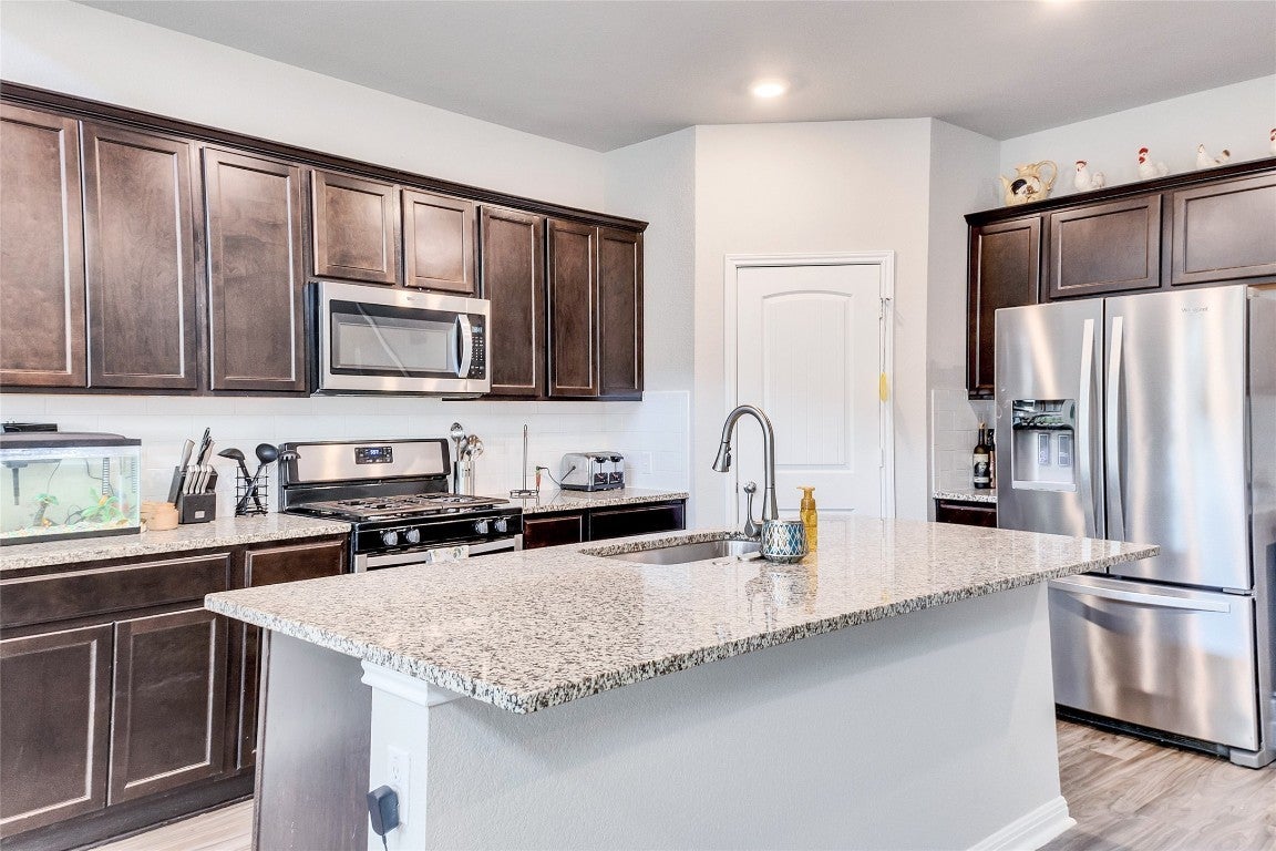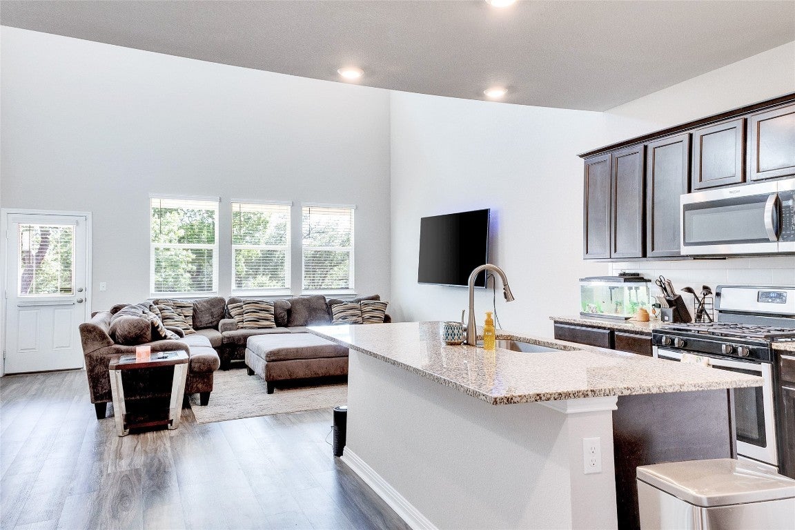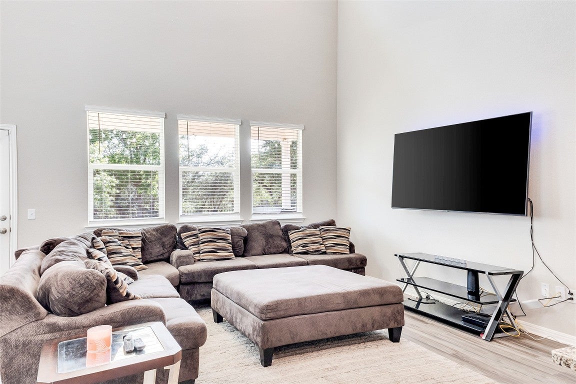 Newer home on a premium lot with views of the wooded nature reserve!.. Flexible plan offers 2 Bedrooms downstairs and 2 bedrooms plus a Game Room up. Nice architectural details and tasteful design selections throughout, including Luxury Vinyl floors. Open-concept Island kitchen has rich wood cabinetry, granite, and breakfast bar. Soaring Ceilings in family room. Spacious mater bedroom has oversized walk-in closet, separate tub and 2-sinks with granite tops. Large dining area! Perfect size home for your family! Nice curb appeal in this lovely community with amenities in a desirable location. Leander ISD schools! Low 2.5% Tax rate.