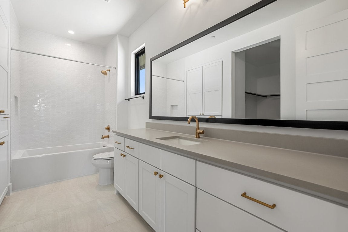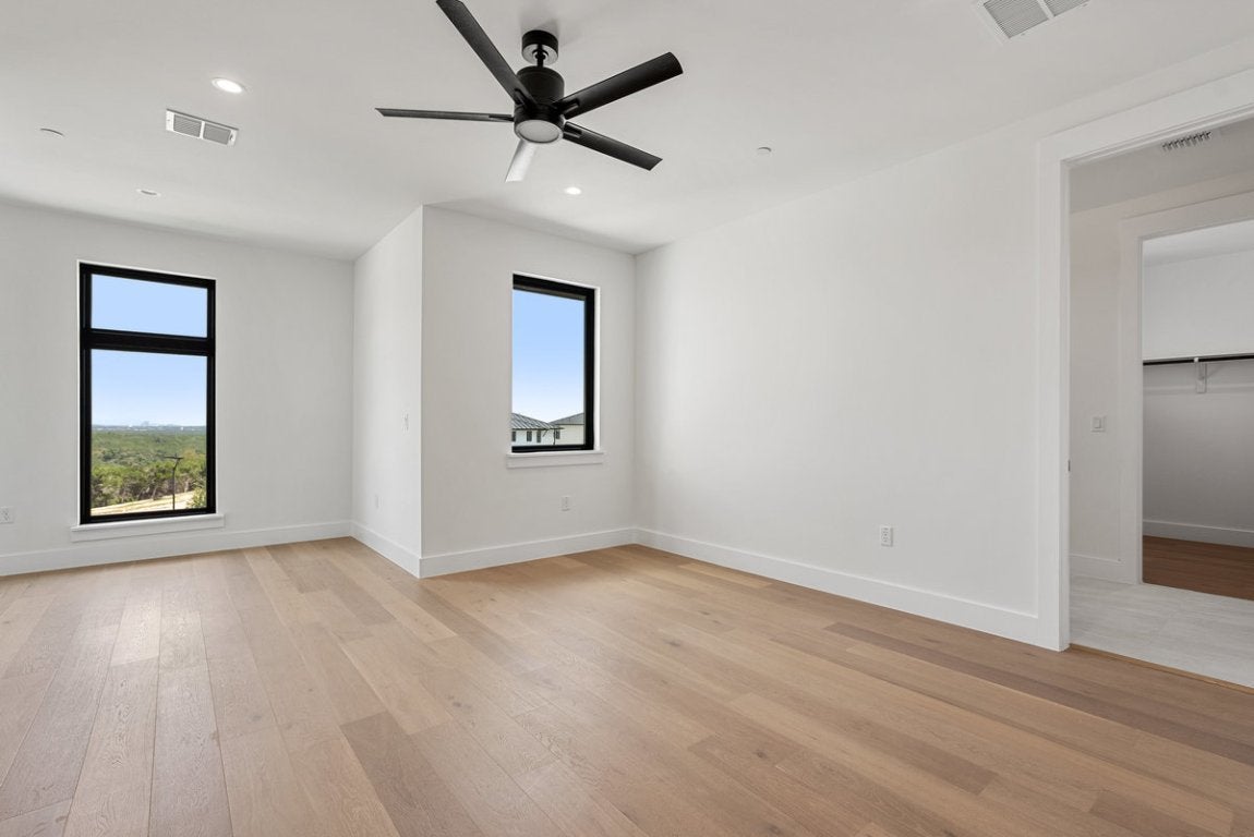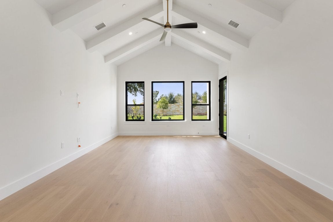 Proudly crafted by M Signature, this home offers the perfect blend of luxury, functionality, and Hill Country charm. Positioned on a spacious lot with a heritage tree and beautiful views, the home features a modern architectural design with timeless details throughout. Inside, you’re welcomed by soaring ceilings and a grand foyer that opens to a private study with French doors, high ceilings, and natural light. The spacious floor plan includes both the primary suite and a guest bedroom on the main level, each with its own full bath. The primary bedroom is a true retreat with vaulted ceilings and beam detailing, while the luxurious bath showcases split vanities, a large soaking tub, a walk-in shower with a seated dressing area, and a walk-in closet. The designer kitchen features 63-inch soft-close cabinetry, a JennAir professional dual-fuel range, built-in appliances, and expansive quartz counters, all flowing seamlessly into the open-concept living and dining areas. Hardwood and tile flooring extend throughout with no carpet. Upstairs, you’ll find three large secondary bedrooms, each with its own private bath, a gameroom with rear balcony, a media room with wet bar, sound and data pre-wire, and a loft area with built-in desks for a perfect homework station. Additional highlights include a covered front porch, a front balcony accessed from the loft and secondary bedroom, a large backyard with stone and metal fencing, and a complete outdoor kitchen at the rear patio. Energy-saving features include spray foam insulation, a standing seam metal roof, Andersen windows, a tankless water heater, and a high-efficiency HVAC system with heat pump. Located near top-rated schools including River Place Elementary and Vandegrift High, and just minutes from Sun Tree Park and River Place Country Club, this home delivers unmatched design, comfort, and location.