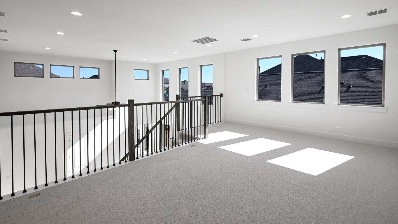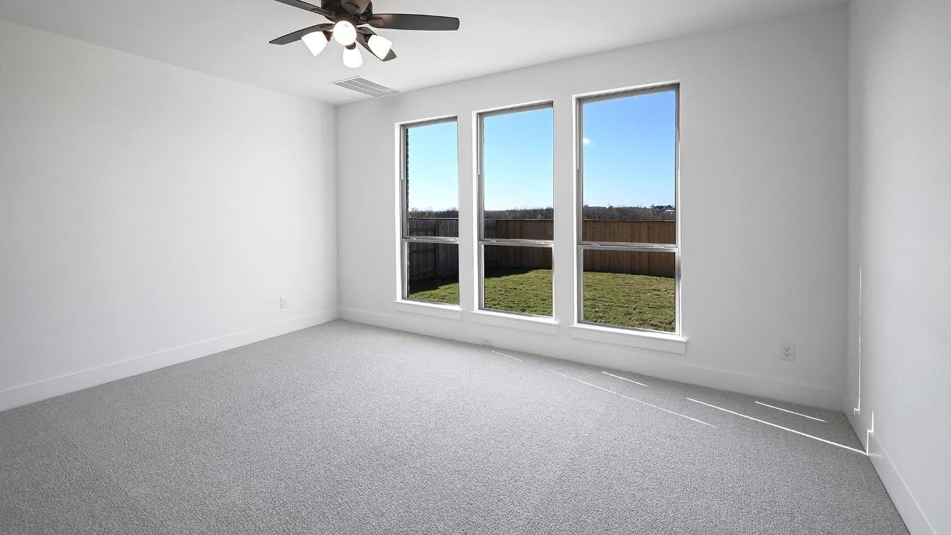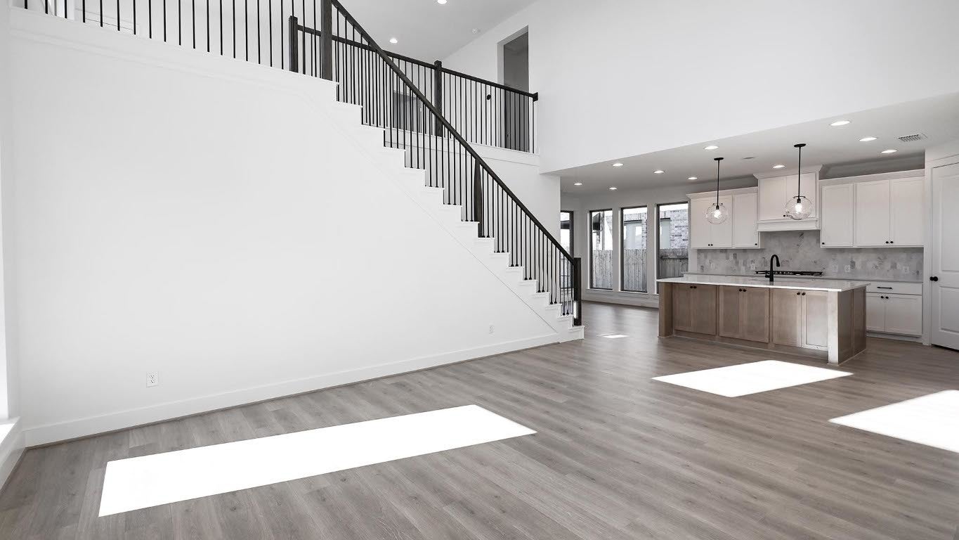 Welcoming front entry lined with three large windows. Home office with French doors off the entry. Inviting family room with 19-foot ceilings flows into the kitchen. Island kitchen with built-in seating, 5-burner gas cooktop and a corner pantry opens into the dining area. Private primary suite features three large windows and access to the utility room. The primary bathroom has dual vanities, a freestanding tub, a large separate glass enclosed shower, a linen closet, and two walk-in closets. Upstairs includes a game room, secondary bedrooms with a Hollywood bathroom, and a guest suite. Extended covered backyard patio. Mud room just off of two-car garage.