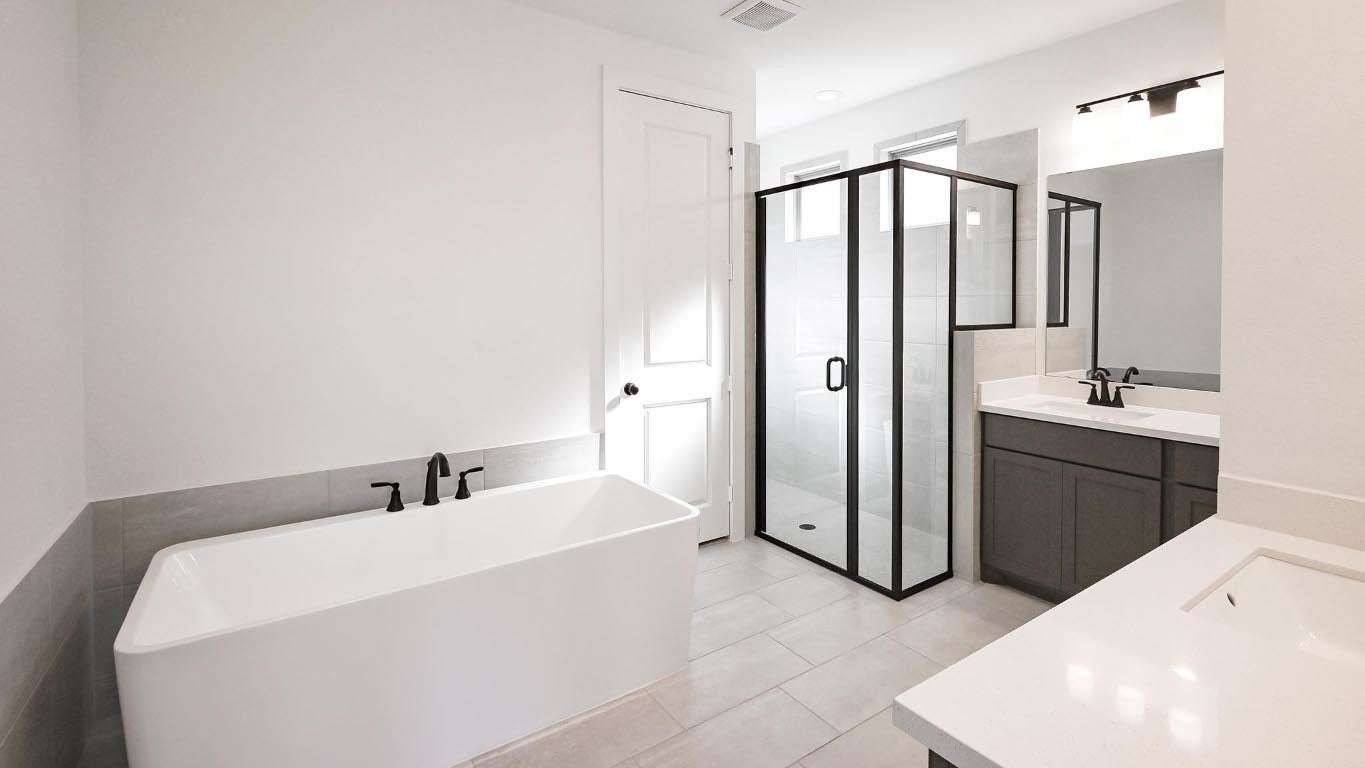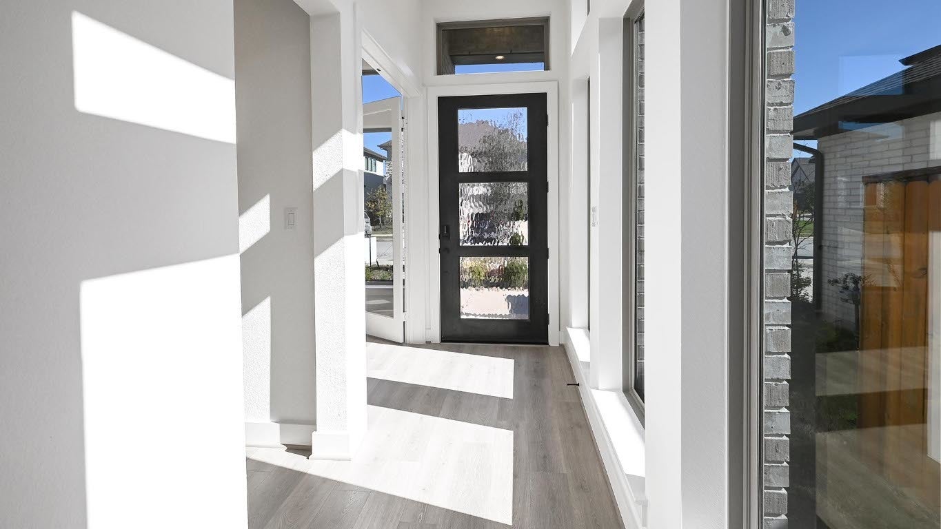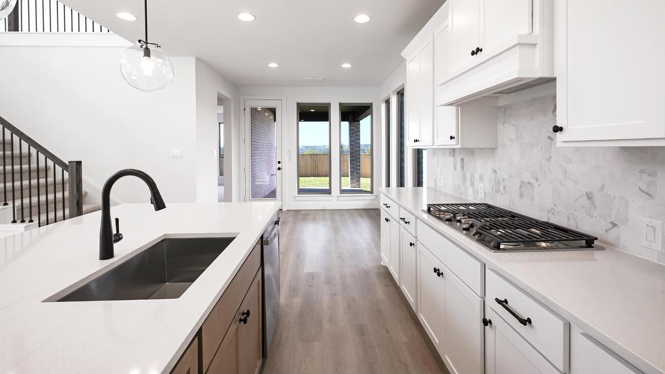Welcoming front entry lined with three large windows. Home office with French doors off the entry. Inviting family room with 19-foot ceilings flows into the kitchen. Island kitchen with built-in seating, 5-burner gas cooktop and a corner pantry opens into the dining area. Private primary suite features three large windows and access to the utility room. The primary bathroom has dual vanities, a freestanding tub, a large separate glass enclosed shower, a linen closet, and two walk-in closets. Upstairs includes a game room, secondary bedrooms with a Hollywood bathroom, and a guest suite. Extended covered backyard patio. Mud room just off of two-car garage.