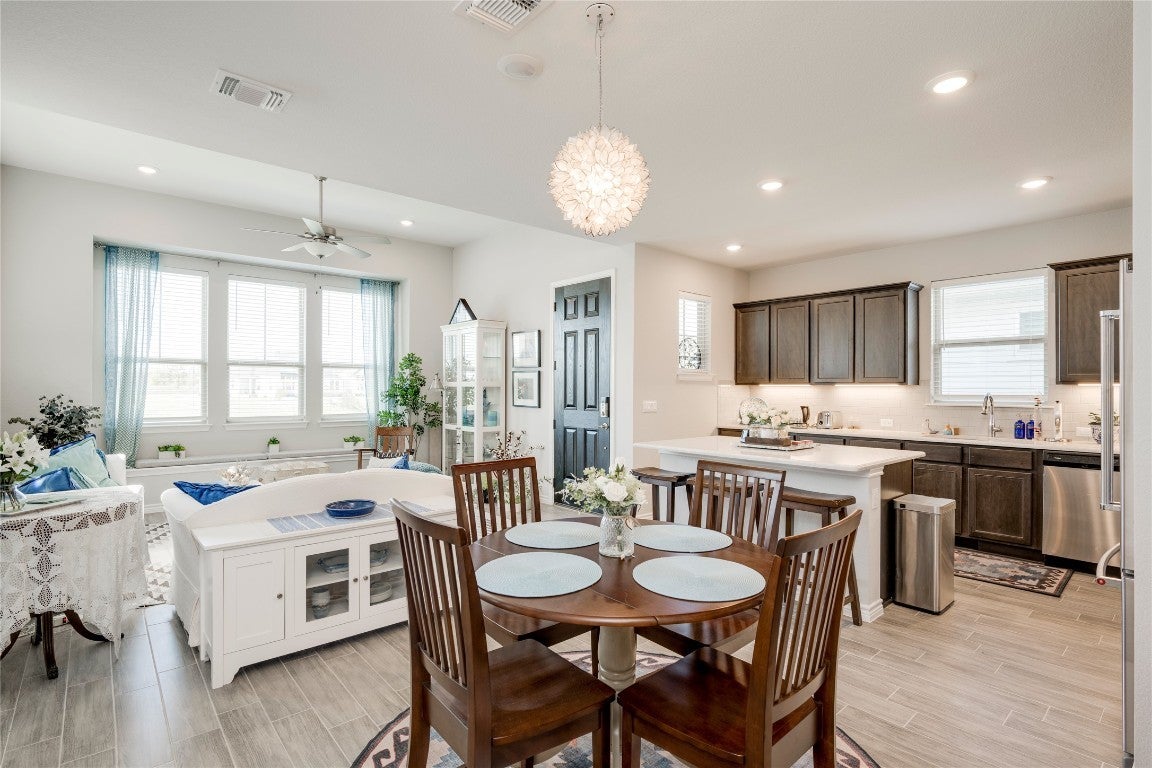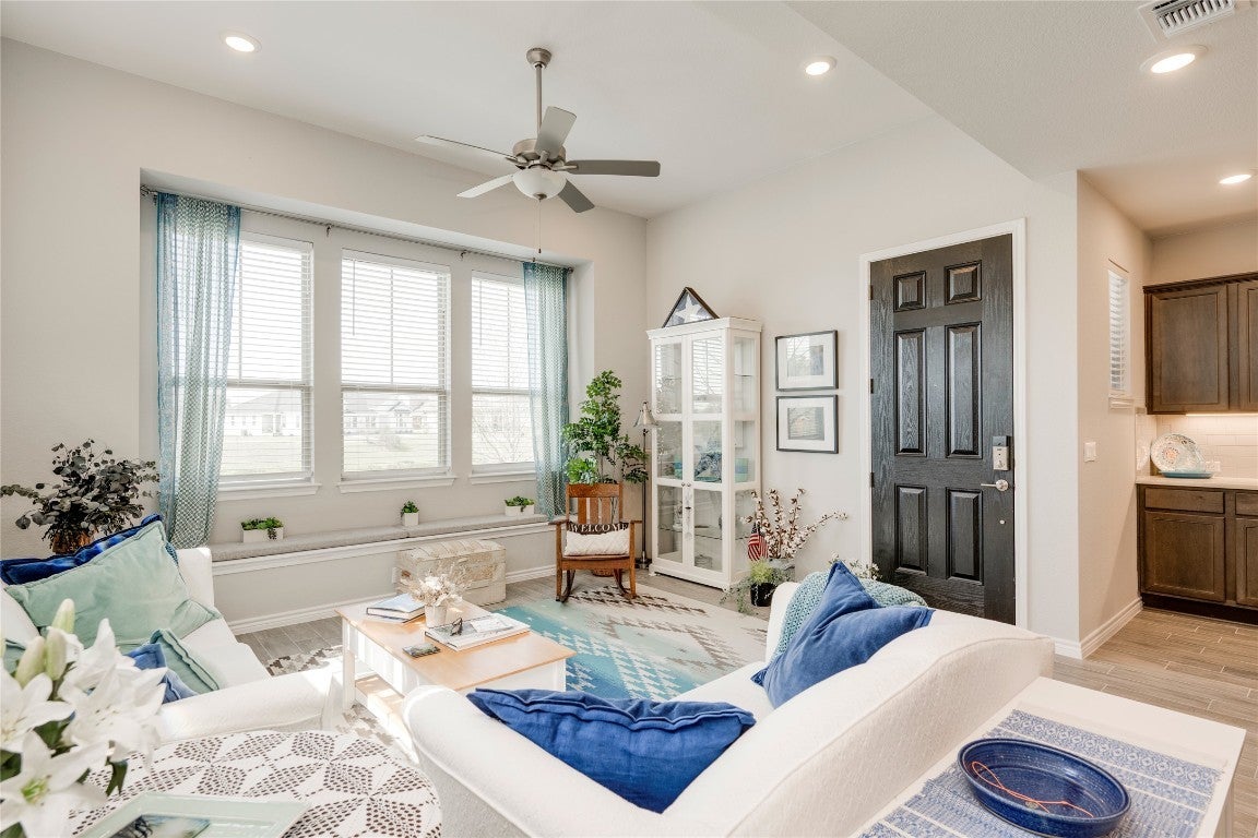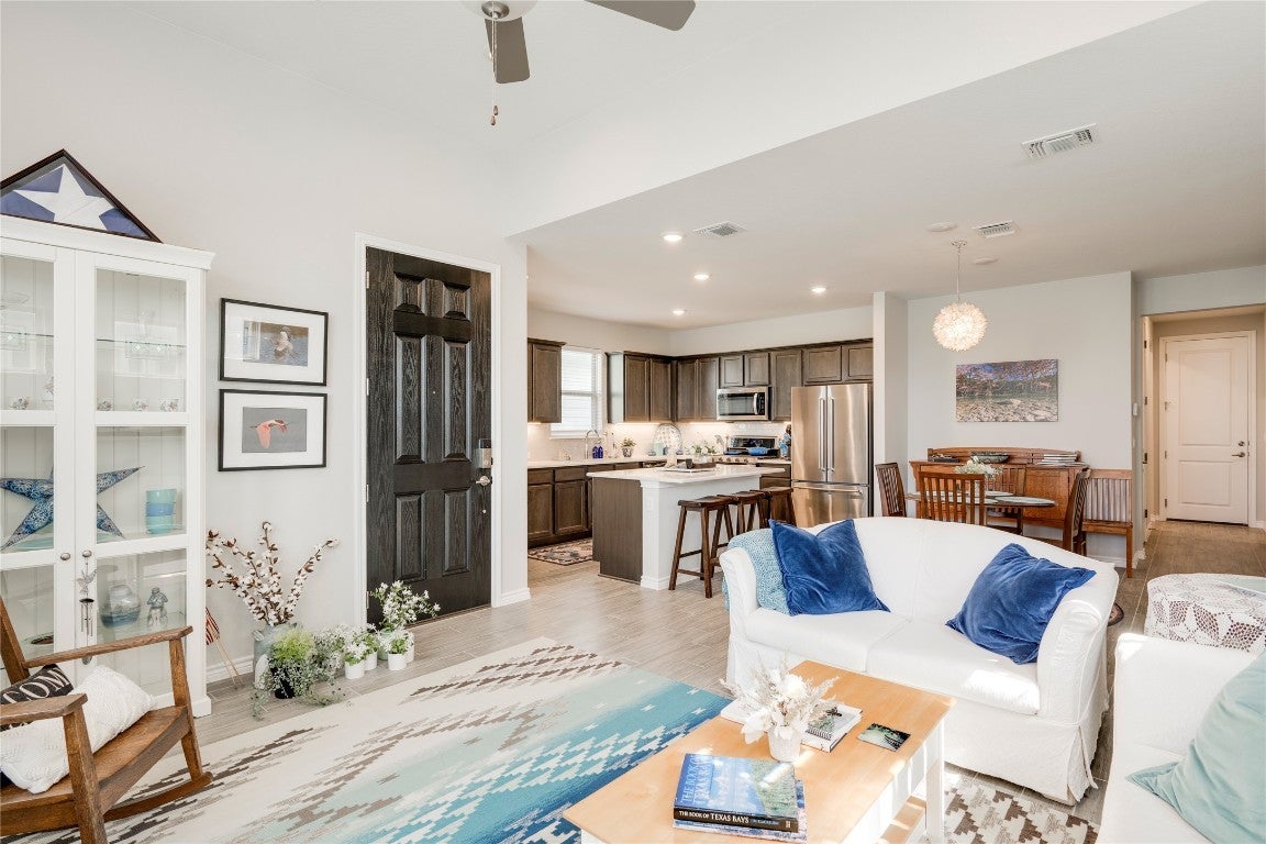 *Use main Kissing Tree gate. Then follow these directions, as GPS takes you through the owner's use gate: Into Kissing Tree, Left on Dancing Oak, Left on Skipping Cedar, Left on Calming Agave, Left on Charming Redbud Way, Left on Surfside, Right onto Sandbar, Left on Harborside. Welcome to your Hill Country retreat in the heart of Kissing Tree! This beautifully maintained "Tremont" plan, 2-bedroom, 2-bath home blends relaxed elegance with the vibrant 55+ lifestyle that makes this San Marcos community so special. From the moment you step inside, you’re greeted by an open-concept layout bathed in natural light, complemented by luxury vinyl plank flooring, custom window treatments, and a soothing neutral palette. The kitchen is the true heart of the home—featuring stainless steel appliances, silestone countertops, a spacious center island with bar seating, and ample cabinetry. The primary suite offers a peaceful escape with a large walk-in closet and spa-inspired ensuite complete with dual vanities and a walk-in shower. Enjoy morning coffee or evening wine from your private covered patio with peaceful lake views, just the right amount of sunshine, and a coveted orientation that highlights the pond—rather than other homes or retaining walls, which are more common. Additional highlights: Appliances are included! The home has a two-car garage with metal shelving and a compact yet sturdy workbench. There are also 2 sets of 7 visitor parking spaces right near this home. Lightly lived in and virtually like new—having been used only about 10% of the time—the home offers a fresh, move-in-ready experience. Located just moments from the resort-style amenities that make Kissing Tree famous—like the golf course, pickleball courts, fitness center, and The Mix clubhouse—this is the perfect lock-and-leave lifestyle for those looking to live life to the fullest. Don’t miss this opportunity to own a low-maintenance gem in one of Central Texas' premier active adult communities!