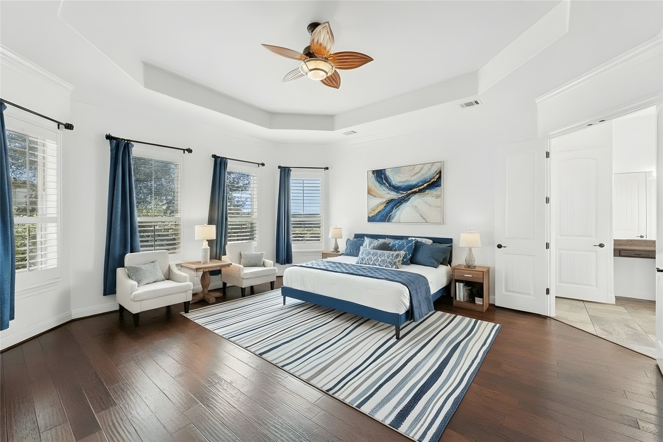 The best deal to own a Meritage custom-built home with thoughtful designs and upgrades! Step into luxury with this 5,434 sq ft stunning home located within the exemplary Lake Travis ISD. Featuring 5 bedrooms, 4 bathrooms and a 3 car garage. This home offers a gourmet chef's kitchen with a 6 burner cooktop, 4 ovens, stainless steel appliances, a California closet-designed walk-in pantry, a massive center island complemented by a butler’s pantry. The main level offers a large primary suite with 2 California closet designed walk-in closets, a jetted tub, a separate shower, double vanities and a full exercise room with a mounted TV. An in-law suite/secondary bedroom with a private bathroom on the main floor. Formal dining room and a custom built study/office perfect for remote work, hardwood floors, custom plantation shutters throughout and a brand new roof with a 20-year warranty. Upstairs, discover 3 additional bedrooms, 2 full bathrooms, a game room, and a custom home theater equipped with Dolby Atmos surround sound and a Sony 4K projector. Oversized 3-car garage features an epoxy floor and custom cabinetry. Outside, entertain effortlessly on the 2-level covered patio with an outdoor fireplace, new gas grill, all set within a beautifully updated landscaped yard. The home is fully wired for Control4 smart home automation, enabling seamless control of lighting, security, doors, and audio/TV from mobile devices or integrated touchscreens throughout the house. Located in the desirable Bella Colinas community, enjoy access to a pool, park, and top-rated schools, all just minutes from the Hill Country Galleria. This exquisite home is waiting for you to make it your own!