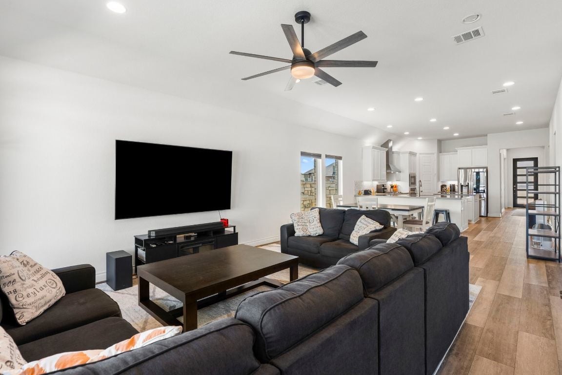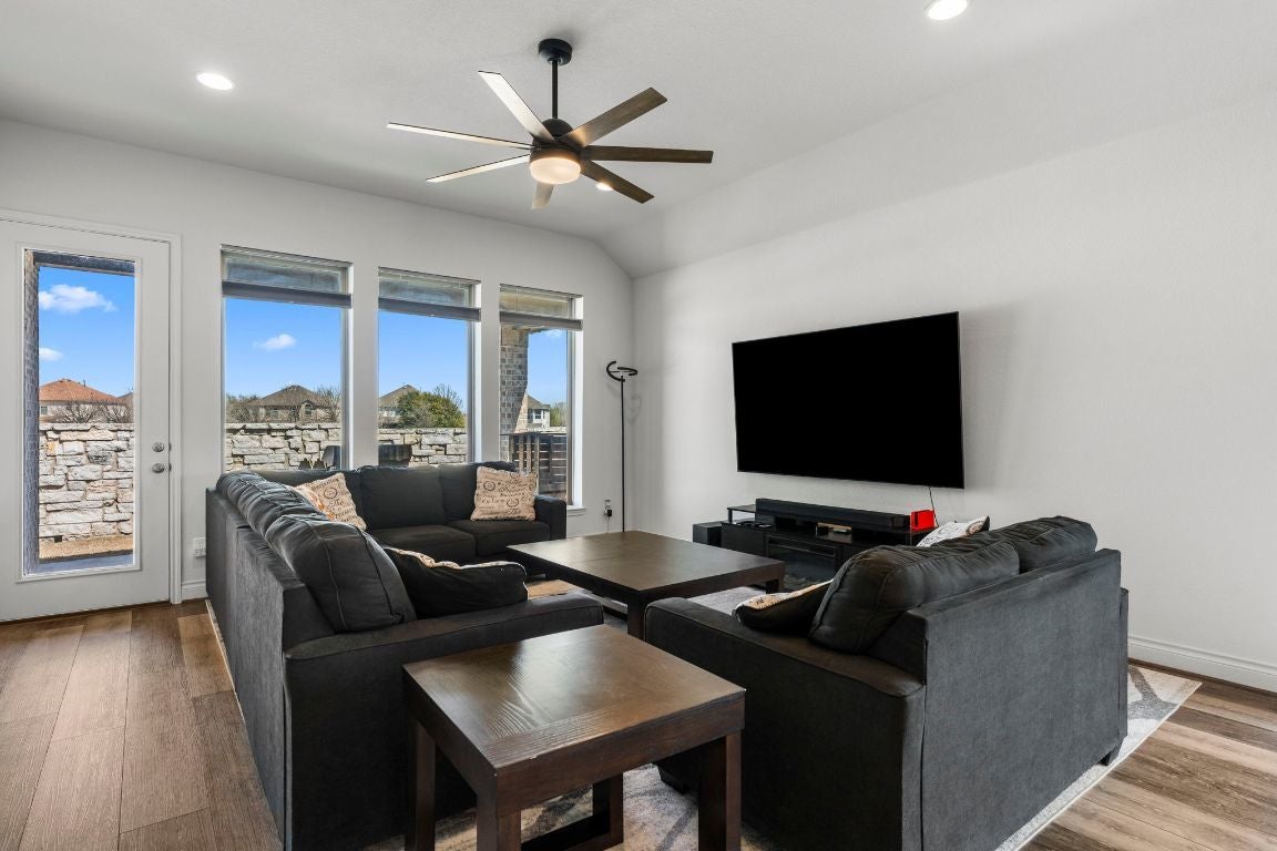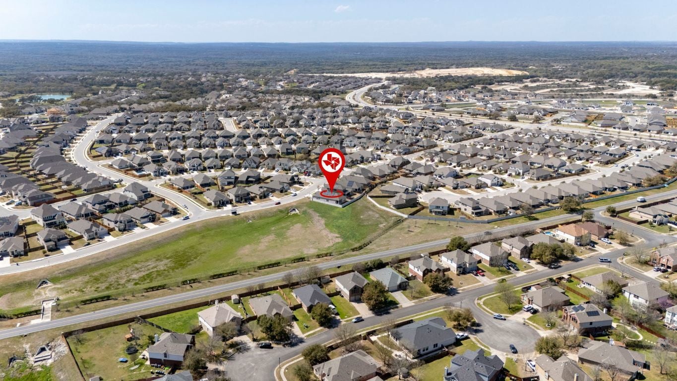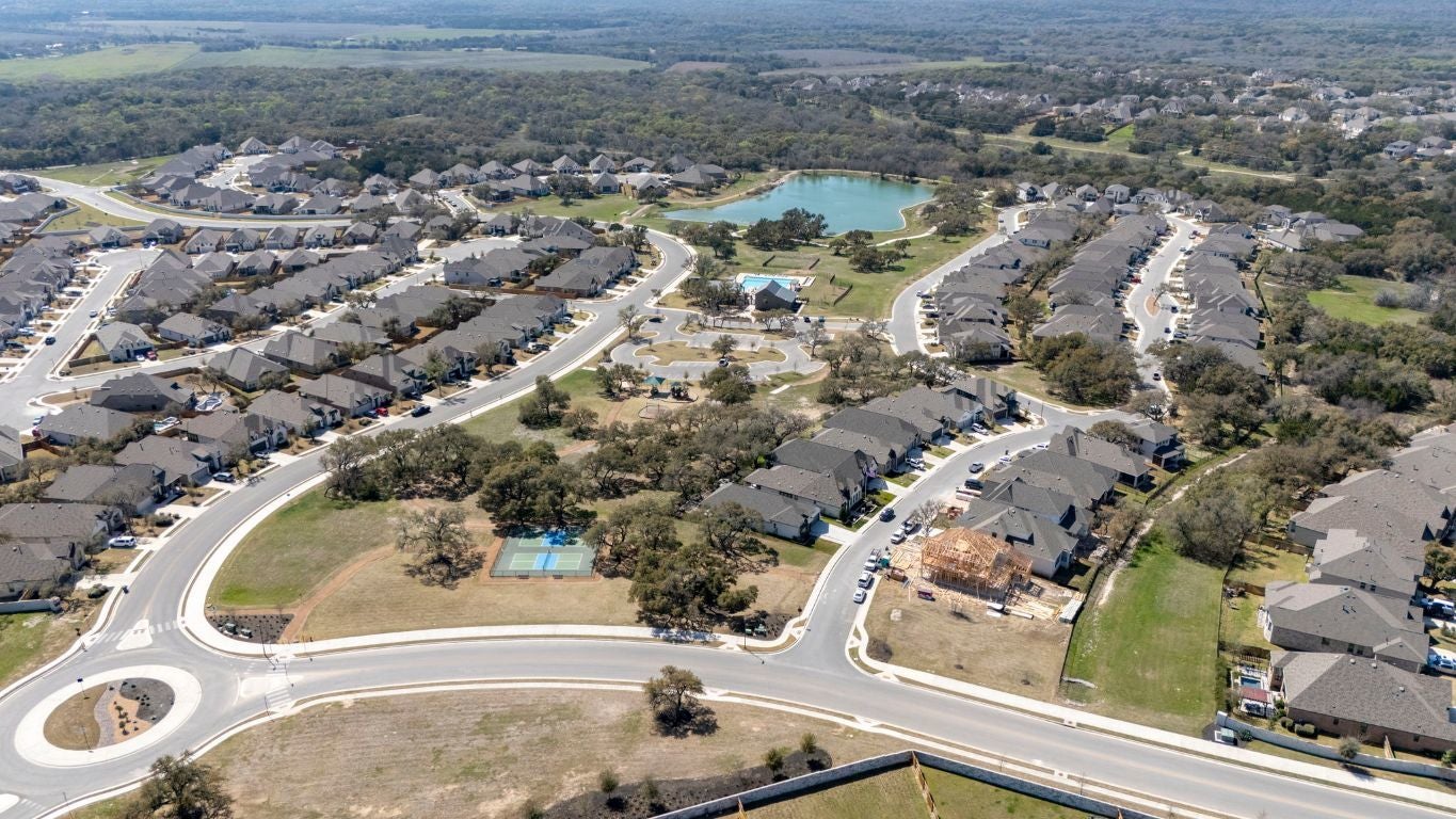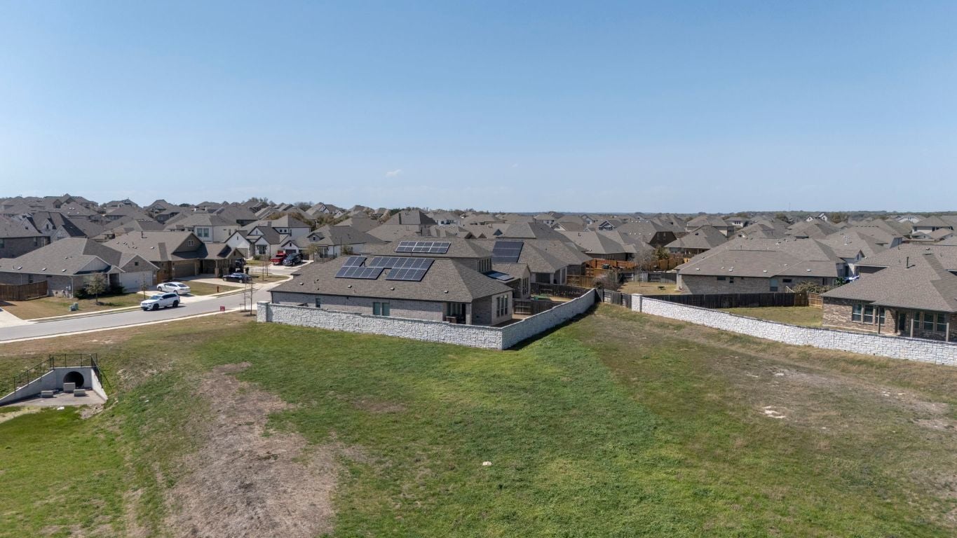 Modern, energy efficient 3/2 single story on corner greenbelt lot in upscale 6 Creeks. Nearly new 2021 home with over $60K in upgrades: owned solar, Tesla Powerwall, Tesla/EV charger, whole home water softener/filtration, smart thermostat/doorbell, gutters, full sprinklers. Open concept with luxury vinyl plank, bright living area, and kitchen with quartz counters, SS appliances, gas range, large island, and pantry. Private primary suite overlooks greenbelt with dual vanity bath, oversized walk in shower, and walk in closet. Covered patio, no rear neighbors, established landscaping. Unobstructed view of the coveted and recently relocated Stagecoach Heritage Oak. Enjoy 6 Creeks amenities: pool, trails, parks, pickleball, fishing pond, and Hays ISD. Strong value vs nearby new construction with costly extras already included.