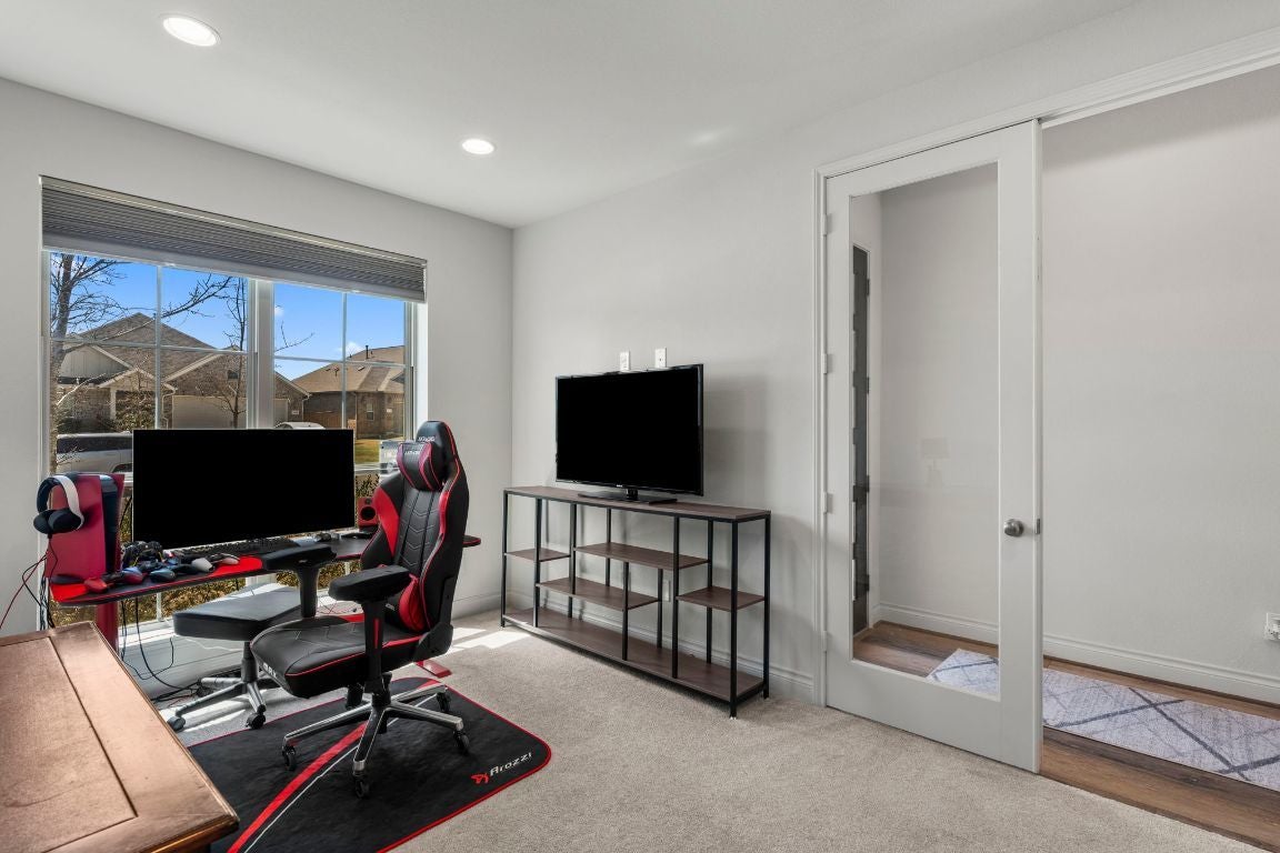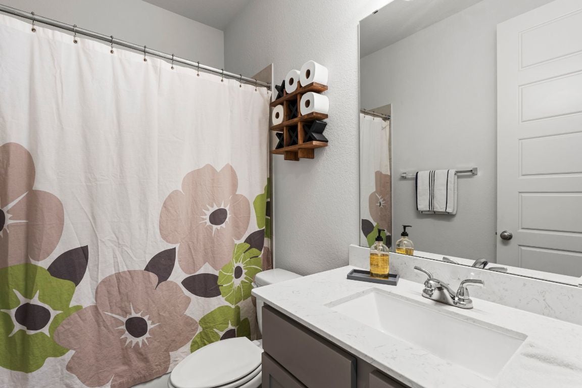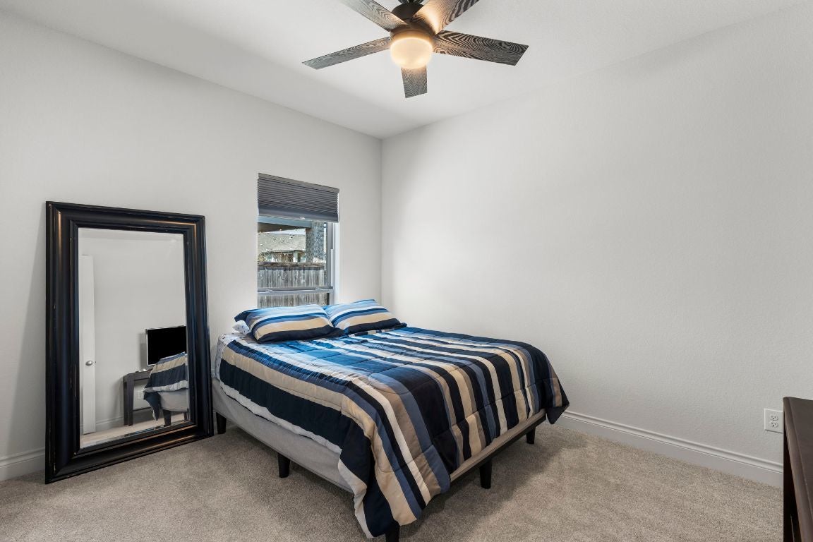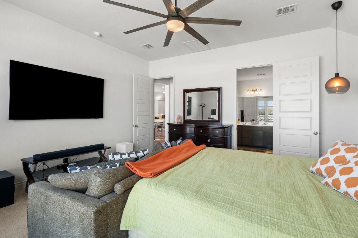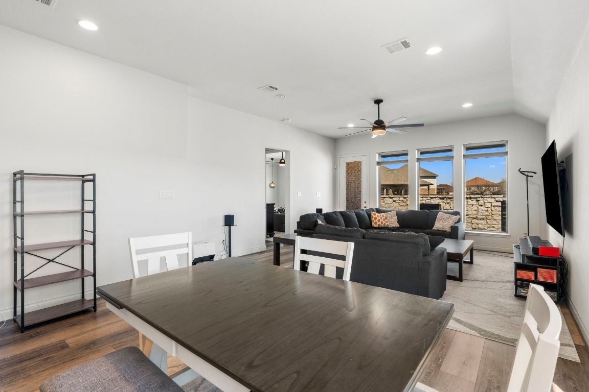Modern, energy efficient 3/2 single story on corner greenbelt lot in upscale 6 Creeks. Nearly new 2021 home with over $60K in upgrades: owned solar, Tesla Powerwall, Tesla/EV charger, whole home water softener/filtration, smart thermostat/doorbell, gutters, full sprinklers. Open concept with luxury vinyl plank, bright living area, and kitchen with quartz counters, SS appliances, gas range, large island, and pantry. Private primary suite overlooks greenbelt with dual vanity bath, oversized walk in shower, and walk in closet. Covered patio, no rear neighbors, established landscaping. Unobstructed view of the coveted and recently relocated Stagecoach Heritage Oak. Enjoy 6 Creeks amenities: pool, trails, parks, pickleball, fishing pond, and Hays ISD. Strong value vs nearby new construction with costly extras already included.