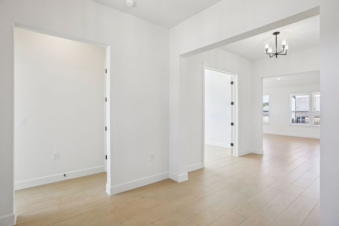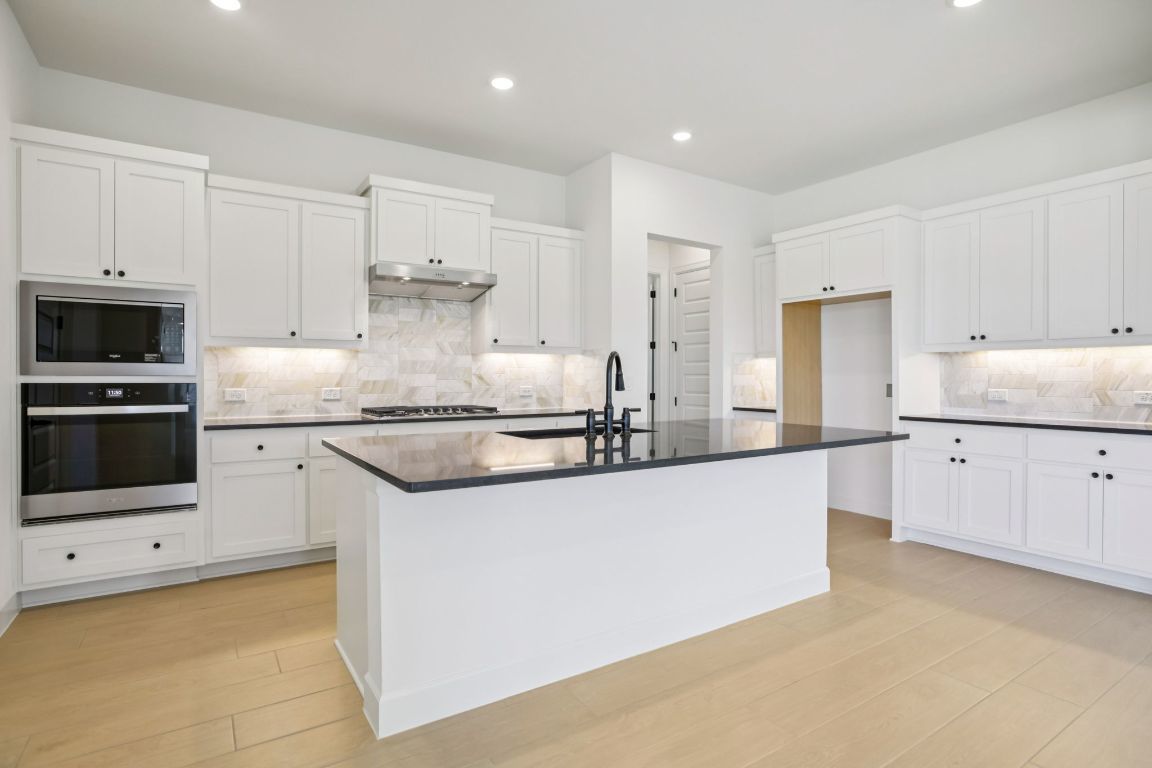 Monroe plan with upgraded kitchen, quartz countertops, upgraded tile flooring, optional study with double doors, Express cordless blinds