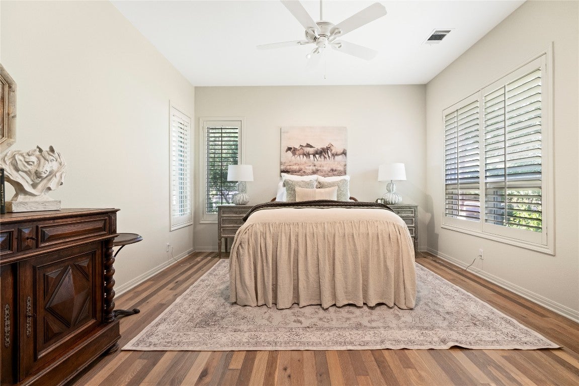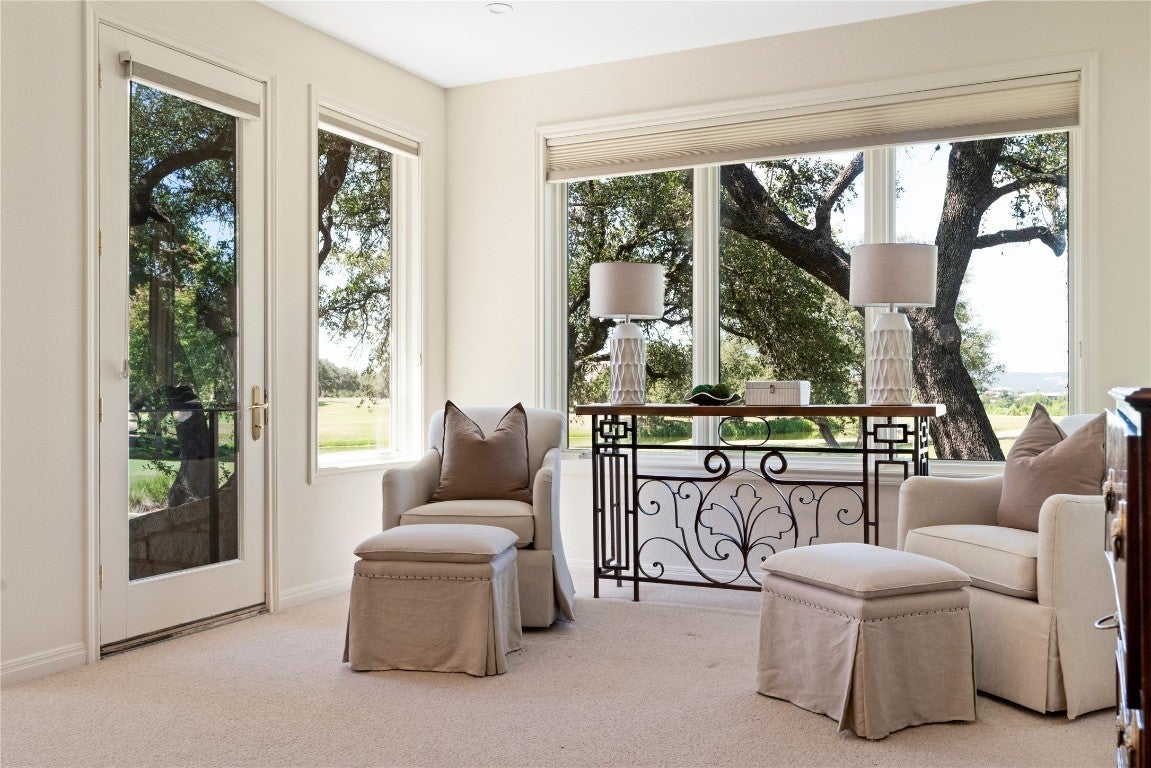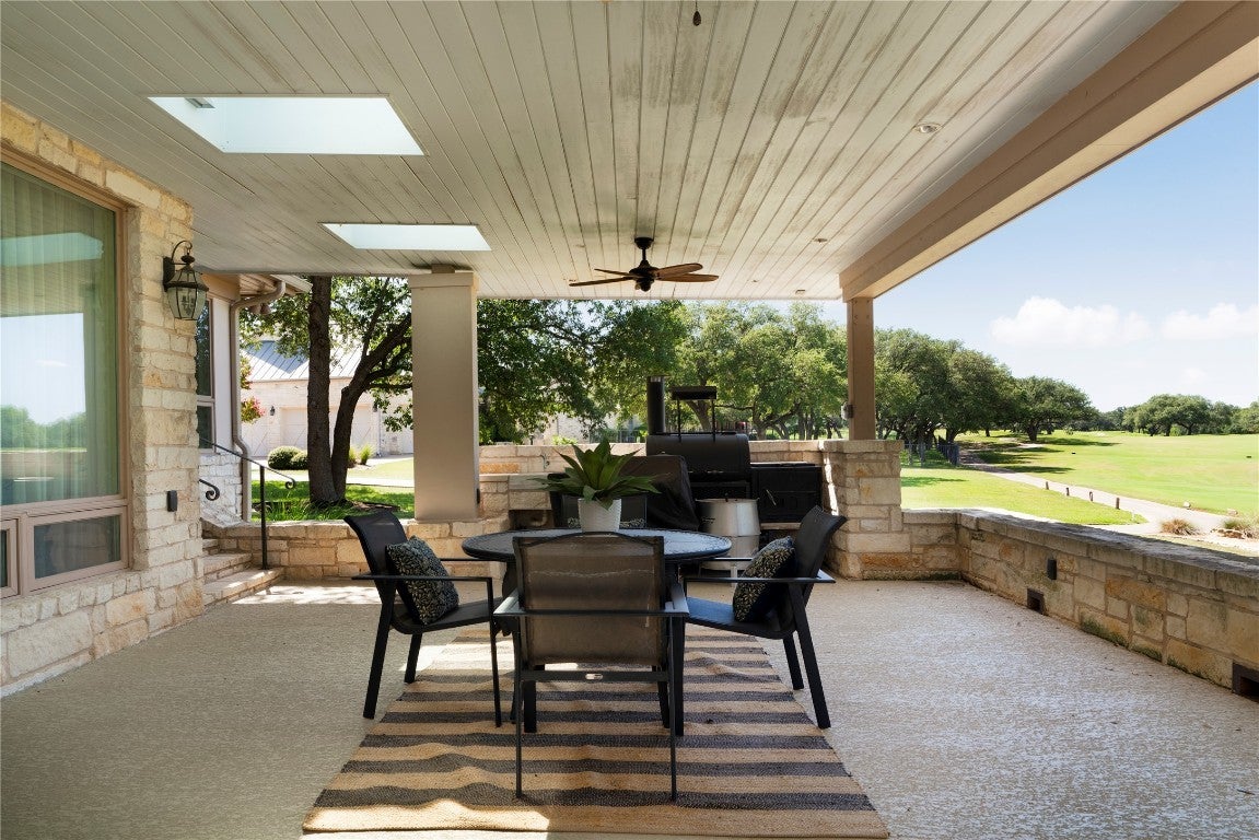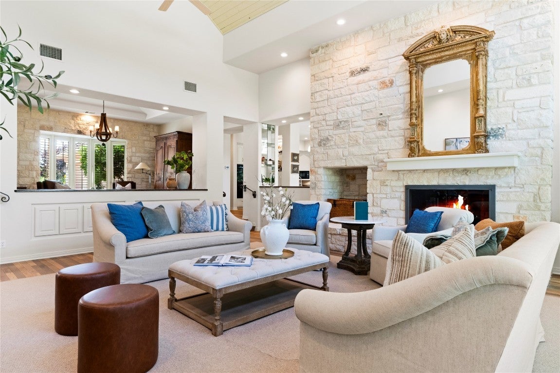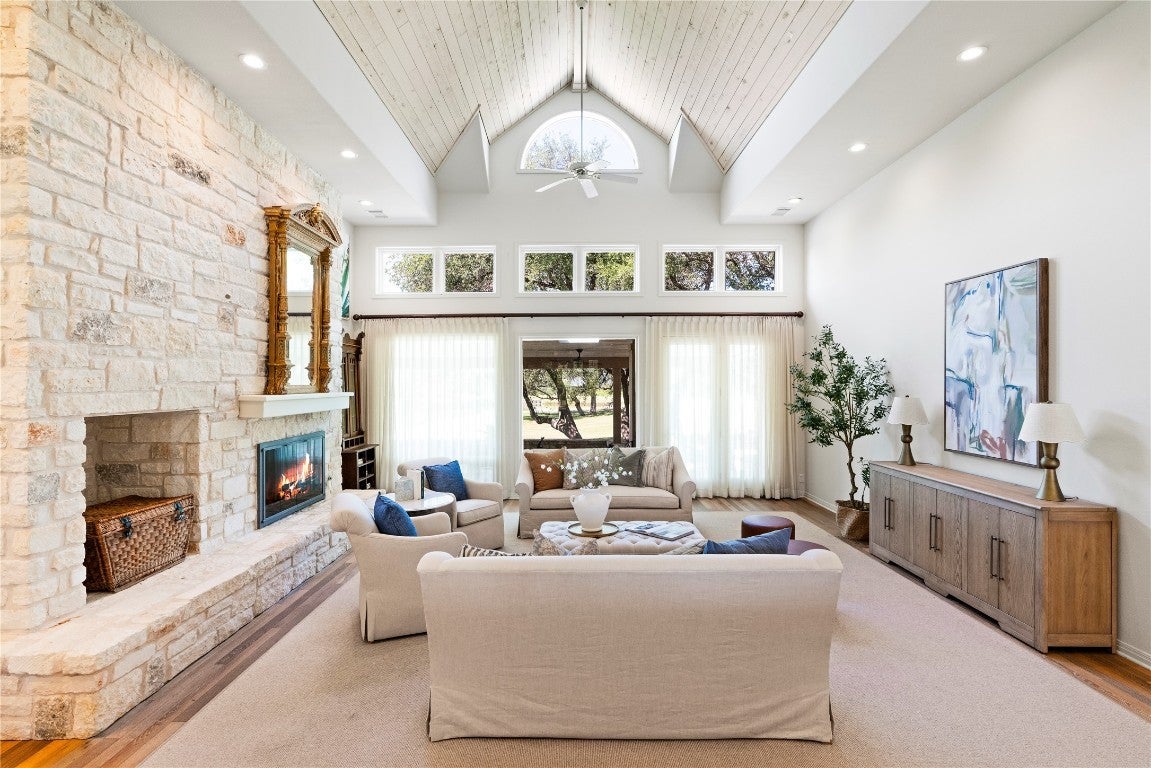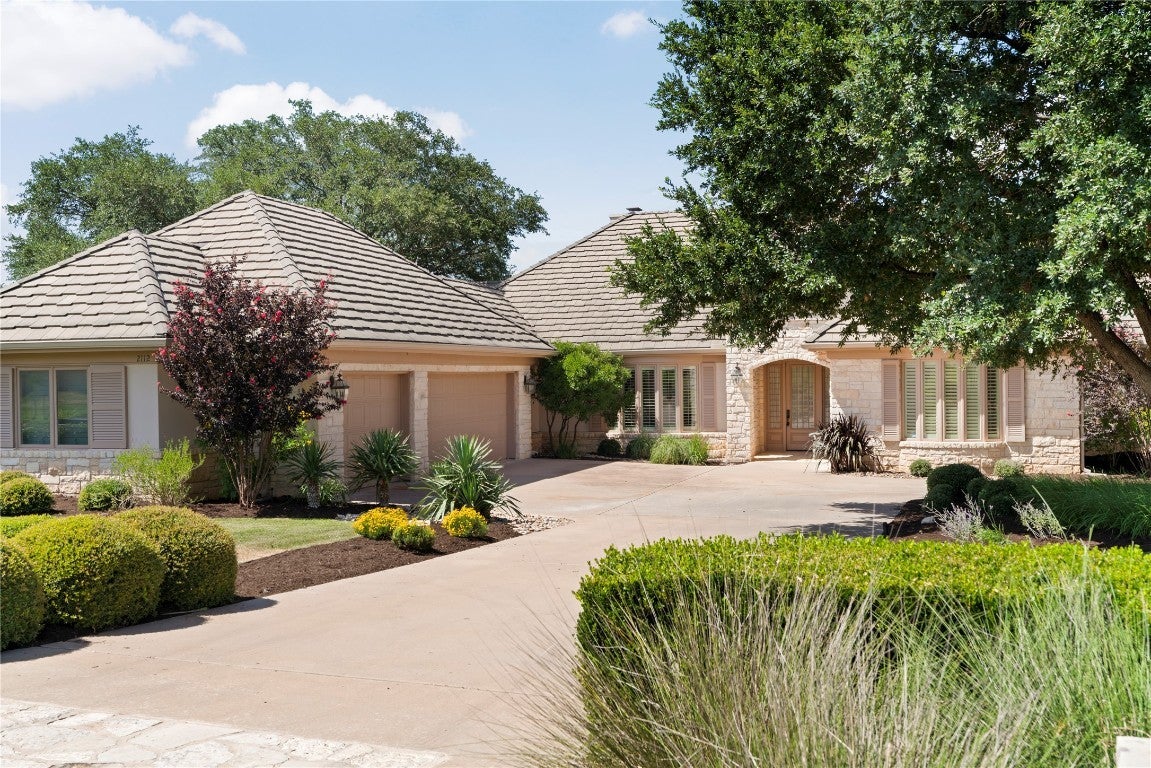 Architectural Elegance Meets Resort Living in Barton Creek Lakeside. Designed by renowned architect Dick Clark, this stunning single-story home is perfectly positioned on the 2nd green of the Arnold Palmer-designed golf course, offering panoramic views of the rolling hills, tranquil pond, and manicured fairways. Located within the exclusive gated community of Barton Creek Lakeside, residents enjoy lake access, a private marina, and an optional club membership with world-class golf and amenities. Step inside to discover soaring 20-foot vaulted ceilings and an abundance of natural light pouring into the main living space. The open-concept kitchen features granite countertops, two pantries, and flows seamlessly into the living and dining areas—perfect for entertaining. The spacious primary suite is a private retreat with a dedicated lounge area and a spa-inspired bathroom. Two additional ensuite bedrooms boast recently renovated bathrooms and wood floors. Unwind or host al fresco on the expansive covered patio, complete with a built-in sink and custom smoker grill—all overlooking peaceful pond views. The 3-car garage includes two large storage closets, built-in cabinets, and even an ice maker, while the oversized utility room offers ample counter space, a sink, cabinetry, and a second full-sized dishwasher to support your lifestyle. Convenient access to Lakecliff Golf Club, Stone House Vineyard, The Galleria at Bee Cave or Marble Falls for shopping and dining. This home is a rare blend of architectural pedigree, modern upgrades, and Hill Country luxury—all within a vibrant lake and golf community. Who says you can't have it all? Motivated seller, ready to sell.