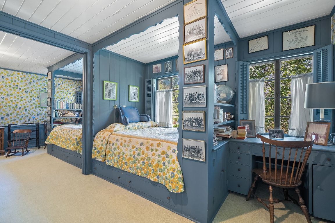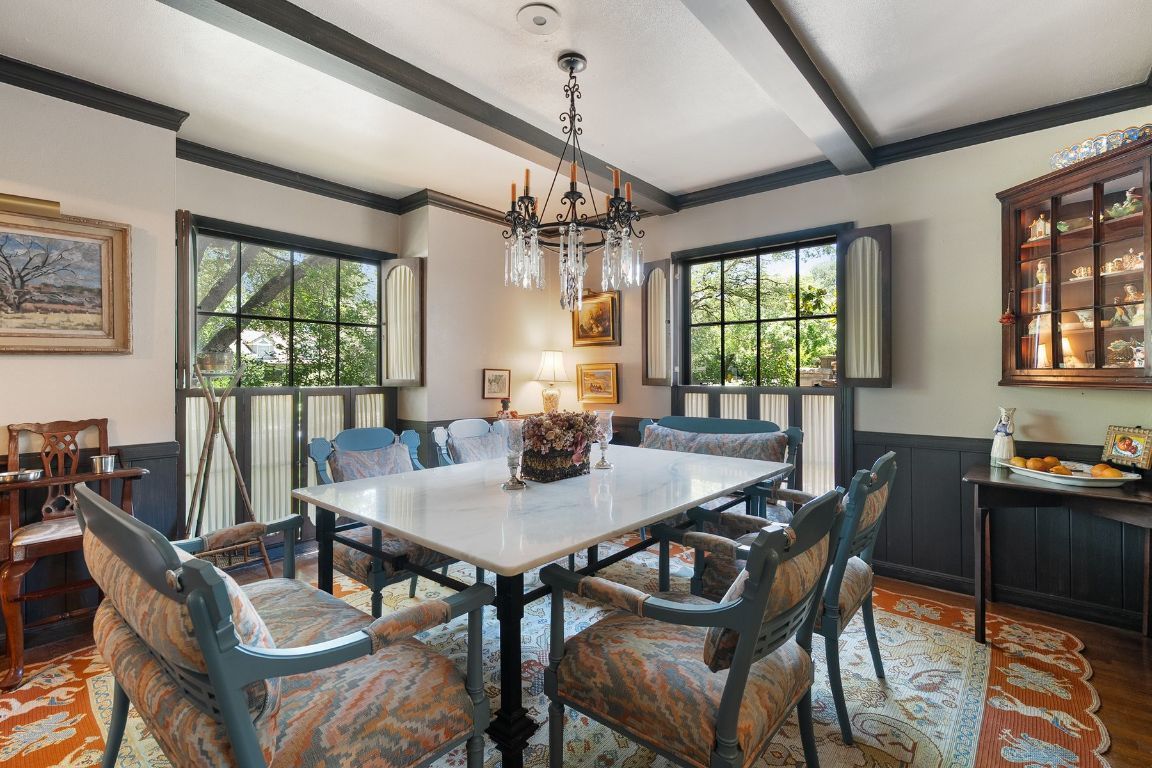 Located in the historic Pemberton Heights neighborhood, 1510 Gaston Avenue is a classic example of Georgian Revival architecture. Built in 1942 for the Corley family, this lovely traditional home has only had two owners and is now offered for sale for the first time in over 60 years. The floor plan was designed to accommodate a large family and features a beautiful formal living room and a spacious great room, both with wood-burning fireplaces. The formal dining room and kitchen are connected by a walk-through butler’s pantry, and a wet bar adjacent to the kitchen and breakfast area is ideal for entertaining. A downstairs primary bedroom suite was added in the 1980s and features a double bath, a dressing room with his and hers walk-in closets, a fireplace and sitting area, and French doors leading out to the backyard and patio. Upstairs are four additional bedrooms including unique built-in beds and dressers, three baths, and a playroom or office. Outside, the large swimming pool with vintage lion fountains is the focal point of the private backyard. The attached two-car garage provides parking and additional storage with direct access to the interior of the home.