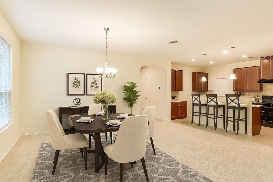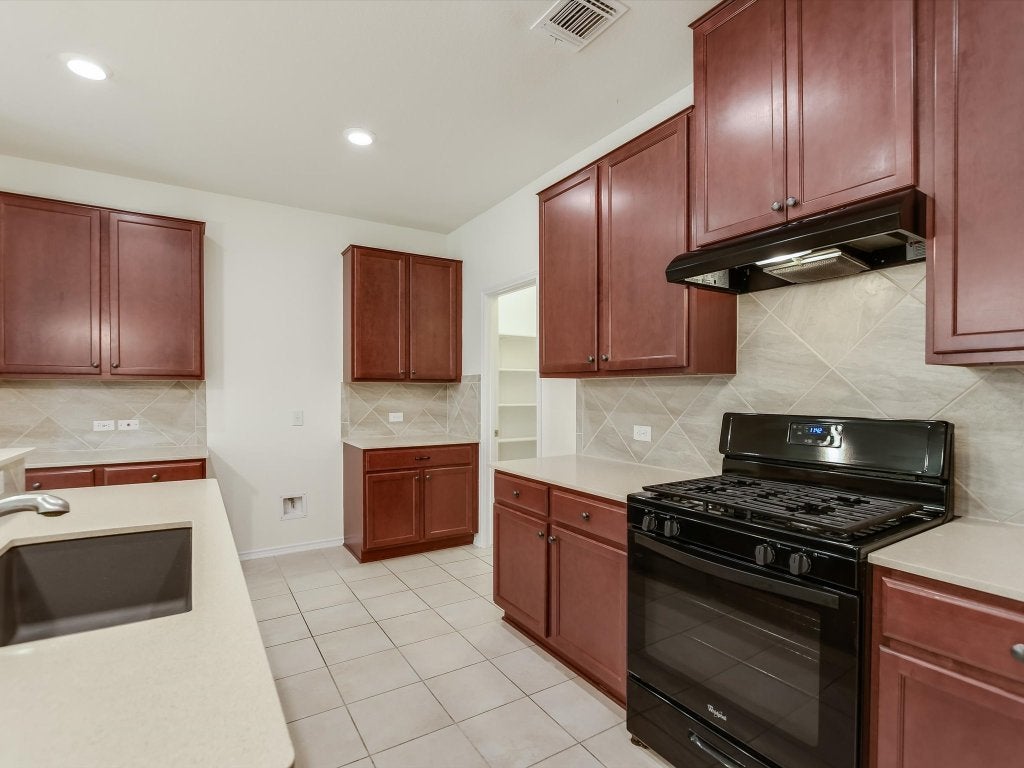 Motivated Seller. New Roof on 6/2024/ New Paint 6/2024/ New Carpet 6/2024. Open kitchen w/46" recessed-panel birch cabinets in Cinnamon, Silestone countertop, gas cooking range & huge walk-in pantry. Master suite features walk-in closet,& lg mud-set tile surround walk-in shower. Raised Dual vanity sinks in both master & guest baths. Tile flooring in the kitchen, entry & baths, upgraded panel interior doors. Exterior French door off great room & extended covered patio stubbed for gas grill. Sprinkler system & water softener. Security System Installed.