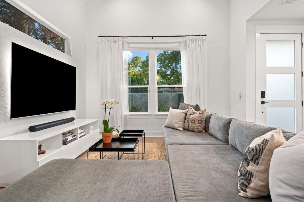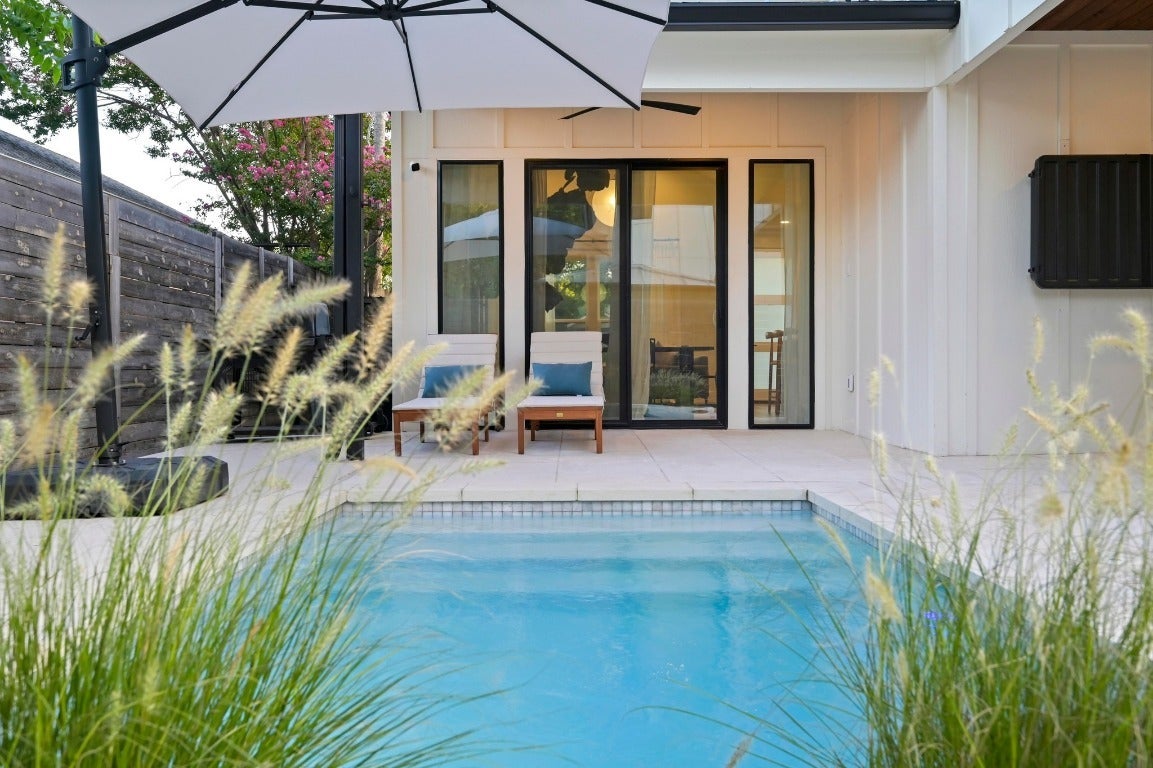Welcome to your dream home in the heart of East Austin, a thoughtfully designed 4 bedroom, 3.5 bath residence with no HOA fees, tucked away on a quiet street surrounded vibrant city living. This three-story luxury retreat offers modern curb appeal and multiple outdoor spaces including two covered balconies, two covered patios, and a fenced-in yard perfect for entertaining, letting kids play, or giving your pups room to roam. Step inside to find wood and tile flooring throughout, designer fixtures, soaring ceilings in the main living area, and an abundance of natural light that makes every space feel bright and inviting. The first floor features an open concept kitchen, dining, and living area with seamless flow, ideal for hosting. The spacious primary suite is a true sanctuary, complete with its own private patio, a luxurious bathroom with natural stone finishes, dual vanity, walk-in shower, and a generous walk-in closet with modular built-ins. Upstairs, two guest bedrooms each open onto their own private covered patio, and a cozy loft area offers the perfect nook for a home office or reading space. The top floor features a fourth bedroom and full bath, ideal for guests, a home studio, or nanny quarters. Enjoy thoughtful touches throughout, including custom-built modular storage systems in the closets to maximize space and functionality. Outside, enjoy a limestone back patio, beautifully walled front yard for added privacy, and a refreshing jetted pool designed for swimming laps or lounging in the sun. Additional highlights include a water purification system with reverse osmosis and remineralization, built-out garage storage, and even downtown views. Located just blocks from trails, parks, community centers, breweries, and East 6th Street, this home is the perfect balance of luxury and lifestyle. Don’t miss the opportunity to call this rare gem yours.