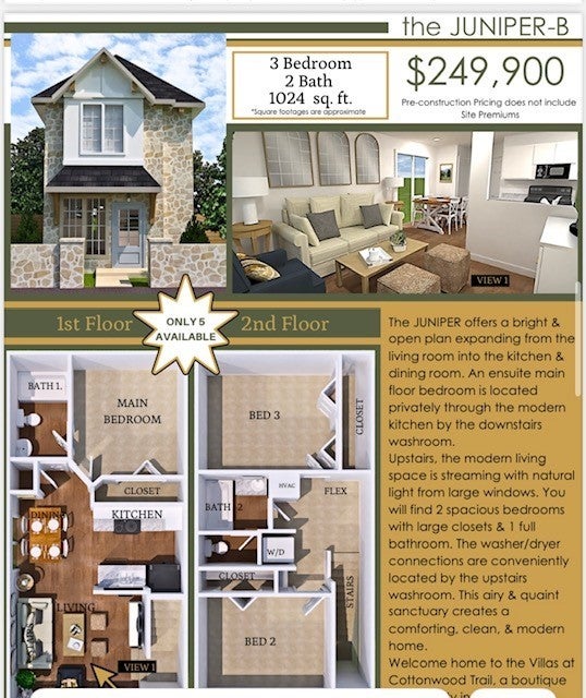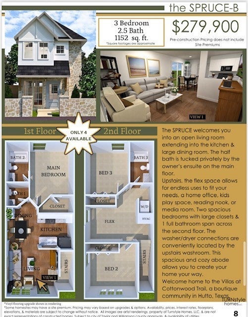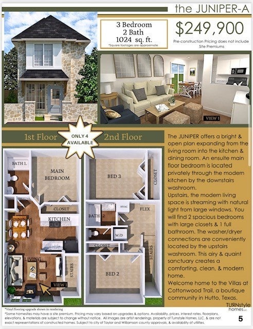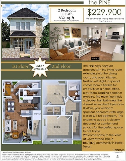 Brand New Stand-Alone Condos Under $300K! Discover the Villas at Cottonwood Trail in Hutto, TX — a charming boutique community offering only 22 site-built homes starting from just $229,900, minutes from Austin, Tesla, Samsung, top schools, shopping, dining, and major highways for an easy commute. These beautifully designed stand-alone condos give you the privacy of a single-family home at unheard-of pricing in one of the fastest-growing areas in Central Texas! Each home comes with a private fenced yard, exclusive parking, low-maintenance native landscaping, and access to miles of scenic hike & bike trails connecting directly to Cottonwood Trail, Fritz Park, playgrounds, splash pads, athletic fields, and more — perfect for enjoying the outdoors and an active lifestyle. Choose from 3 thoughtful floor plans: the cozy Pine 2 bed/1.5 bath (starting at $229,900), the bright and modern Juniper 3 bed/2 bath (from $249,900), and the spacious Spruce 3 bed/2.5 bath (starting at $279,900) with flexible spaces perfect for home offices, playrooms, or reading nooks. These new homes bring natural light, elegant exteriors, and comfortable layouts designed to enhance everyday living. For buyers seeking a personal home, this is a rare opportunity to own a brand new stand-alone condo under $300K — pricing you simply won’t find elsewhere in the Austin metro area! Investors will appreciate the excellent rental potential with estimated long-term rents of $1,500–$1,900/month per unit, along with the flexibility for mid-term and short-term rentals (Airbnb, Vrbo, Booking.com) for potentially higher returns, supported by strong rental demand driven by the nearby tech corridor, employers, and rapid area growth. Don’t miss your chance to own a new home or investment property in a boutique community where lifestyle, affordability, and convenience meet. Site premiums may apply. Buyer to verify all information and numbers.