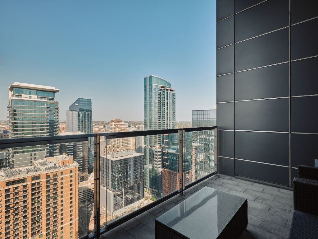 A penthouse residence in the iconic W Austin Hotel and Residences, this 2,899-square-foot showpiece by acclaimed local architect Michael Hsu's Office of Architecture epitomizes sophisticated urban living. Soaring 14-foot ceilings and expansive glass walls showcase breathtaking 360-degree views of Austin's western hills, downtown skyline, and Lady Bird Lake from two wraparound terraces. Hsu's signature minimalist aesthetic shines through luxurious white leather accent walls, a sculptural brushed bronze fireplace, rich wood floors, and custom vanilla larch Bulthaup cabinetry. This three-bedroom, four-bathroom residence features thoughtful details including a custom living room loft, automated window shades, and the rare convenience of a three-car enclosed garage plus separate storage. Enjoy full access to the W Hotel pool, gym, steam room, yoga, and Away Spa. Experience the perfect fusion of architectural distinction and five-star W Austin amenities in this once-in-a-lifetime penthouse opportunity.