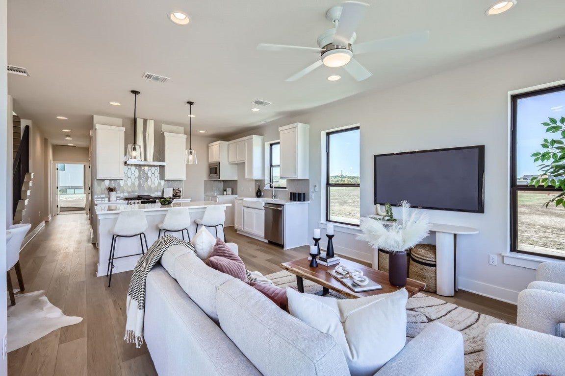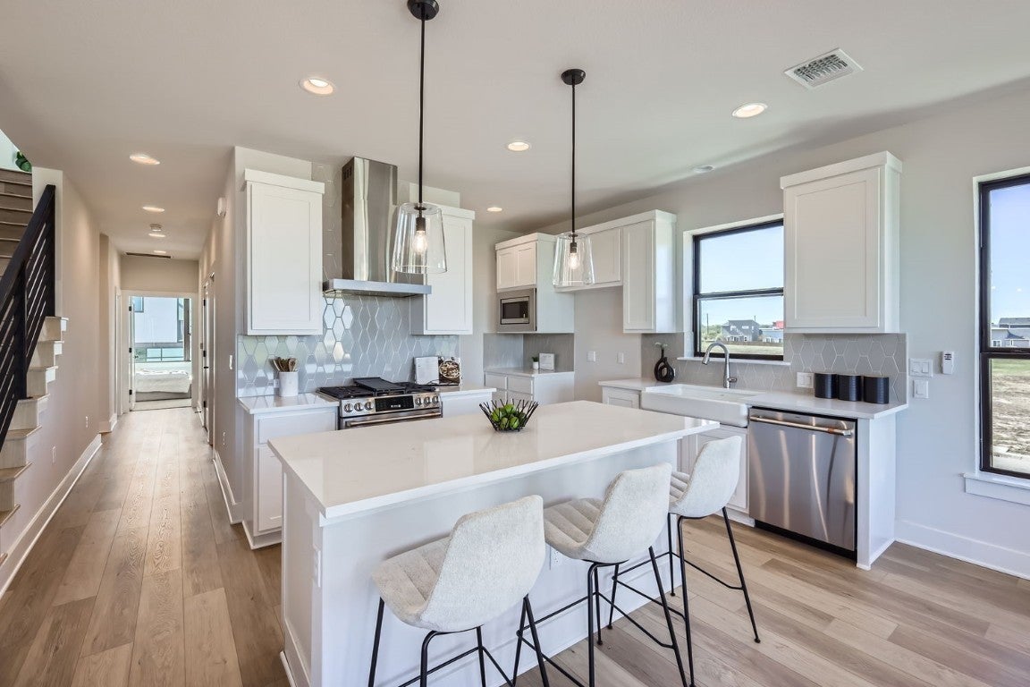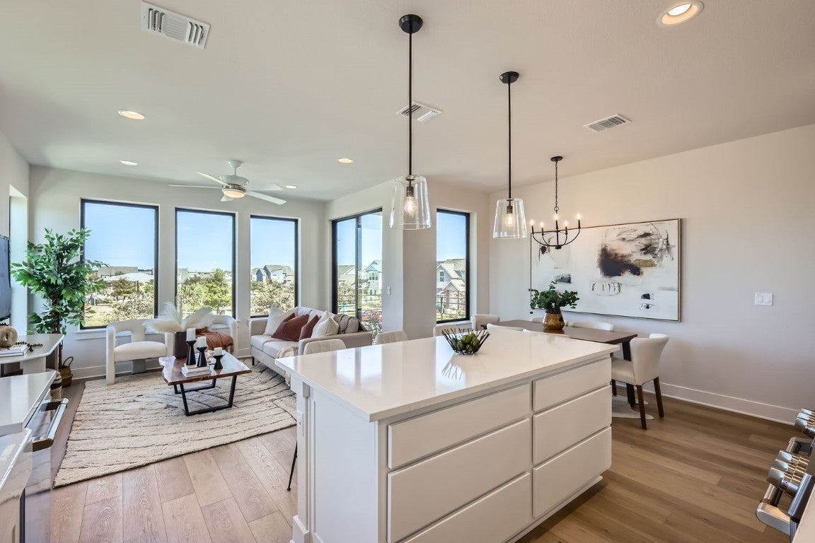 The Ramble series is a very limited collection of 3 bedroom homes featuring elevations that compliment Goodnight Ranch and the new urbanism vibe. Unobstructed downtown views! Modern style with high-end finishes. Step into this beautiful 3-bedroom, 3.5-bathroom home which boasts a 2-car garage and 2,443 sq.ft. of living space, featuring Downtown Austin skyline views from your third story balcony! On the main floor, you’ll find two spacious bedrooms and large storage rooms to keep the home organized. The second level was designed with intimate areas to relax and unwind, and is where the home’s open-concept kitchen, dining area and family room reside. An impressive primary bedroom can also be found on this floor, located at the front of the house. The third floor’s exceptional game room and massive porch is ideal for entertaining parties of all sizes, complementing the 2-car garage which accommodates families with multiple vehicles. * Please see Onsite for all details - subject to change without notice.**