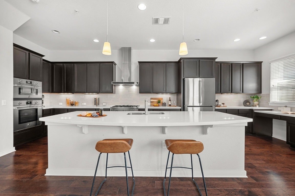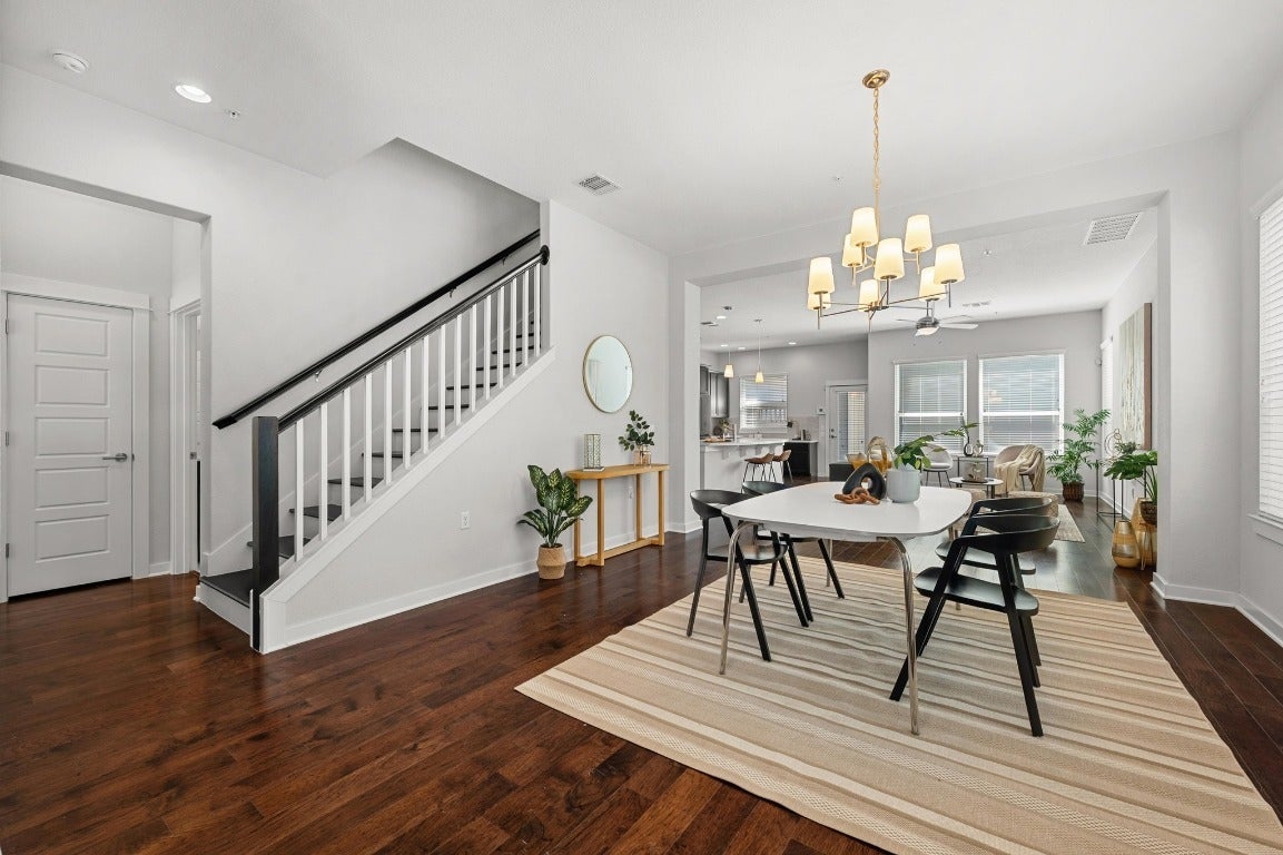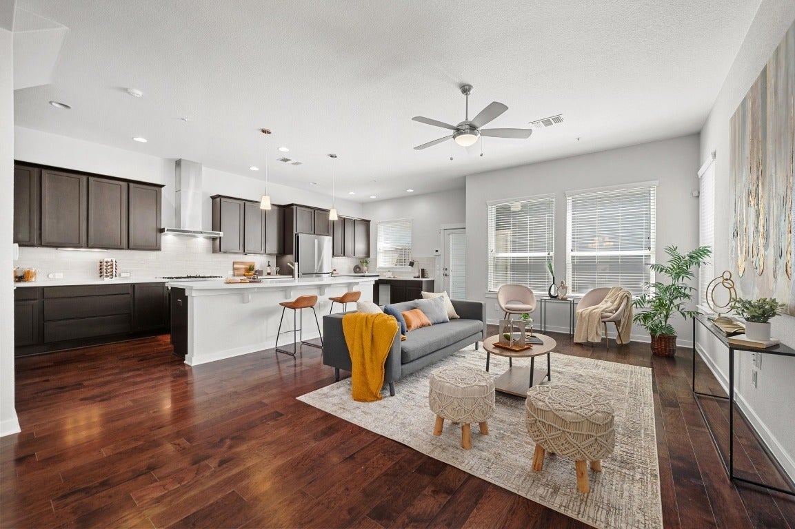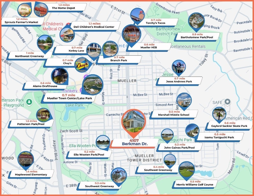 HOA covers exterior insurance and maintenance (including roof), landscaping, parks, pools, and trails. With 2,244 sq ft to spread out, this is one of the largest two-story townhomes in Mueller. As you enter, you're welcomed by an abundance of natural light pouring in through a wall of windows, casting a glow on the engineered hardwood floors that flow seamlessly throughout. The living and dining spaces invite you to relax or entertain, while the downstairs room, which easily converts into a guest bedroom or office, provides the flexibility you’ve been searching for; plus a rare full bathroom on the main floor. For those who love to cook, the kitchen is nothing short of a dream, with high-end Bertazzoni professional series appliances, including double wall ovens and a 5-burner gas cooktop with cast brass burners. The thoughtful design continues with under-cabinet lighting, a built-in desk, and ample cabinetry. Upstairs, the primary suite feels more like a retreat than a bedroom with a cozy sitting area, corner windows, and 2 walk-in closets. The ensuite bath features a soaker tub and separate shower. Convenience doesn’t stop inside. A high-tech security system with remote access to the front door and garage door, keyless entry, and a front door camera are all part of the package. Outdoors, forget the yard work, it's all handled by the HOA, leaving you with more time to enjoy Mueller’s best amenities. Want more private space? Extend the fence line (see docs)! From the two community pools and multiple parks to the weekly farmers market, you'll love the walkability. And with restaurants, HEB and Sprouts, and public transportation nearby, it’s easy to see why this urban location is a local favorite. Just a short 4.3-mile drive to downtown Austin and 2.3 miles to the University of Texas, this home offers the perfect mix of convenience, luxury, and a dash of neighborhood charm.