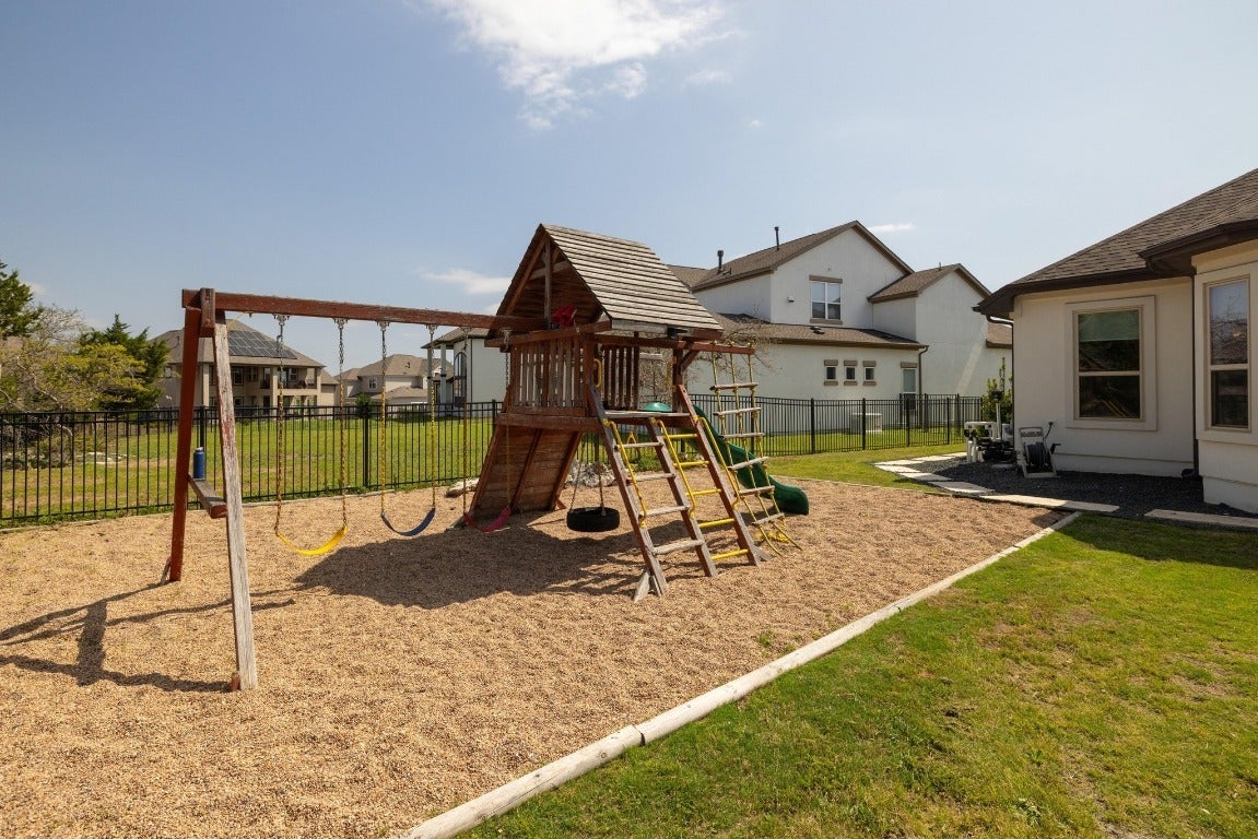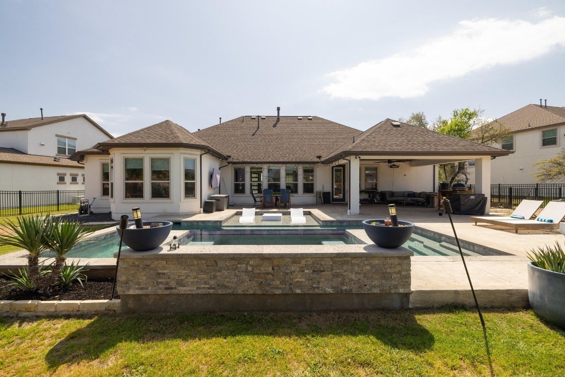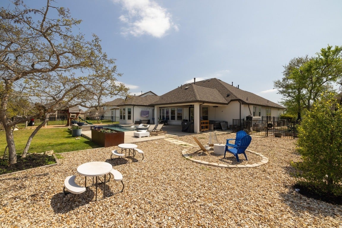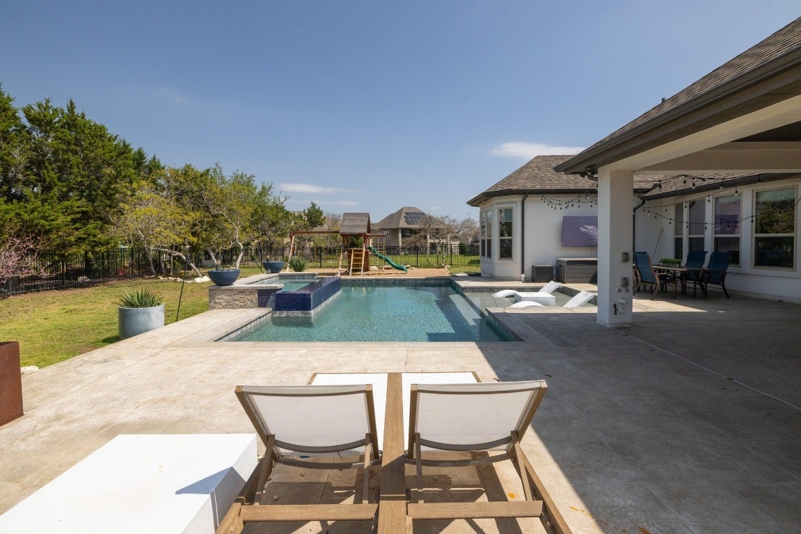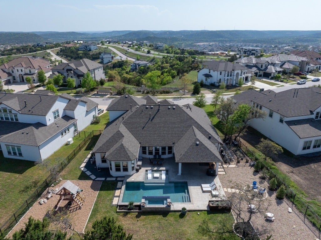 Nestled in the prestigious Travisso community, this magnificent 5-bedroom, 4-bath home offers breathtaking Hill Country views and luxurious living at its finest. Designed with elegance and comfort in mind, the open-concept layout seamlessly blends style and functionality. The spacious living areas are perfect for entertaining, while the upstairs media room provides a private retreat for movie nights. Step outside to your backyard oasis, complete with a large covered porch, sparkling pool with spa, a garden, and a playground—ideal for relaxation and fun. With no direct neighbor in front, enjoy gorgeous unobstructed hill country views from the front yard. A 3-car garage provides ample space for storage and parking. Travisso’s exceptional amenities include a state-of-the-art fitness center, clubhouse, parks, trails, a resort-style pool, and sport courts. Experience luxury, privacy, and breathtaking scenery in this stunning Hill Country home!