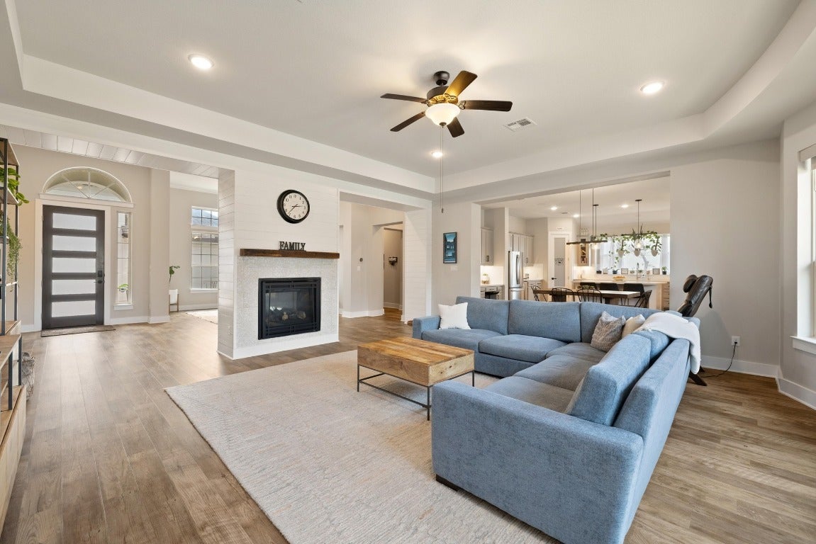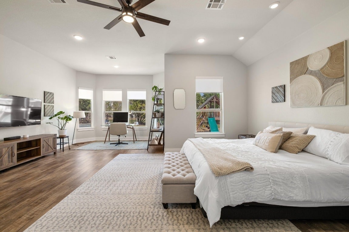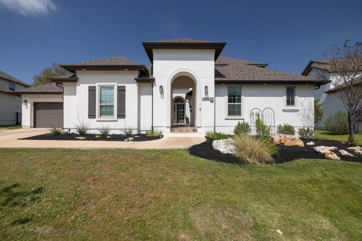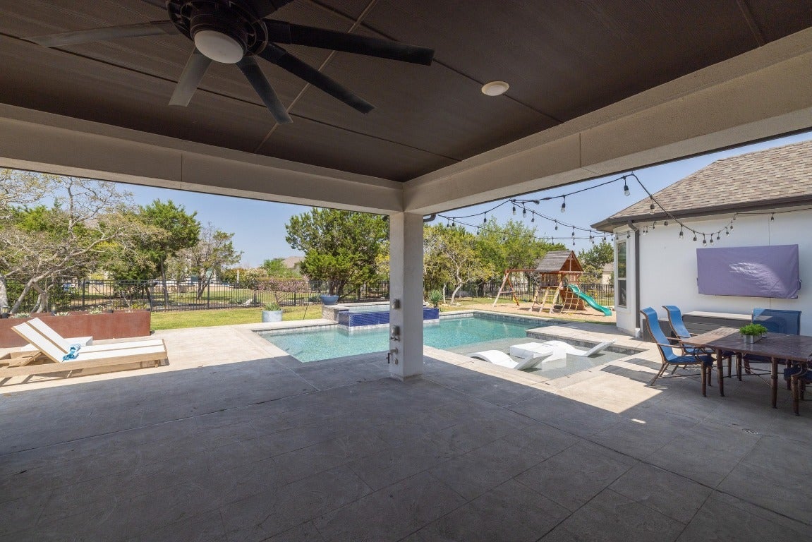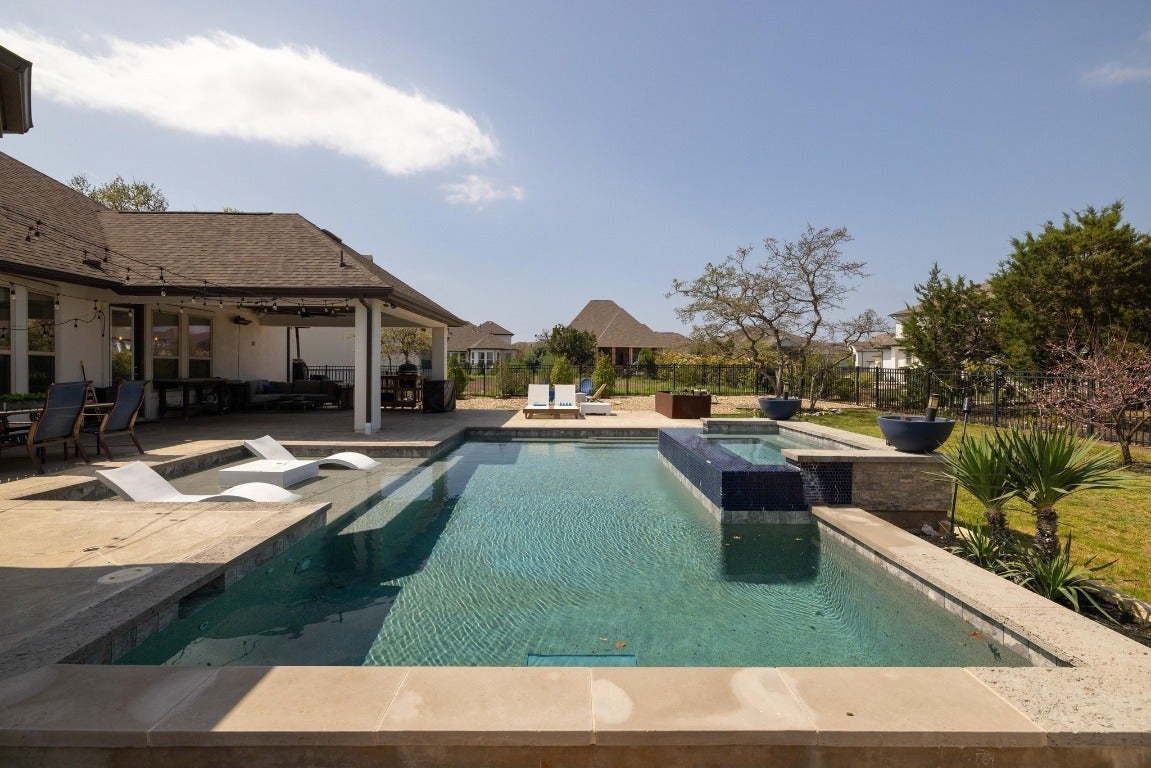 Nestled in the prestigious Travisso community, this magnificent 5-bedroom, 4-bath home offers breathtaking Hill Country views and luxurious living at its finest. Designed with elegance and comfort in mind, the open-concept layout seamlessly blends style and functionality. The spacious living areas are perfect for entertaining, while the upstairs media room provides a private retreat for movie nights. Step outside to your backyard oasis, complete with a large covered porch, sparkling pool with spa, a garden, and a playground—ideal for relaxation and fun. With no direct neighbor in front, enjoy gorgeous unobstructed hill country views from the front yard. A 3-car garage provides ample space for storage and parking. Travisso’s exceptional amenities include a state-of-the-art fitness center, clubhouse, parks, trails, a resort-style pool, and sport courts. Experience luxury, privacy, and breathtaking scenery in this stunning Hill Country home!