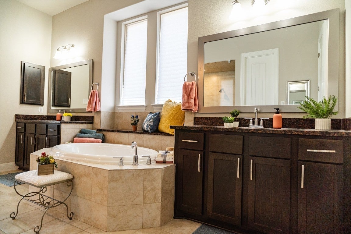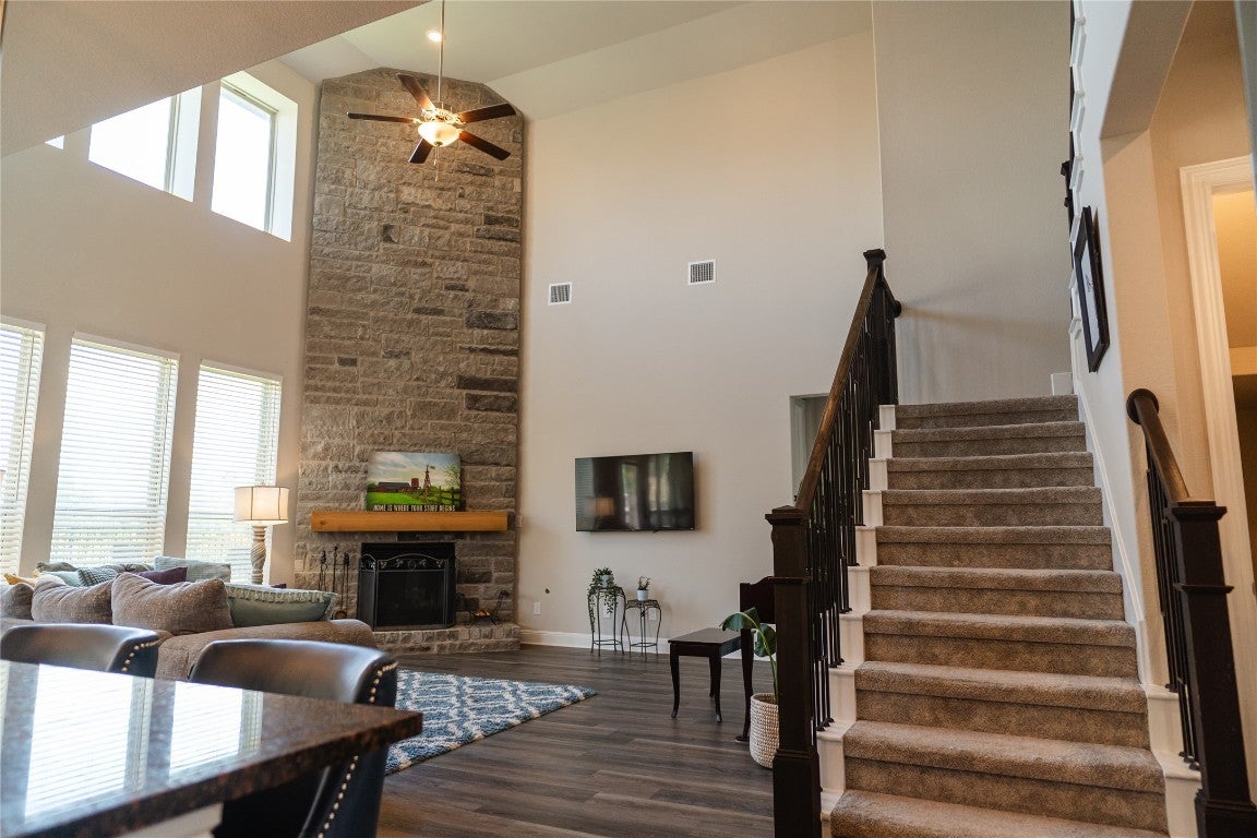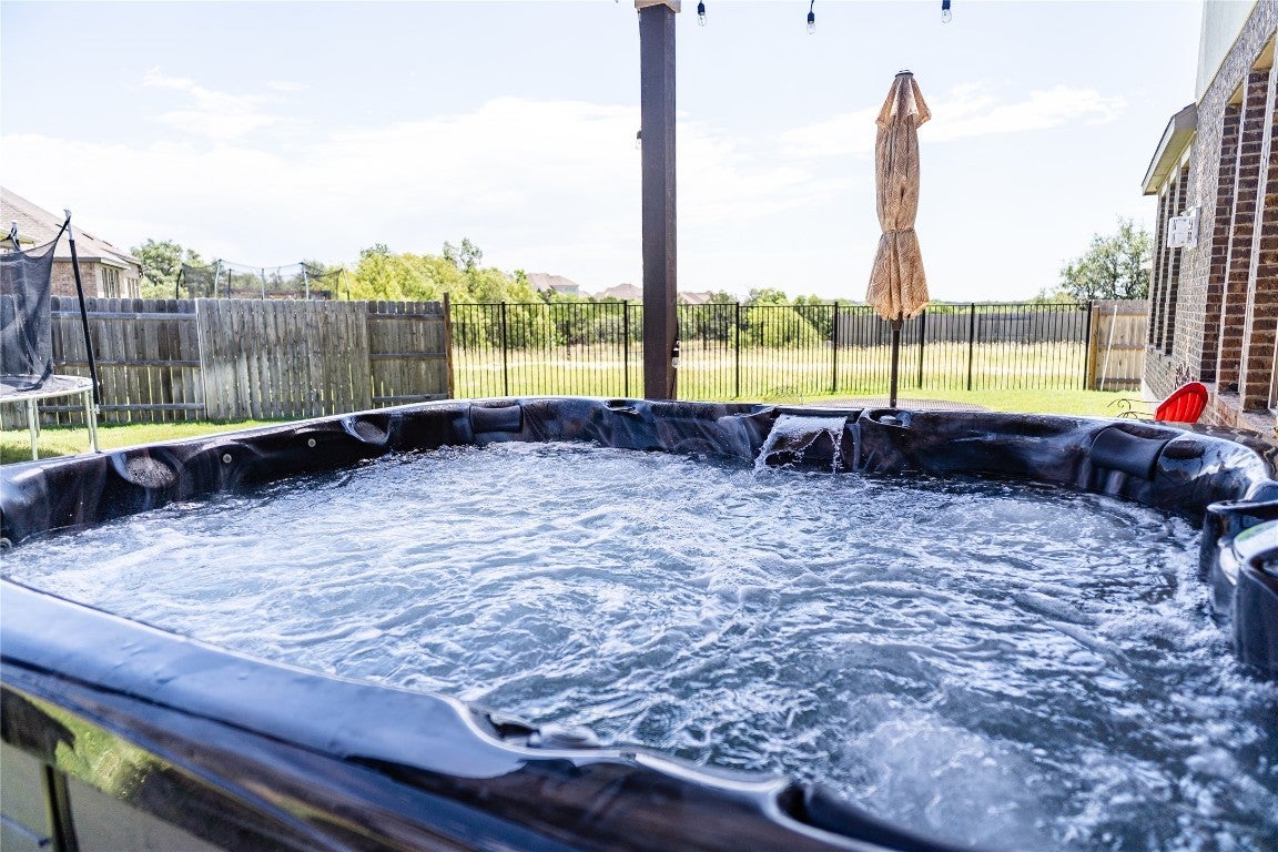 Luxurious Hill Country Retreat on Premier Cul-de-Sac Lot Set on the largest front yard in the sought-after Deerbrooke master-planned community, this exceptional 5-bedroom, 3.5-bathroom home offers 4,040 square feet of elevated living, thoughtfully designed for comfort, technology, and style. Positioned at the end of a quiet cul-de-sac with no neighbors to the north or west, the home enjoys unobstructed Hill Country views and immediate access to scenic nature trails. Inside, soaring ceilings, 8-foot doors, and a floor-to-ceiling blue marble limestone fireplace create an unforgettable first impression. The flexible layout includes a private home office (optional 6th bedroom), a formal living area, and a dedicated theater room pre-wired for 10-channel Dolby Atmos sound. A built-in ceiling speaker system in five rooms and motorized window shades in select spaces add to the home's high-end functionality and comfort. The kitchen is a showstopper, opening to the main living area and featuring elegant finishes throughout. The primary suite offers tranquil greenbelt views, a luxurious en-suite bath with a frameless dual-head shower, soaking garden tub, and a generous closet. Additional features include a laundry/utility room with sink and cabinetry, a rear-entry 3-car garage, gated access on both sides, and an invisible dog fence enclosing the expansive front yard. Enjoy full access to Deerbrooke's private neighborhood amenities, including a resort-style infinity pool, fitness center, amenity pavilion, dog park, and miles of hiking trails—all conveniently nearby. Zoned to award-winning Danielson Middle School and Glenn High School, this home blends luxury, convenience, and community like no other.