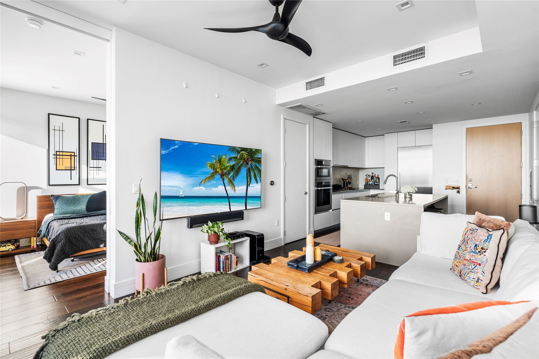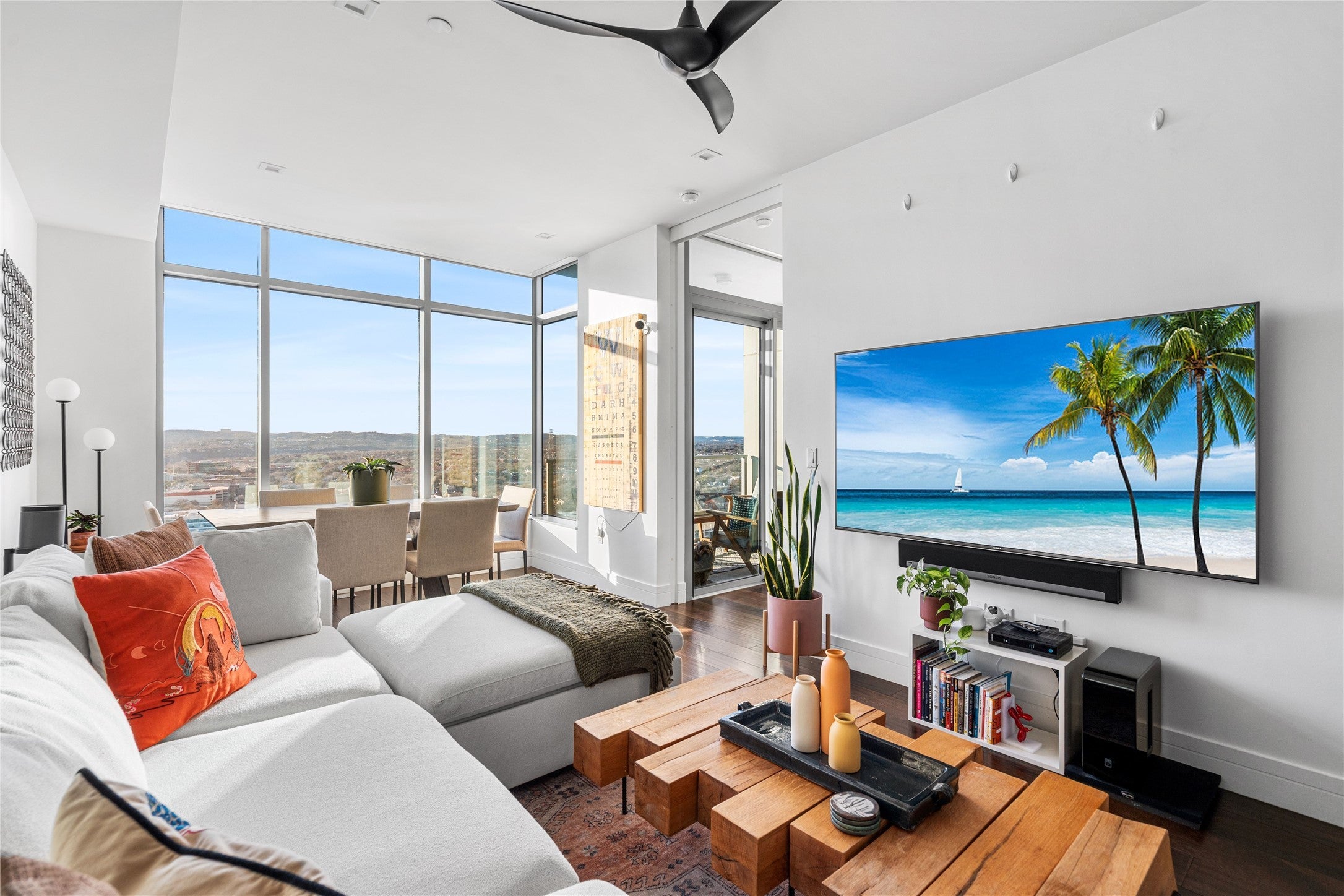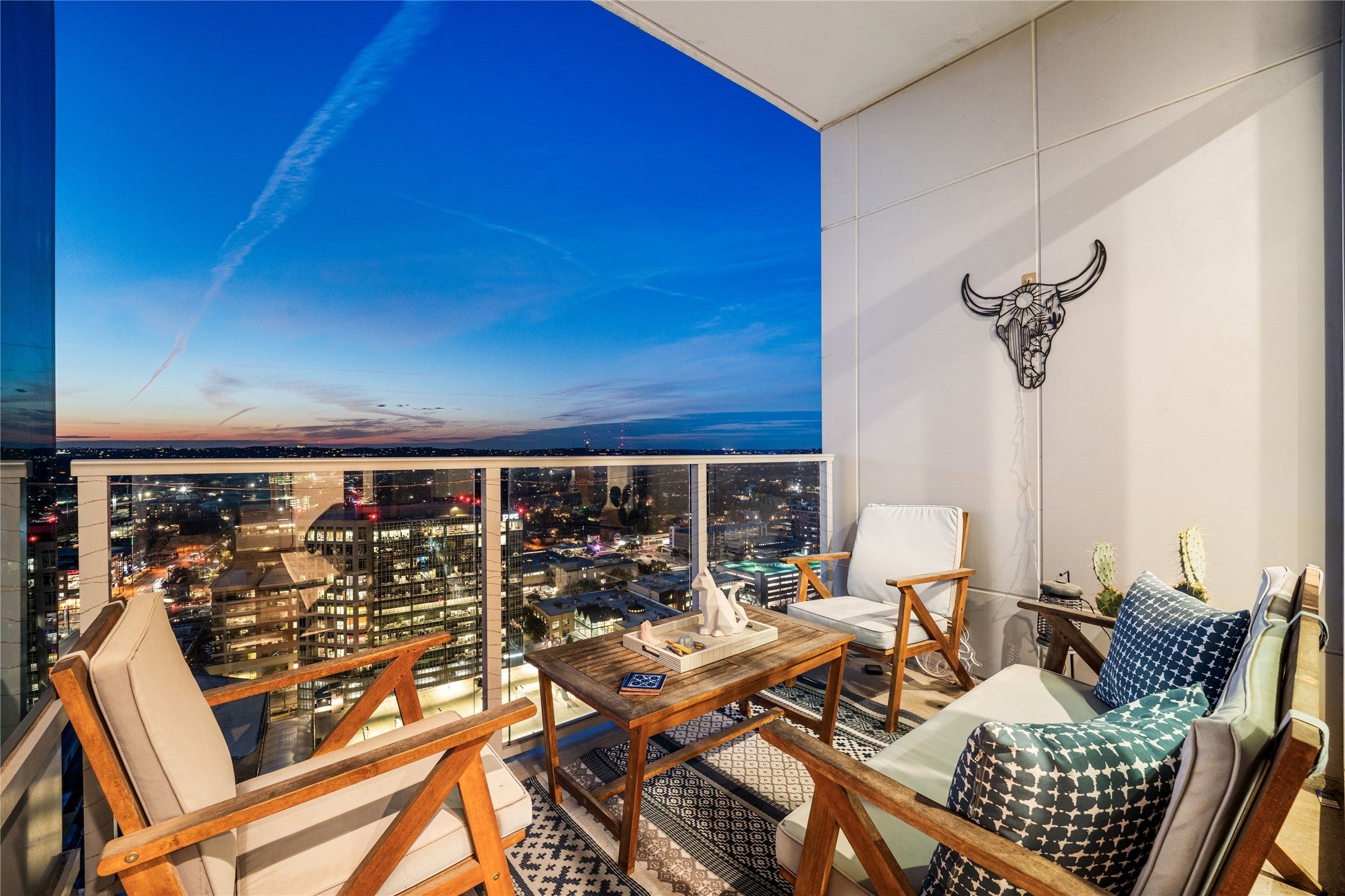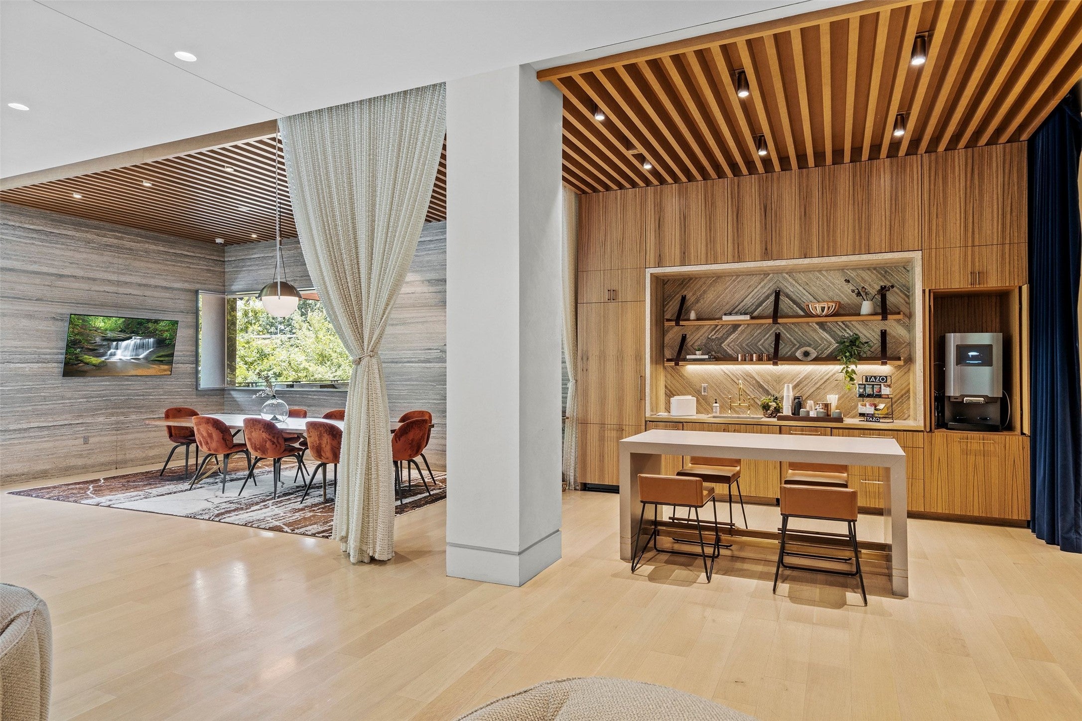 Imagine coming home as the sun slowly descends across the open western sky, painting it in gold, blush, and violet, knowing you have a front-row seat every evening. Designed by GDA Architects with interiors by Michael Hsu Office of Architecture, the building feels more like a statement: architectural, intentional, unforgettable. Inside, wide-plank hardwood floors lead you through a light-filled space where oversized windows frame sweeping west-facing views. Mornings glow softly with coffee in hand; evenings are drenched in golden hour. The waterfall-edge quartz island anchors the kitchen, becoming the natural gathering place; wine poured, dinner simmering on a full suite of Miele appliances, conversation lingering long after sunset. Automated shades, recessed lighting, Savant home automation, keyless entry, and a smart thermostat make comfort seamless and intuitive. The primary bedroom offers a quiet retreat. Marble detailing reflects the last light of day, dual vanities provide room to breathe, and a frameless glass shower invites you to unwind. A walk-in closet stands ready for whatever tomorrow brings. Beyond your front door, the lifestyle unfolds. Start your morning with a rooftop swim, fit in a workout or spin class downstairs, or host friends in the owner’s lounge and chef’s kitchen. Guest suites welcome visitors, while a pet spa, secure bike storage, private storage, and reserved garage parking add everyday ease. A 24-hour concierge greets you by name. The experience feels less like a condo and more like a boutique hotel you happen to call home. Step outside and you’re moments from Lady Bird Lake, the Hike & Bike Trail, Whole Foods, the Central Library, Seaholm, 2nd Street, and West Sixth. With a Walk Score of 95, the best of downtown Austin is simply part of your routine. This isn’t just a residence. It’s the rhythm of downtown at your doorstep and a home that glows with every sunset.