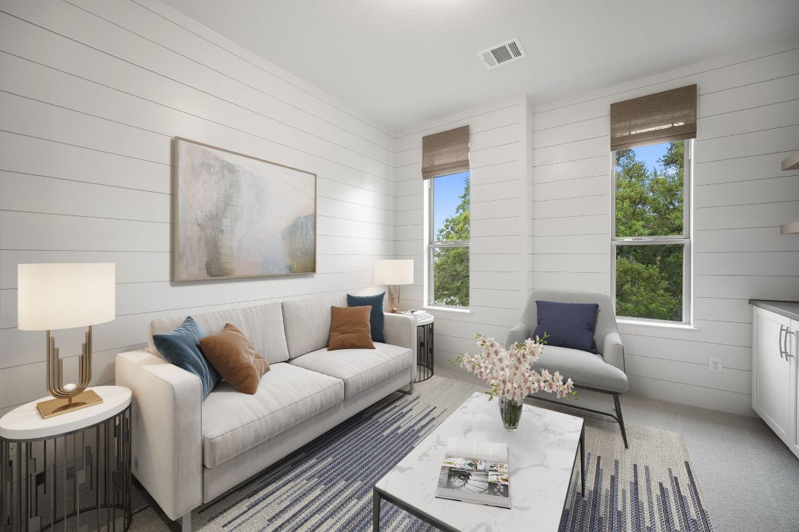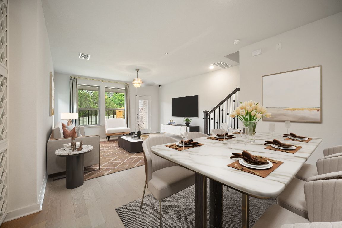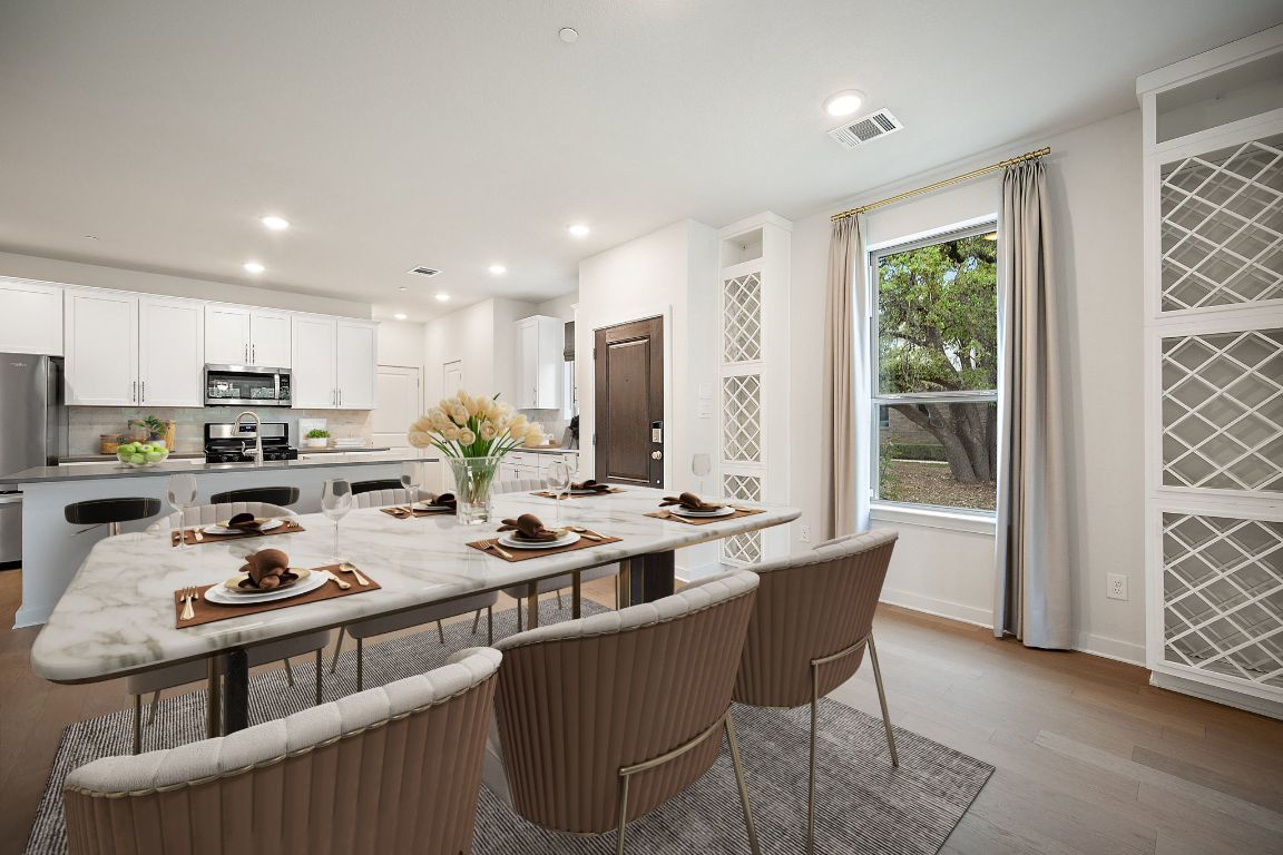 *** Please text listing agent for gate code *** Incredible 2-story end-unit ready for you! Former model home! The interior has tons of upgrades throughout including flooring, lighting and more. The luxury vinyl plank floors are stunning! The main areas are open to each other creating an inviting space for daily living and entertaining. The neutral palette throughout is tranquil and a blank canvas for you! Spacious living room with built-in wine rack. The kitchen features a center island, quartz counters, apron sink and stainless appliances. A game room is located upstairs with built-ins and shiplap walls. Private primary bedroom is located on the second level with a custom wood accent wall and attached bathroom offering a dual-sink vanity and walk-in shower. Two additional bedrooms are located upstairs and share a secondary bathroom. Powder bathroom is located on the main level. A covered patio opens to the backyard with greenbelt views. Enjoy a low-maintenance yard and landscaping! 2-car attached garage. There is a treed area next to unit with seating. LEED certified. Minutes away from Kalahari water park, schools, restaurants, shopping and more.