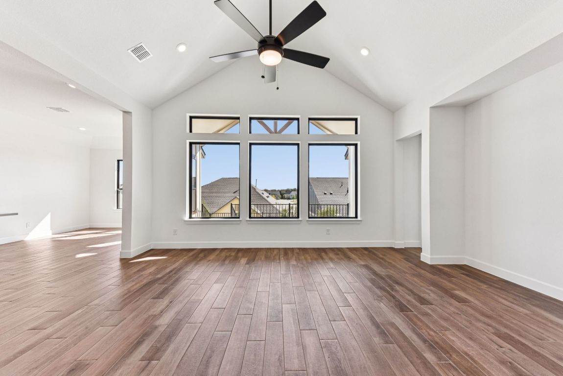 Spelman plan with upgraded kitchen, quartz countertops, tile flooring, optional study with double doors, optional shower in bath 3, optional tray ceilings in entry and foyer, optional cabinets in utility room with sink, upgraded windows to bronze framed, garage interior mounted tankless water heater