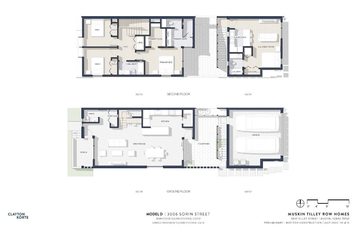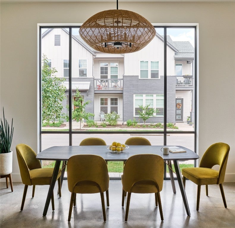 *Contact listing agent for information on all opportunities with Muskin Company including move-in ready options* This home is among the final phase of Muskin Company Row Homes in their nearly 20-years building high-end home in Mueller! Crafted by renowned local architecture firm Clayton Korte, w/ luxurious interiors from Slic Design, whose work has been featured in Architectural Digest & Vogue. This home offers a variety of flexible living options, with a 3-bedroom, 2.5-bath main house & full studio apartment w/ private entrance. This home is equipped w/ upscale touches including skylights, specialty concrete sink, terracotta tiles, artisan tile, plaster accent wall, solid wood cabinetry, energy-efficient metal roofs, and beautiful light fixtures handpicked to elevate the space. The open floor plan ushers you into an airy main room with stunning windows and modern lighting throughout the living and dining areas. The kitchen features a waterfall quartz countertop, Bosch appliances and custom wood cabinetry. A half bath & solid wood built-in, perfect for a desk or a bar, round out the main floor. Make your way to the second floor via a stairwell that’s framed by minimalist woodwork to find natural light pouring in through skylights. The primary suite enjoys large windows, custom built-ins in the closet, a floating vanity & an oversized frameless glass shower. Roomy secondary bedrooms flank the hall bath. The garage studio w/ private entrance sits at the back of the main house, beyond the patio. There’s ample room for living & sleeping, w/ a full bath, laundry hookups, & a petite but fully equipped kitchen. The space is perfect for an in-law unit, guest room, office, or short-term rental.