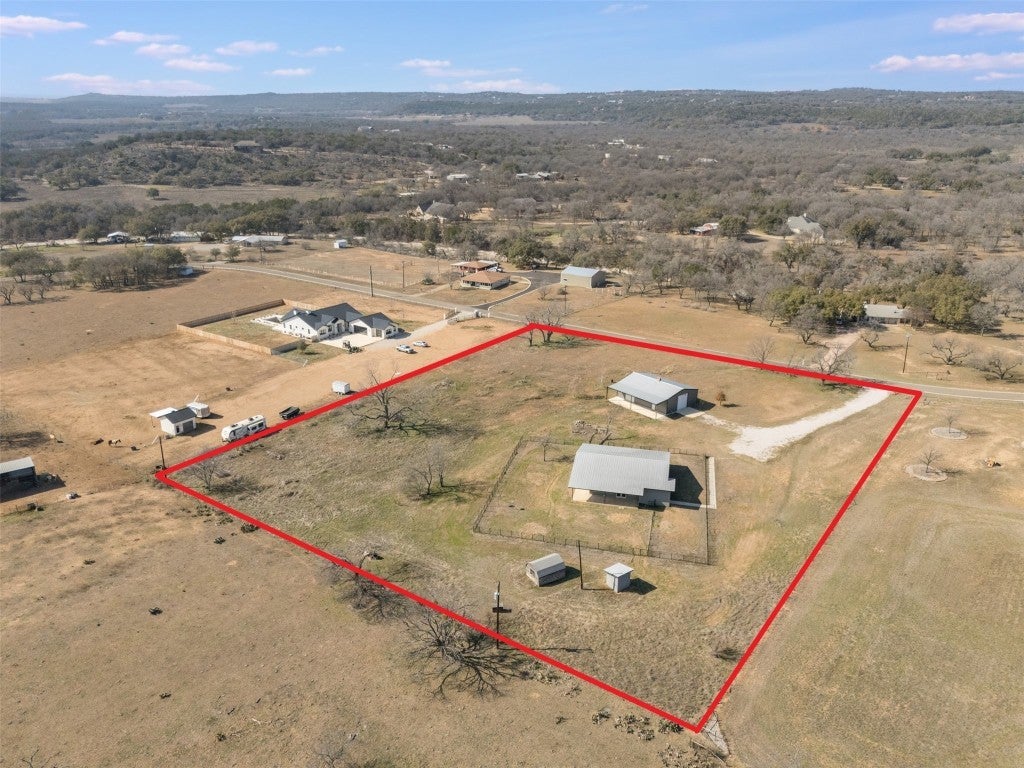 Hill Country Retreat with Endless Possibilities! Experience the perfect blend of country tranquility and city convenience with this stunning4-bedroom, 2-bathroom home, ideally located just minutes from Marble Falls in the sought-after Timber Ridge Community. Nestled on almost 4 acres, this 2148 sq. ft. home is bathed in natural light, offering breathtaking Hill Country Views! Step onto the wraparound covered porch, where you can enjoy your morning coffee or unwind in the evening, surrounded by a completely fenced yard. Inside, the open-concept design seamlessly connects the living, kitchen, and dining areas, featuring a large island and an oversized pantry/utility room for ultimate convenience. The split-bedroom layout ensures privacy, while the primary suite boasts a walk-in closet that doubles as a built-in saferoom/tornado shelter. Built to last, this low-maintenance, energy-efficient home features ICF (insulated concrete forms) and steel-framed construction, complemented by a durable metal roof. The polished concrete floors, epoxy-finished concrete counter tops ,and versatile finishes make it easy to personalize with an industrial, modern, or farmhouse aesthetic. For those needing extra space, the38' x 50' detached workshop/garage is a true standout! This 1,900 sq. ft. structure includes a full bath, multiple roll-up doors, spray foam insulation, water softener, RV hookup w/ septic & water, offering two types of RV plugs. With room to roam, work, and play, this exceptional property is move-in ready!