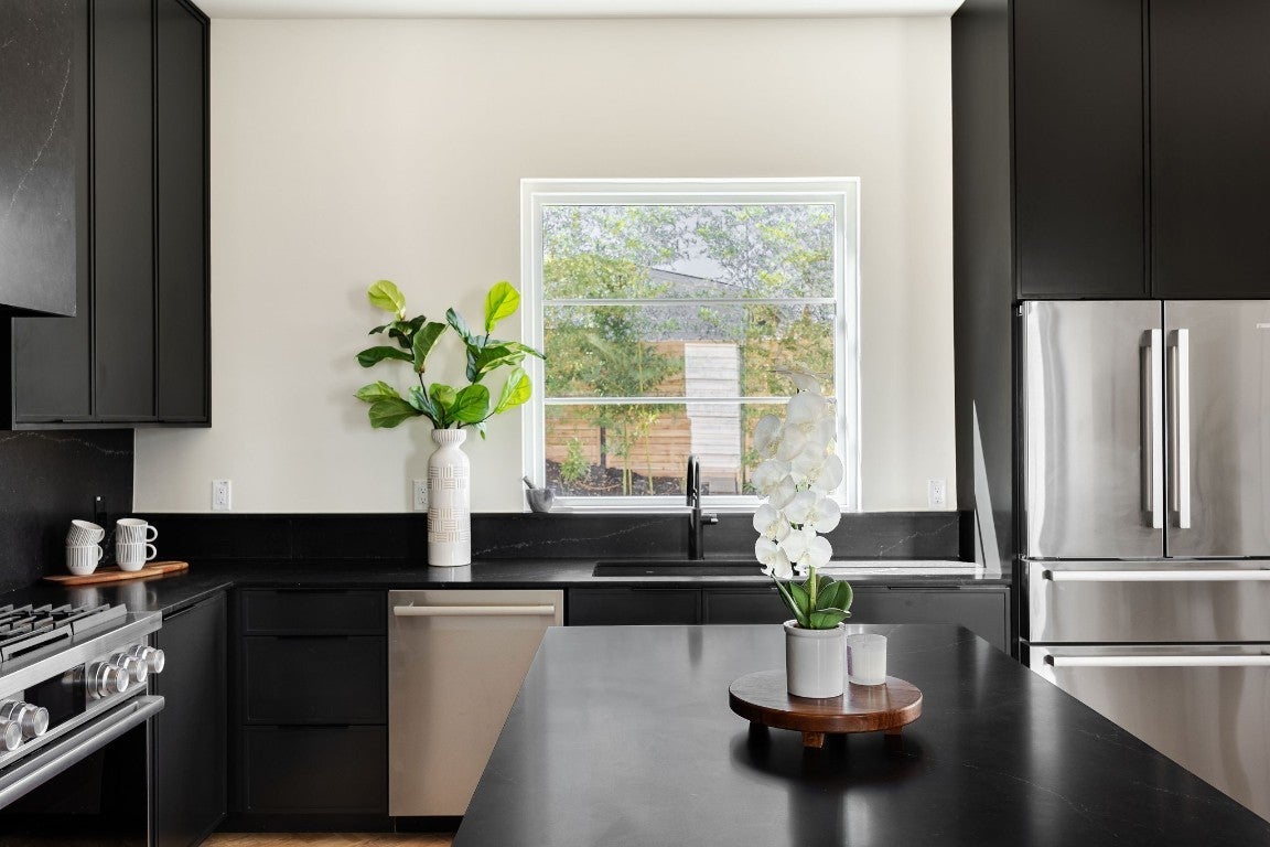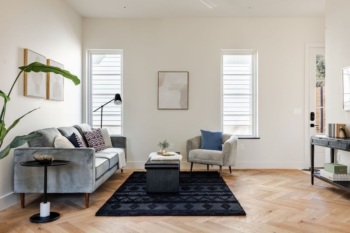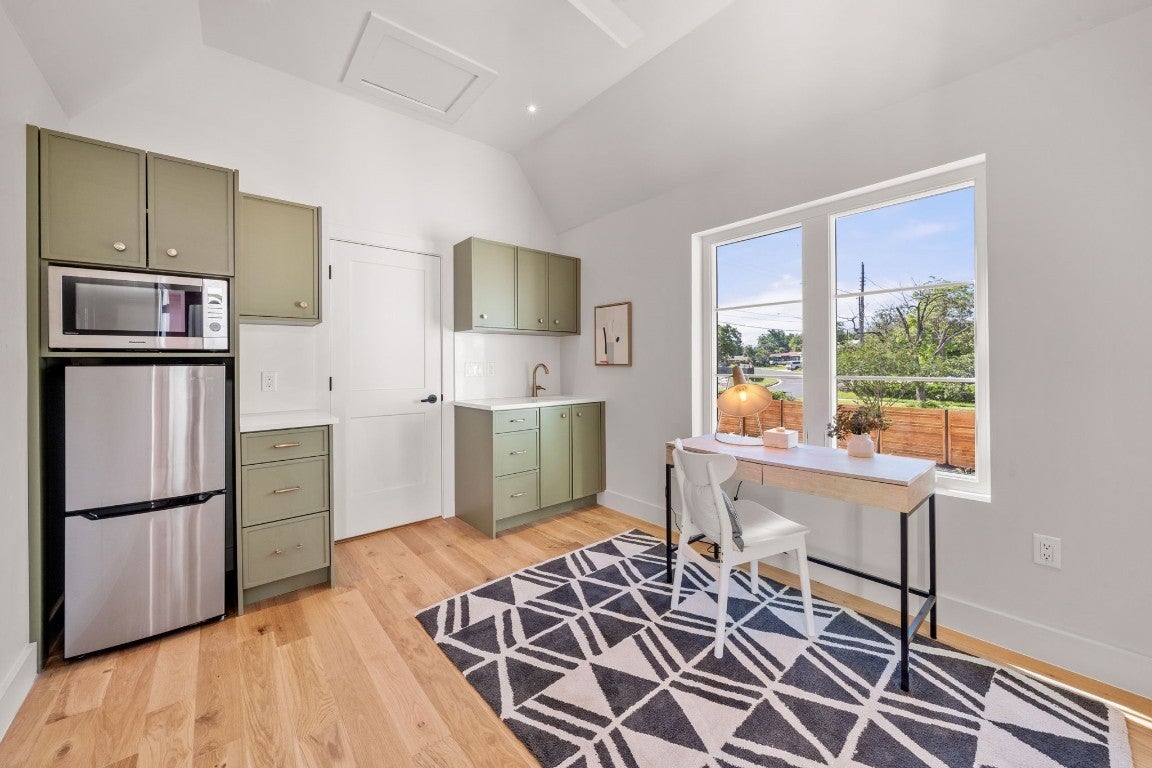 Stunning compound with 4 bedroom spaces and 4.5 total bathrooms with a detached 1bedroom/1bathroom studio with kitchenette perfect for office, guest, home gym! Arrive to the home quickly from the airport or downtown and enjoy the heart of East Austin and Mueller within 10 minutes drive! The main house features a magazine-perfect main floor with a bold dark color scheme and classically elegant herringbone white oak flooring. The Chef's kitchen has a gourmet package, copious use of beautiful quartz and tons of natural light pouring in through the southwest exposure Andersen windows and lovely 8 foot sliding door. The eat-in kitchen leads directly to a private and lush backyard. On the second floor, find two more bedrooms, one of which with an ensuite bathroom, and a second full bathroom. On the third floor you will find an additional flex space with a full private bathroom. This unit also has a detached one-car garage with a private guest suite/studio/flex space above that has another full bathroom, walk-in closet, and living area with kitchenette. The garages also include hookups for a secondary washer/dryer! The high quality construction of this home is evident throughout! Take note of the spray foam insulation, high quality millwork, Andersen casement-style windows, chic 2" dimmable recessed lighting and designer finishes throughout. Smart home features include already installed Nest doorbell and thermostats.