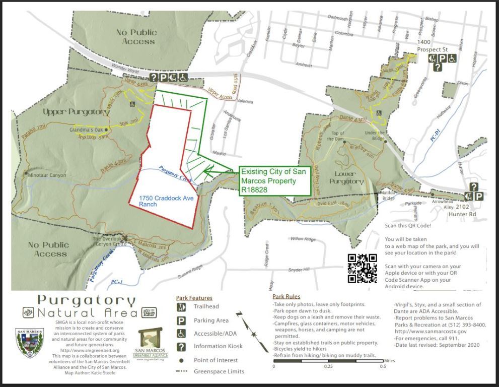57+ acre Legacy Ranch encircled by protected Greenbelt! Ideal for investment, custom home sites or preservation. Rare opportunity in the heart of San Marcos. 1750 Craddock Ranch offers a unique opportunity to own a piece of Central Texas Hill Country surrounded on ALL sides by Purgatory Creek Natural Area. This protected greenbelt is part of the larger San Marcos Greenbelt Alliance trail system and ensures the property will maintain its natural charm for years to come. Great drone footage of this beautiful Ranch on the virtual tour! Ag-exemption allow for exceptionally low taxes and low cost of ownership. Ranch features 2 homes (2bed/1bath each), multiple out-buildings, cattle shoots, fencing, and stock tank. The landscape features a combination of wide-open pastures, mature woodlands and wet-weather creeks. Civil Engineering report, environmental study, and recent ALTA survey are available in the documents section. A comprehensive Site Investigation Report by Mahoney Engineering outlines the feasibility of development. Development density is limited by the lack of street frontage, seasonal creek that bisects the property, recharge zone and low-intensity FD zoning classification. The property lies within the full-purpose jurisdiction of the City of San Marcos. Mahoney Engineering Development Proposal is in Documents. Long-term development potential would require significant investment into infrastructure and the entitlement processes. As such, this property is best suited for buyers looking to preserve natural beauty, invest in a long-term land-hold, and/or create a one-of-a-kind private homesteads that are encircled by protected Greenbelt. Secondary address is 1661 Valencia Way. Access is via private easement through park. Property has 2 long-term tenants to cover taxes and ranch management. Contact listing agent with questions or to schedule a showing. (HCAD PIDs R18829 / R85397). Also listed as MLS 3510293.