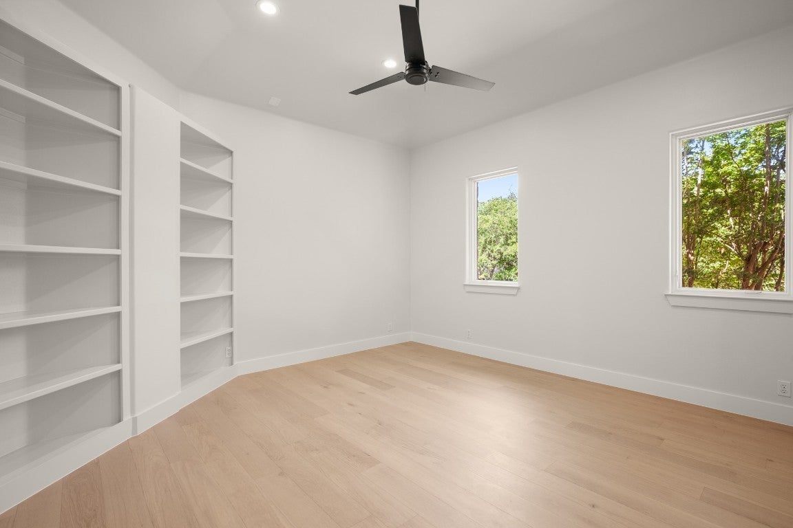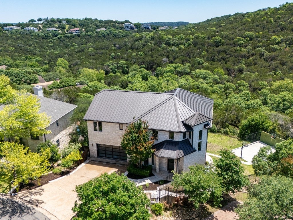 Completely remodeled 5 bedroom, 5.5 Bath family home with giant office, pool and sport court. Open the modern front door and immeadiately view the greenbelt through walls of glass on the rear of the house. Located at the end of a cul-de-sac on one of the few level streets in Davenport which creates a community where the neighbors and kids actually know each other and play together like the old days. The huge primary suite has a sitting area and two huge custom closets, designer master bath complete with views for miles, walk-in shower and soaking tub. Kids and parents will want to explore the loft by enetring above the bunk bed and up the ladder, make sure to look out the trapezoid windows for an amazing view North. The kitchen has a waterfall counter with a giant table area surrounded by glass, a breakfast bar and new range. All 5 bedrooms have remodeled ensuite baths and the two at the end of the hall have a fun loft that connects them. Great for enertaining, 2 wet bars, multiple covered porches and a large lower patio bring outdoor living in through the wide sliding doors. Children's paradise in the large fenced back yard with room for a playscape and a bouncy wall on the sport court to practice pickleball, tennis, lacrosse or soccer along with two basketball hoops. All new Pella windows and metal roof in 2018, Kingwood cabinets in many areas, oversize garage can fit 2 large SUV's, a golf cart and toys. The HOA offers a private park with tennis courts and walking trails and neighborhhod security. Easy access to Austin Country Club, Lake Austin, Shops at Davenport Ranch and downtown. 5468 SF Per Floorplan Graphics calculation using ANSI Z765-2021.
