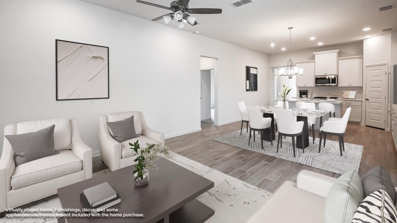 READY FOR MOVE-IN! Entry leads to open family room, dining area and kitchen. Large windows and 10-foot ceilings throughout. Kitchen features generous counter space, corner walk-in pantry and large island with built-in seating space. Primary suite includes bedroom with 10-foot ceiling. Double doors lead to primary bath with dual vanities, garden tub, glass-enclosed shower and walk-in closet. Covered backyard patio. Mud room with adjoining closet is just off two-car garage.
