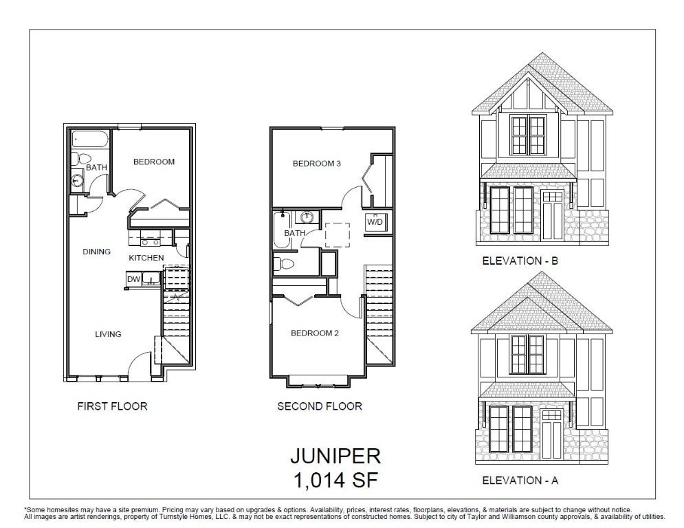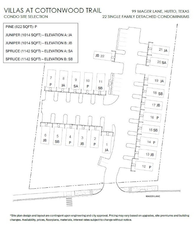 22 homes available from $229,900 to $279,900! The Juniper is a modern 3 bed, 2 bath stand-alone condo in The Villas at Cottonwood Trail—a boutique 22-home community in Hutto, TX. Priced from $249,900, this thoughtfully designed floor plan features a bright, open living, kitchen, and dining area with large windows that bring in abundant natural light. A main-floor bedroom with ensuite bath is privately located near the downstairs washroom. Upstairs includes two spacious bedrooms with large closets, a full bath, and a flexible loft space—ideal for a home office, playroom, or media area. Washer/dryer connections are conveniently located near the upstairs bath. Each home includes a private fenced yard, dedicated parking, and low-maintenance native landscaping. Enjoy access to miles of hike & bike trails, Fritz Park, playgrounds, splash pads, and more. Located minutes from Austin, Tesla, Samsung, and major highways, this is a rare opportunity to own new construction under $300K in a high-growth area. The Juniper offers a clean, modern layout with natural light, privacy, and value. Site premiums may apply. Buyer to verify all information.