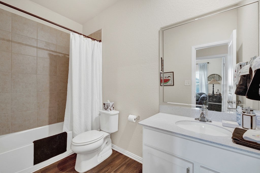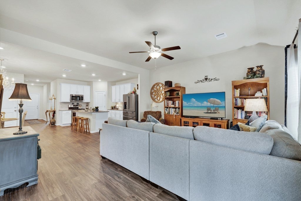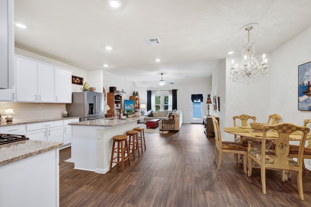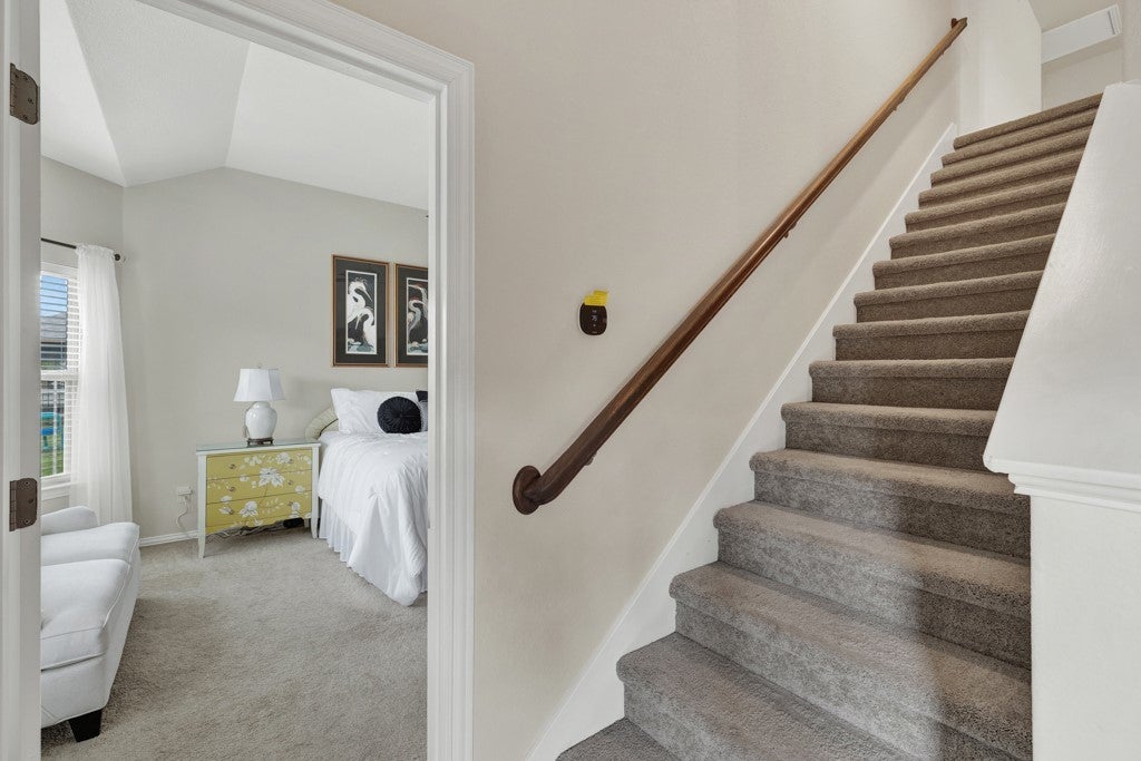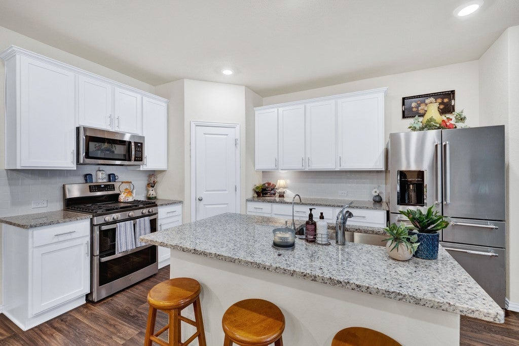 Discover your dream home at 1444 Harwell Loop, nestled in the heart of Kyle, Texas, within the securely gated community of the Peninsula. This pristine single-family residence, built in 2020, is perfect for families, golf enthusiasts, and those seeking a tranquil retirement. Boasting 5 spacious bedrooms and 3 elegant bathrooms, this home caters to both comfort and style. The interior is adorned with wood-grain flooring, plush carpet and tile. The kitchen, features lustrous granite countertops, a suite of stainless steel appliances including a free-standing gas range, microwave, dishwasher, and timeless white shaker cabinets. A large pantry and separate laundry room add to the home's functionality. Relax in the master suite, located on the main floor for easy access, complete with a walk-in closet, double vanity, and expansive shower. For added convenience, there is one secondary bedroom and one full secondary bathroom also found on the first level off the entry foyer. Upstairs, you'll find three bedrooms, a full bathroom, and a versatile flex space — ideal for a growing family or hosting guests. Relax on your own covered back patio in this quiet, secure community. Residents of this gated community in the Peninsula enjoy amenities such as walking paths, a dog park, a clubhouse, and a picturesque golf course. Embrace the serene lifestyle while still being a short drive from the bustling cities of Austin and San Antonio. Proximity to Austin Bergstrom International Airport ensures travel is a breeze. At 1444 Harwell Loop, luxury meets location in the most harmonious way.